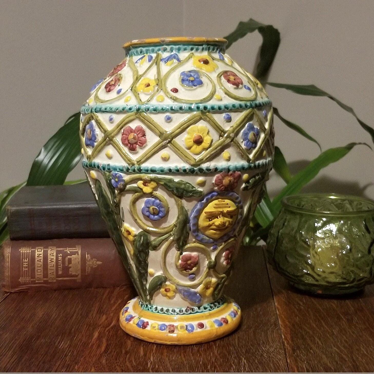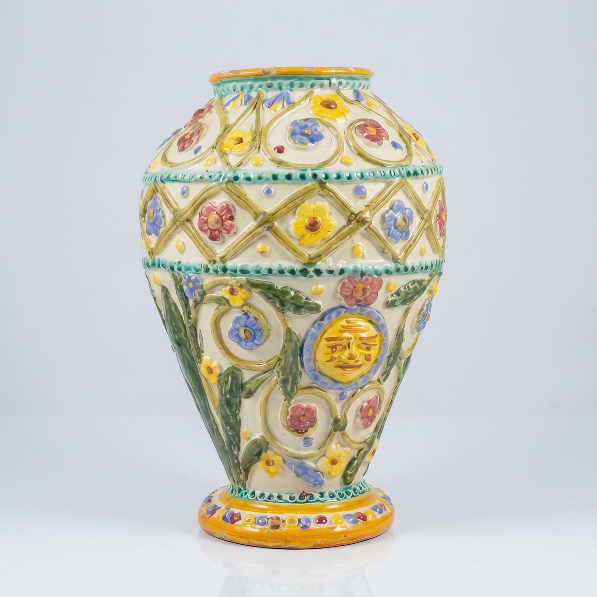 A hand painted Italian majolica vase crafted with raised floral motifs, geometric borders, and a richly glazed palette inspired by mid century Mediterranean design. The applied relief work and sculptural surface highlight the colourful artistic traditions of regional Italian pottery studios.