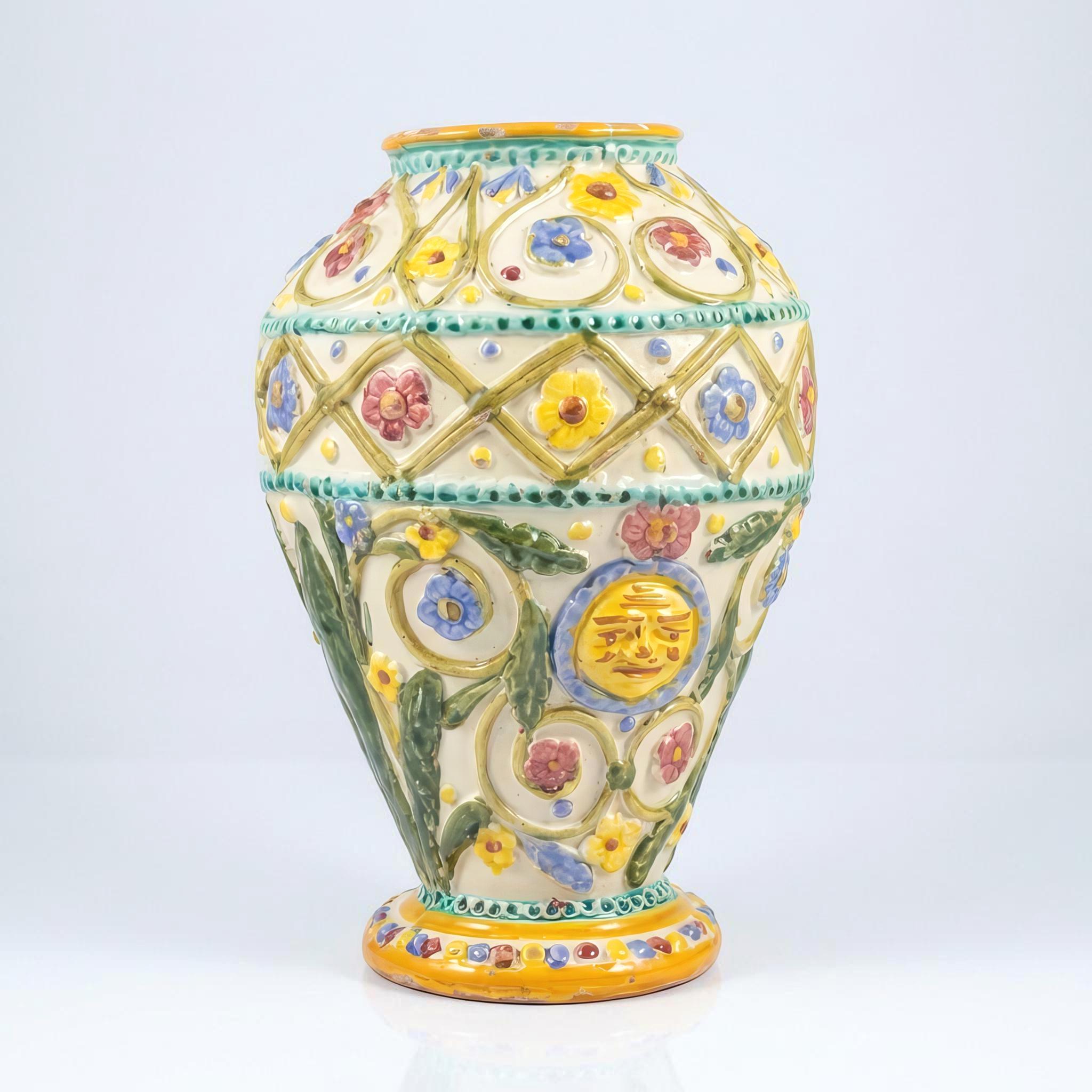 A hand painted Italian majolica vase featuring raised floral motifs, geometric borders, and a richly glazed palette inspired by mid century Mediterranean design. The sculptural relief and vibrant colours create a lively, textured surface. Perfect as a tall statement piece on a console, shelf, or dining table, it adds height, colour, and character to any styled interior.