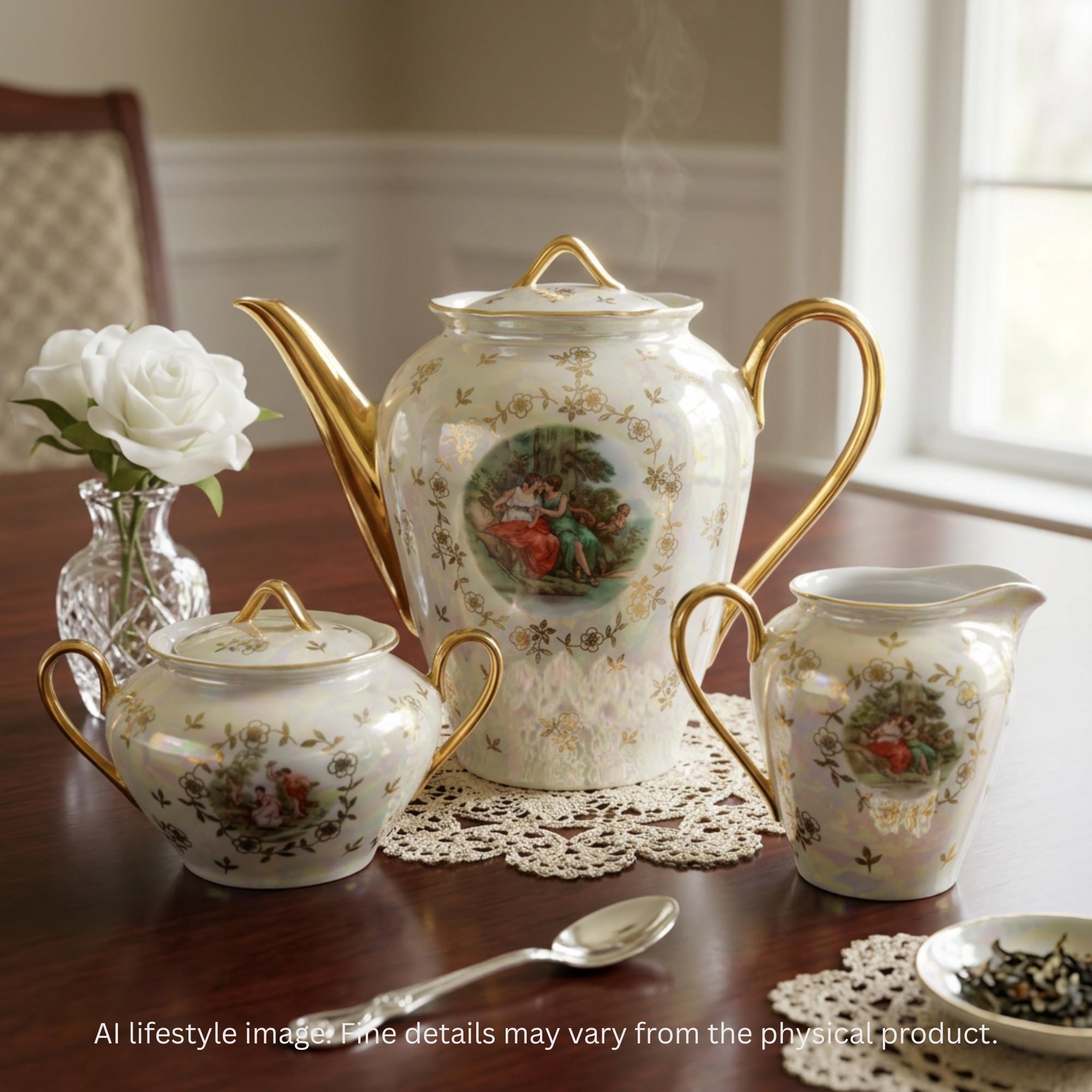 A vintage Fisher China Germany Fragonard Love Story coffee set including teapot, creamer, and sugar bowl in pearl lusterware porcelain. Rococo scenes and gold accents create an elegant tabletop display or serving set.