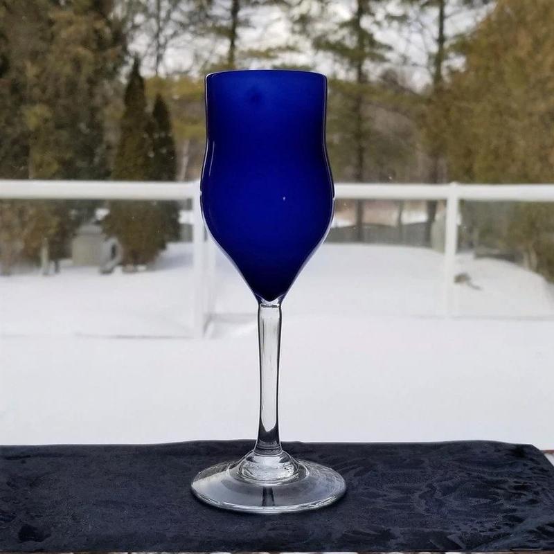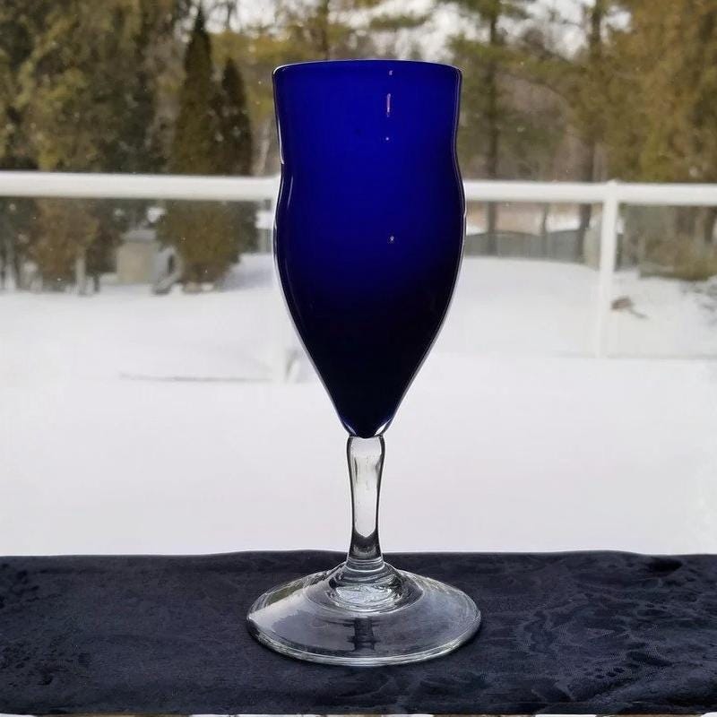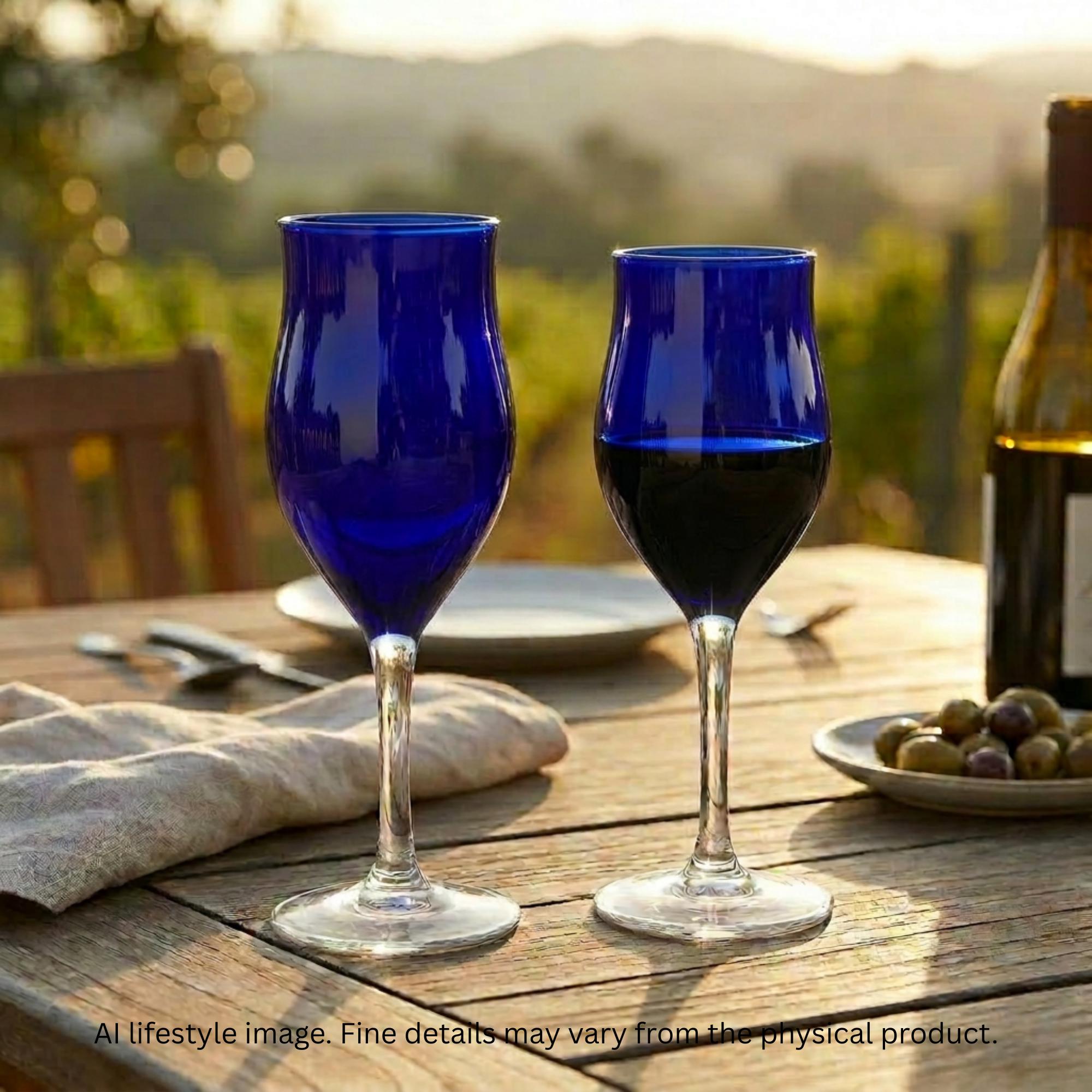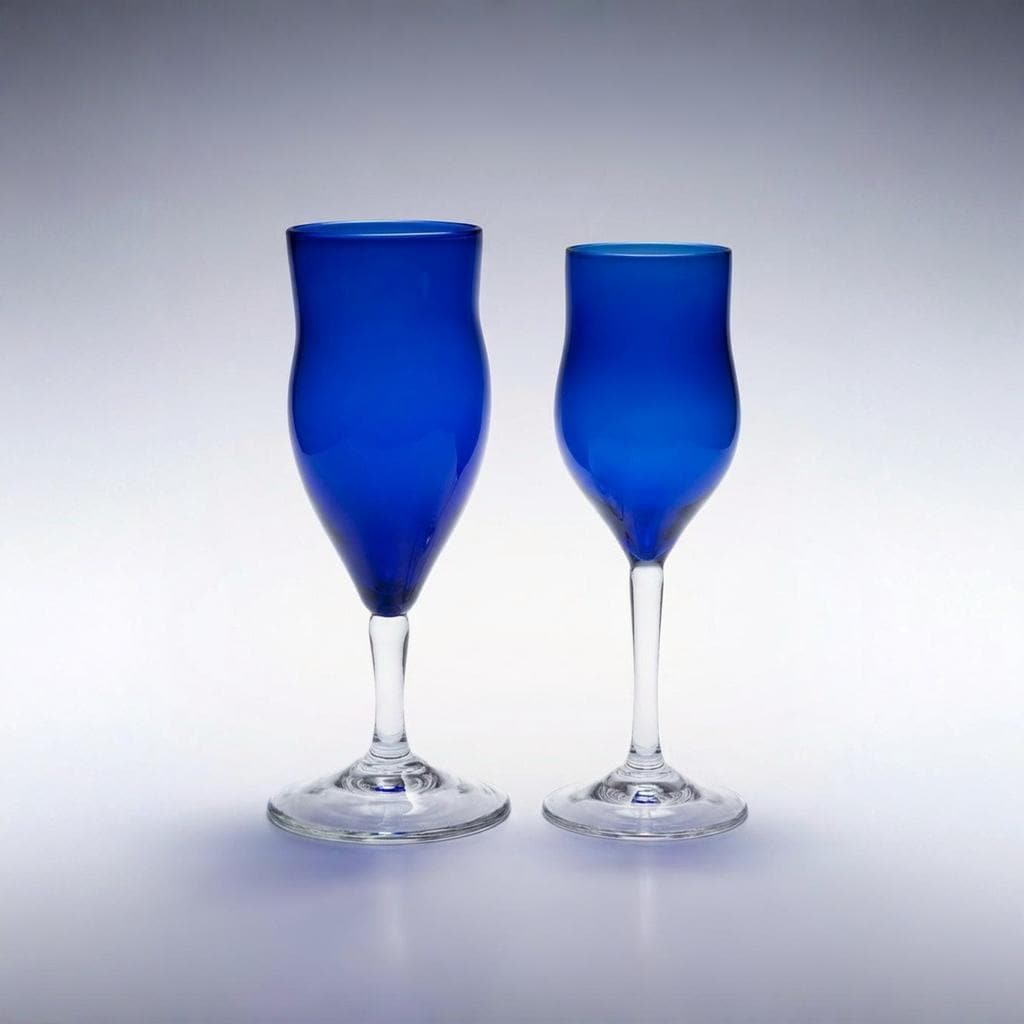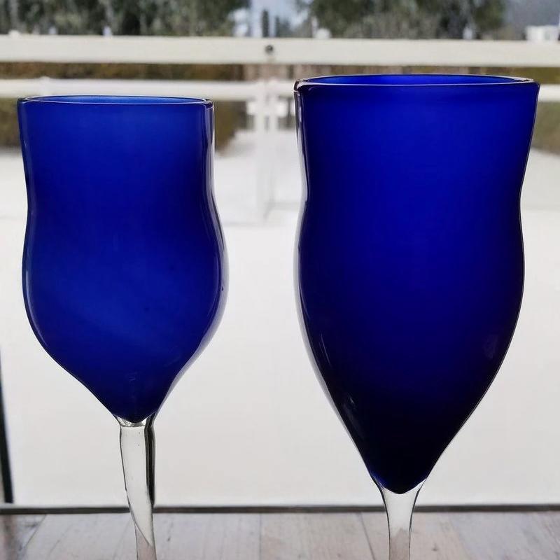 A pair of handblown cobalt blue studio art glass goblets with saturated colour and sculptural elegance. Style them in a curated bar setting or display as modern statement pieces.
