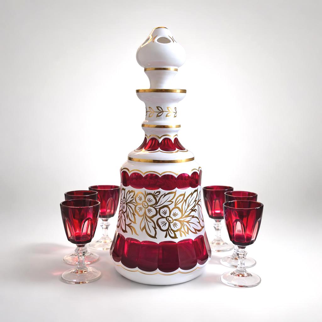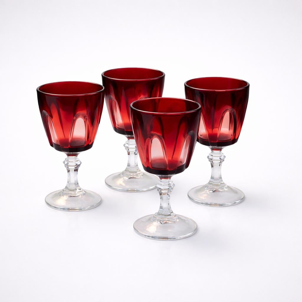 A set of four vintage ruby red cordial glasses designed to bring depth and elegance to aperitif service or bar display. Made in France by Cristal D’Arques, these Ruby Gothic glasses feature bold faceted cuts that reflect light beautifully, highlighting the rich ruby hue and refined mid-20th-century French crystal design.