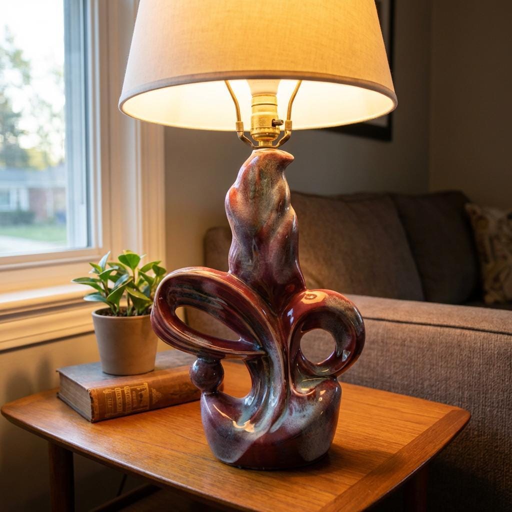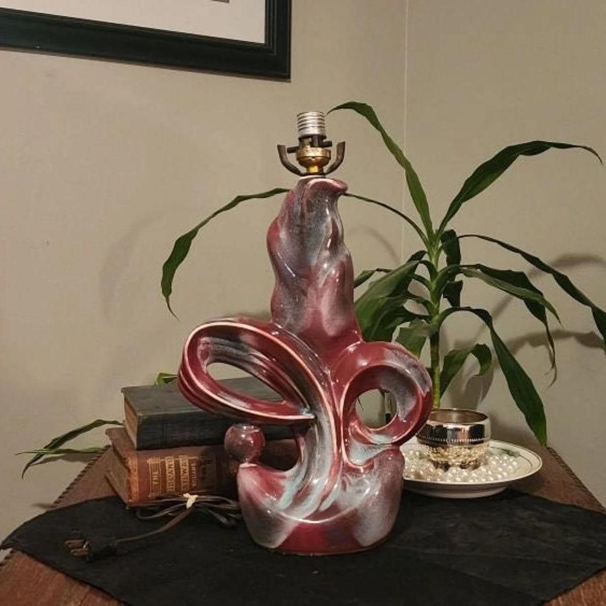 A sculptural vintage ceramic table lamp base with an expressive abstract form, finished in layered red and grey glaze. The fluid contours and bold silhouette add mid century character to living rooms, reading nooks, or curated studio style interiors. Lamp shade not included; harp, socket, and wiring require replacement prior to use.