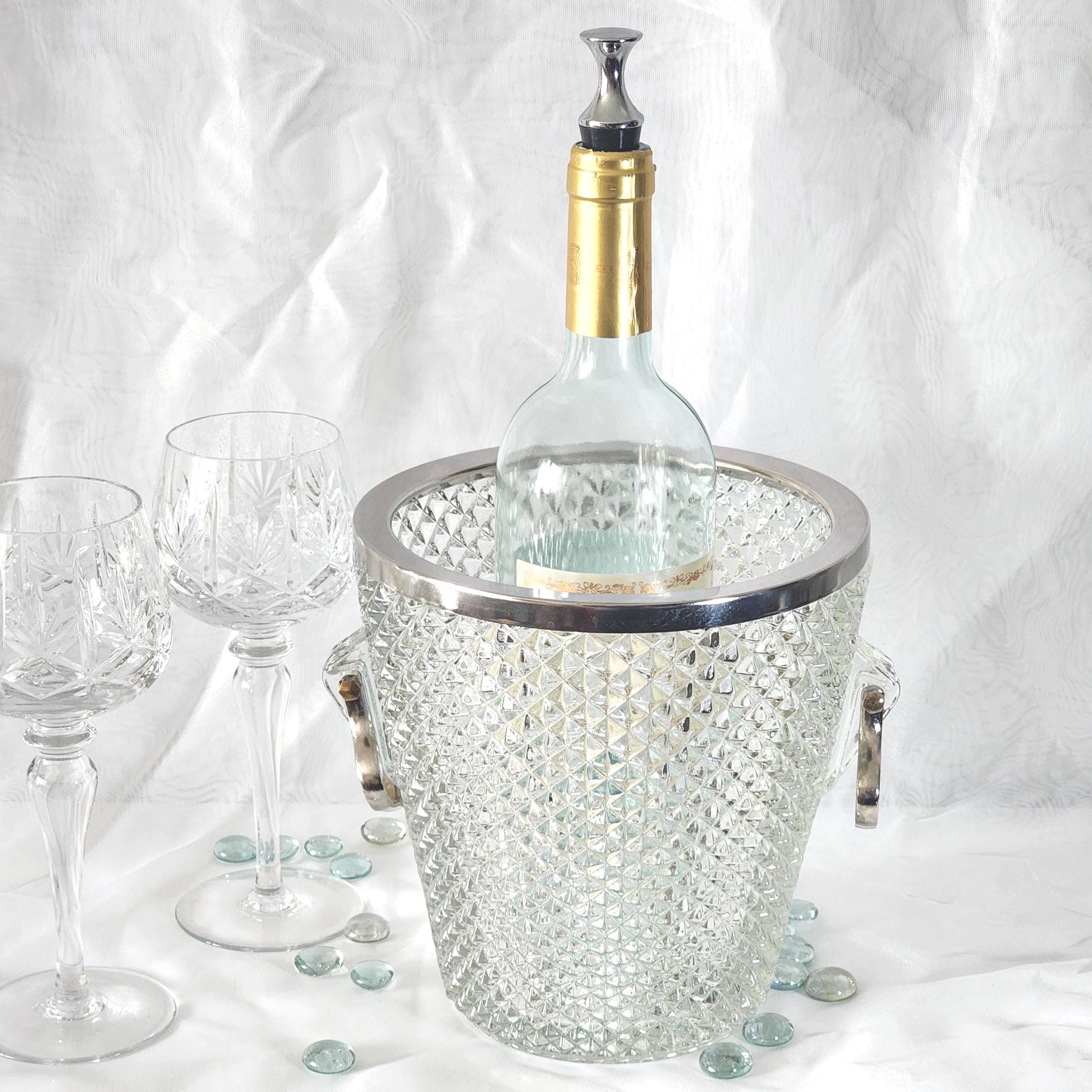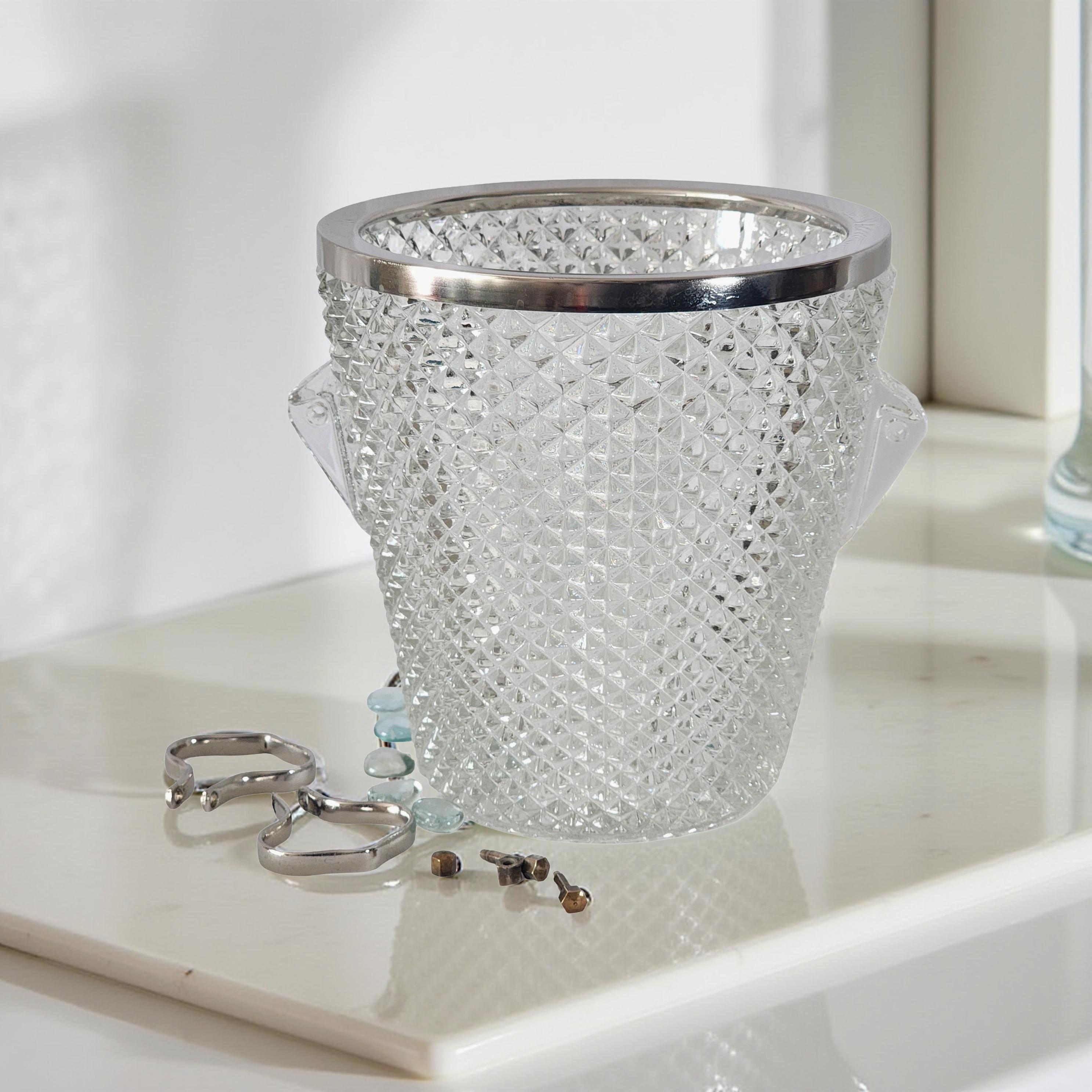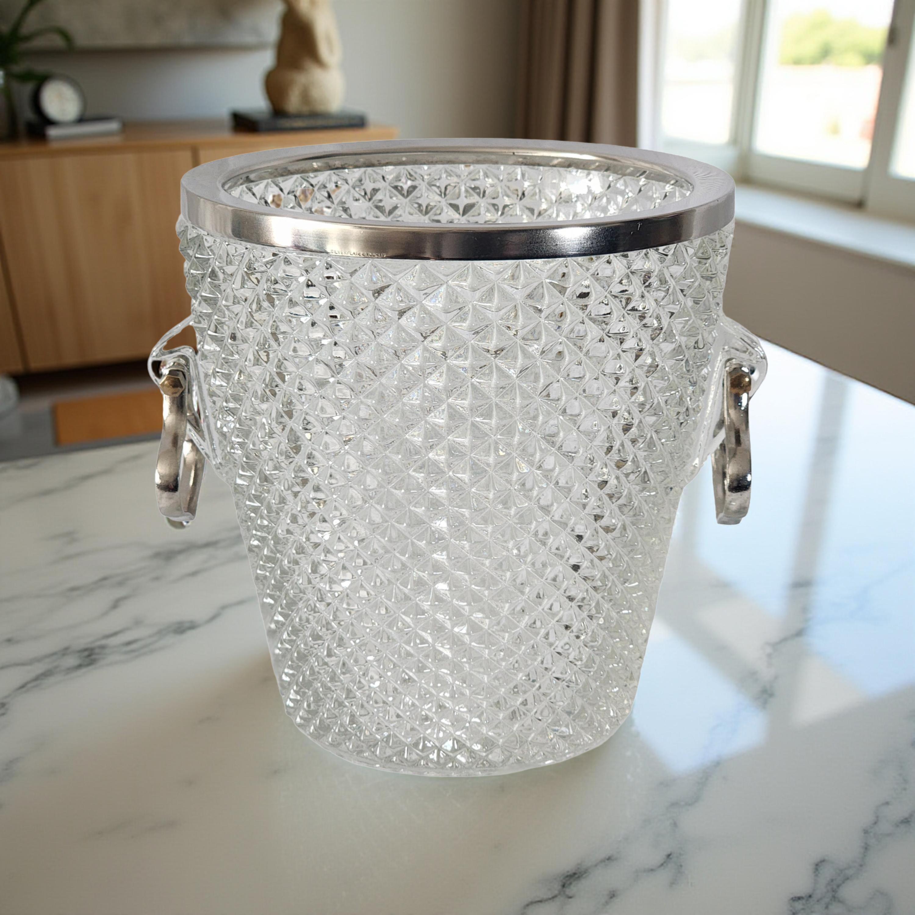 A substantial pressed lead crystal ice bucket with a hobnail and diamond point design and silver plate handles and rim. The brass mounted handle fittings and geometric crystal patterning create a refined and functional piece suitable for both entertaining and display.