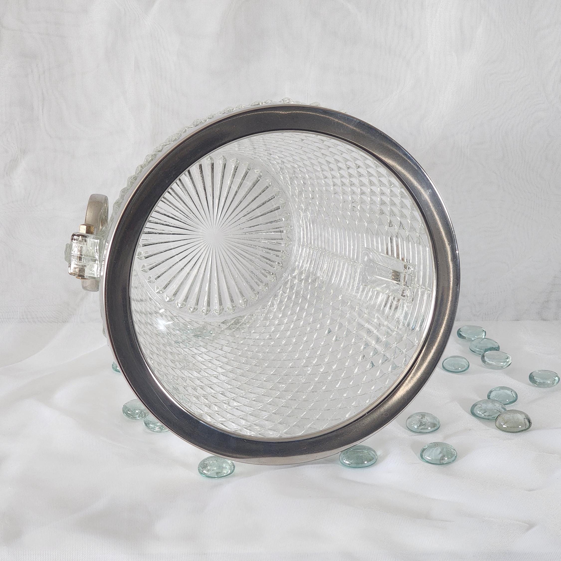 A heavy mid century lead crystal ice bucket with bright silver plate accents that serves beautifully on a bar cart, drinks table or dining room setting.