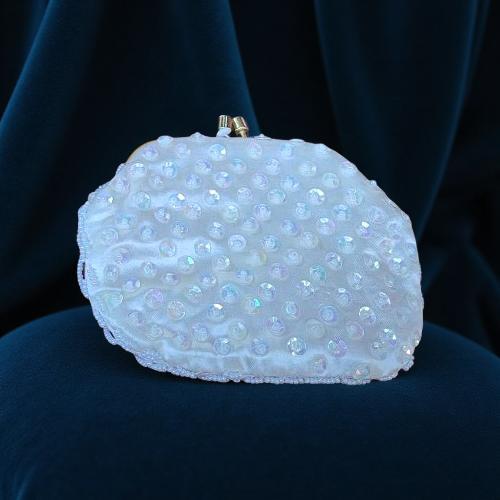 A vintage set of two evening bags, one labelled Simpson’s and made in Hong Kong with intricate raised white floral beadwork and a gold tone handle, and a second unlabeled satin evening purse adorned with iridescent circular sequins.