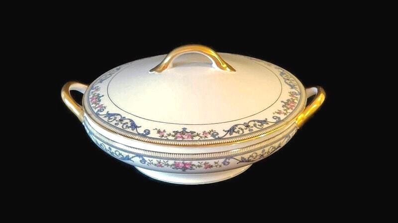 A fine porcelain lidded serving dish in Noritake's Chanlake pattern featuring a graceful border of blue scrolls and pink floral garlands encircling a pure white ground with gold handles. Originally introduced in 1921, this mid-century example dates from circa 1949–1953, as confirmed by the M-in-wreath “Noritake Japan” backstamp used during that period.