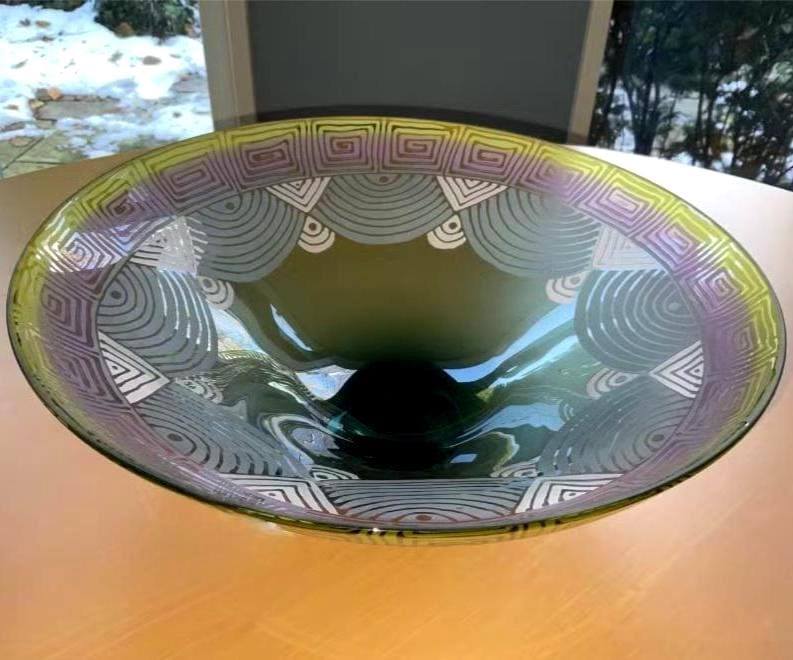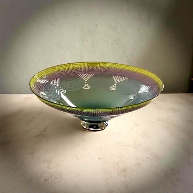 A vintage signed studio art glass centerpiece bowl by Cheryl Takacs, hand blown in vivid blends of green, blue, purple, and yellow. The wide bowl displays intricate geometric motifs sandblasted around the rim, creating a dramatic Deco inspired effect that enhances its sculptural elegance.