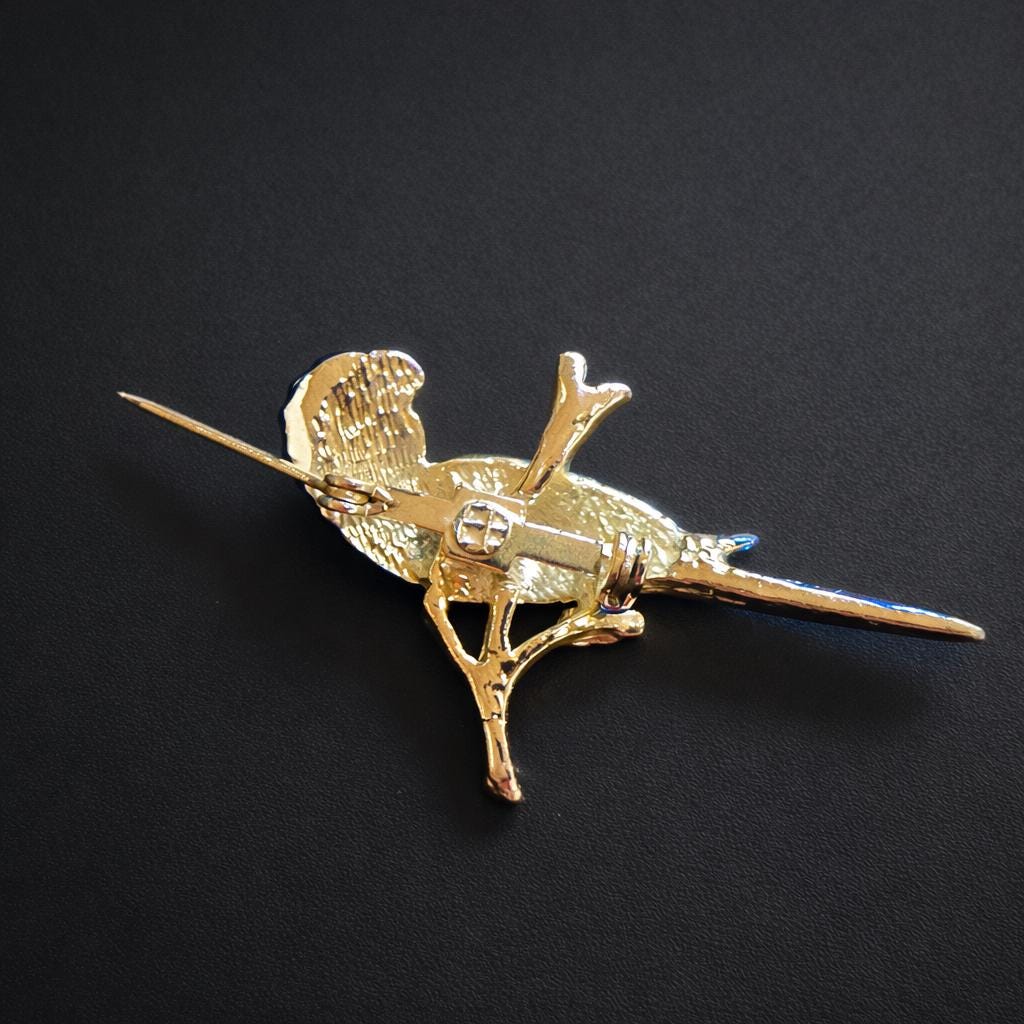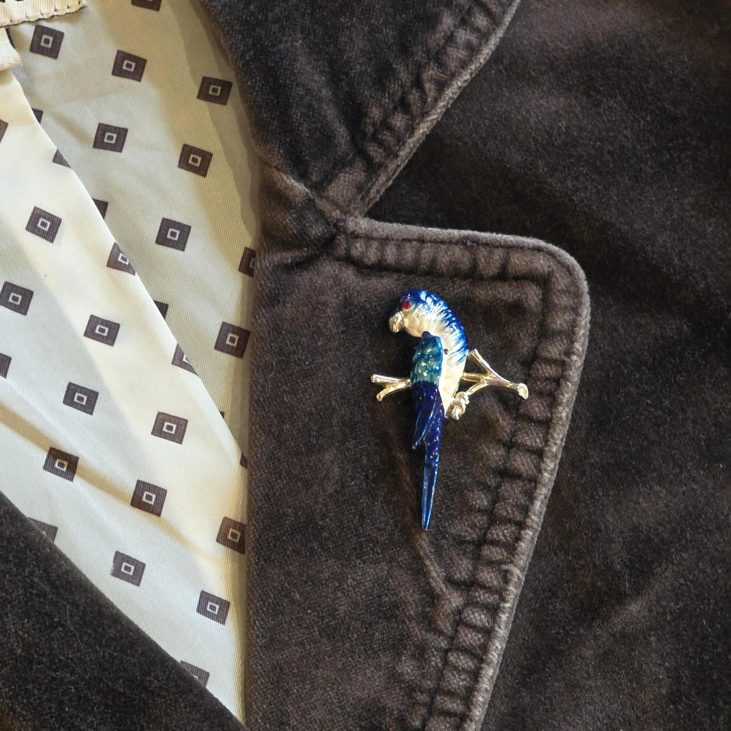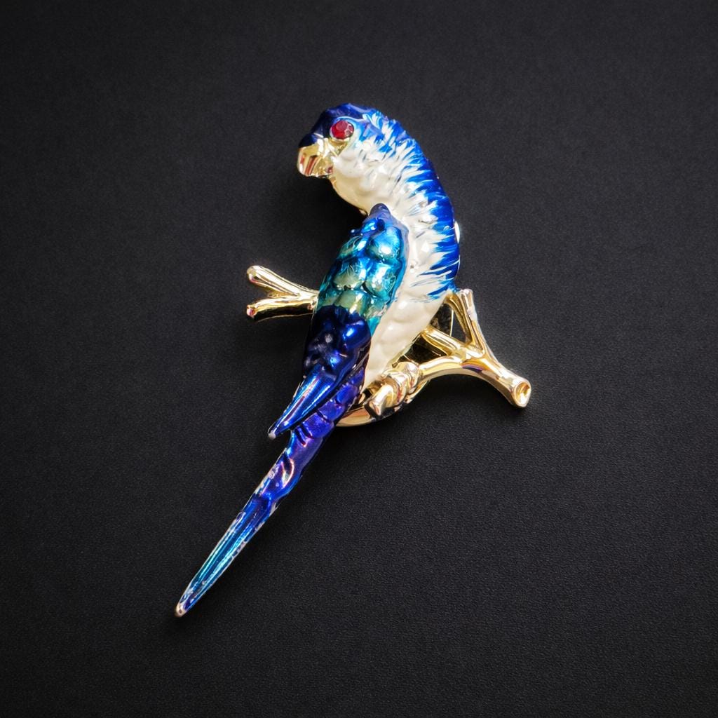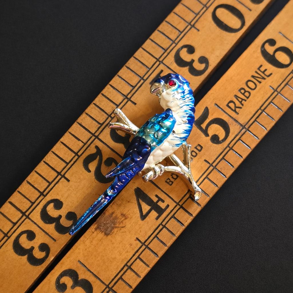Figural animal brooches were popular in the mid to late 20th century, prized for their whimsical charm and expressive use of colour, as reflected in this lively parrot design.