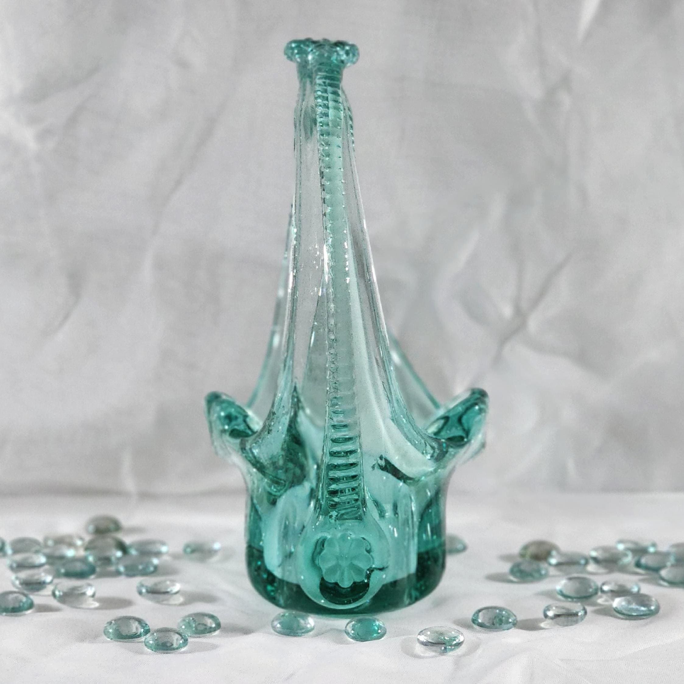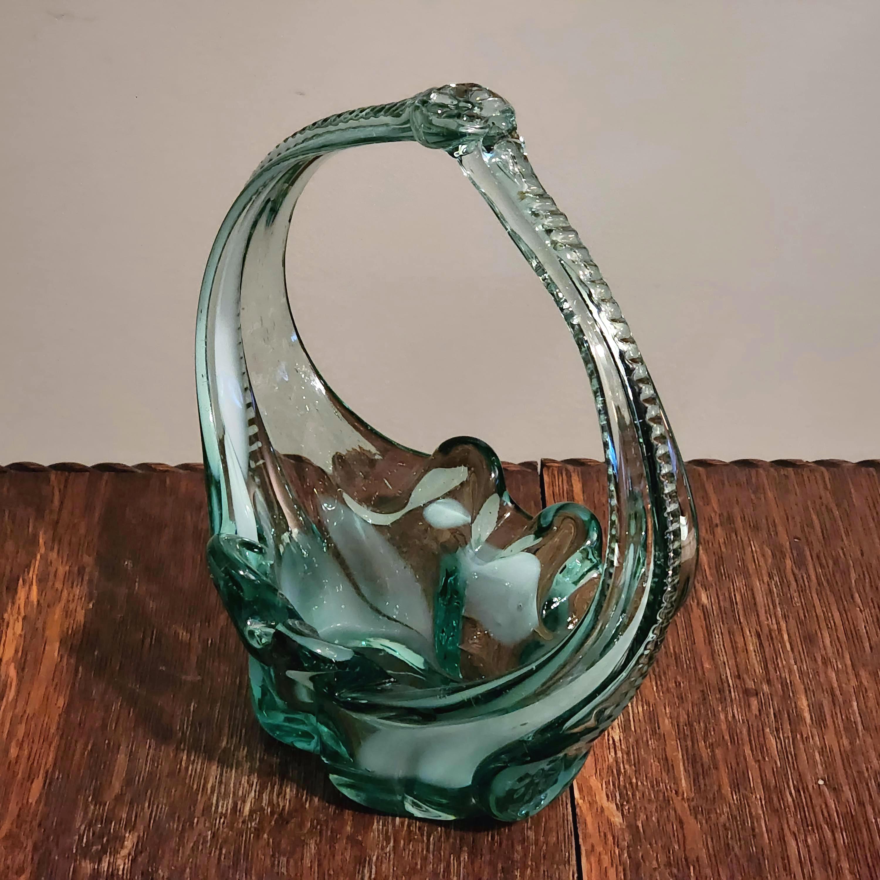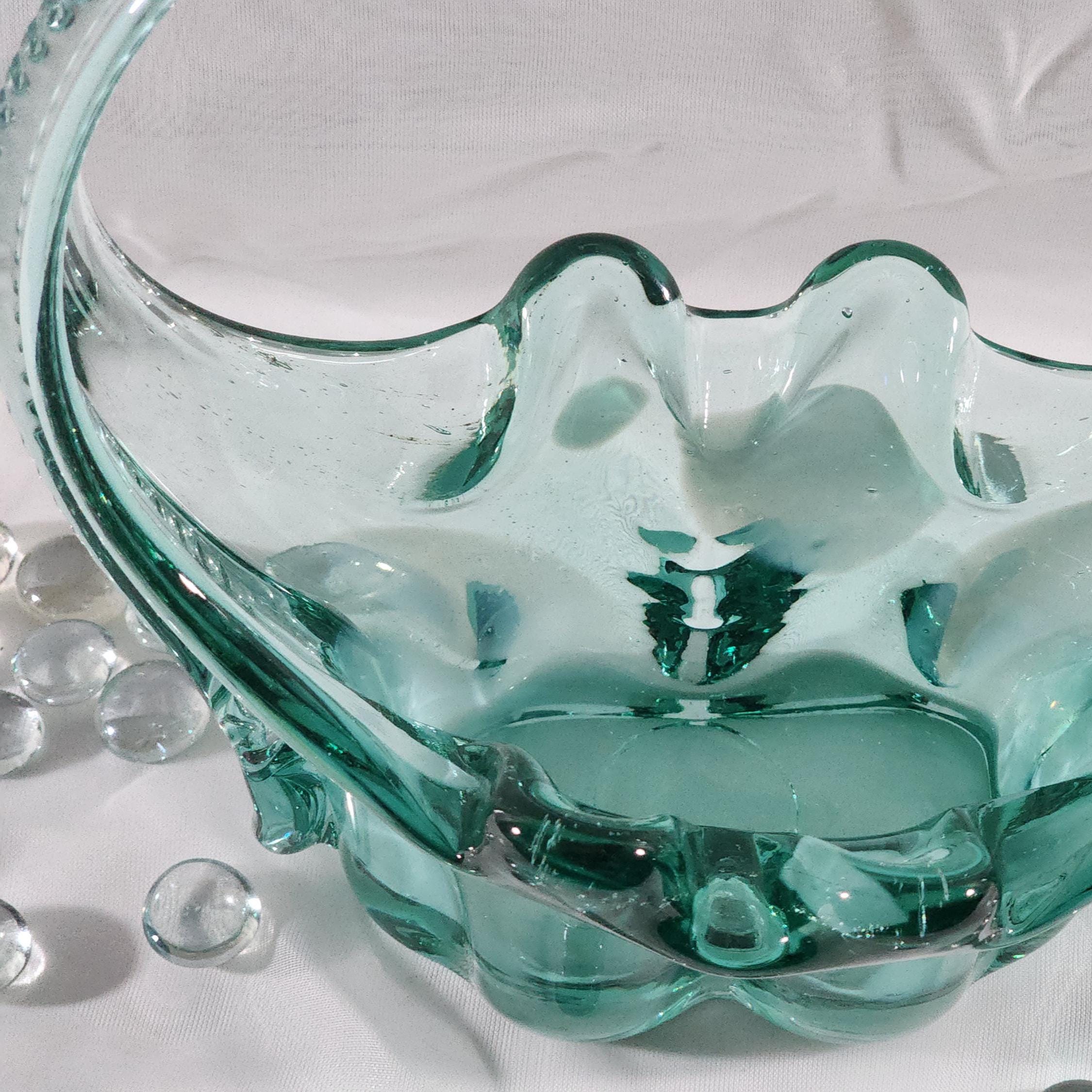A vintage handmade teal green art glass basket showcasing a graceful free form silhouette and fluid contours. The arched handle rises naturally from the bowl and is accented with a delicate applied rosette, creating a refined decorative focal point.