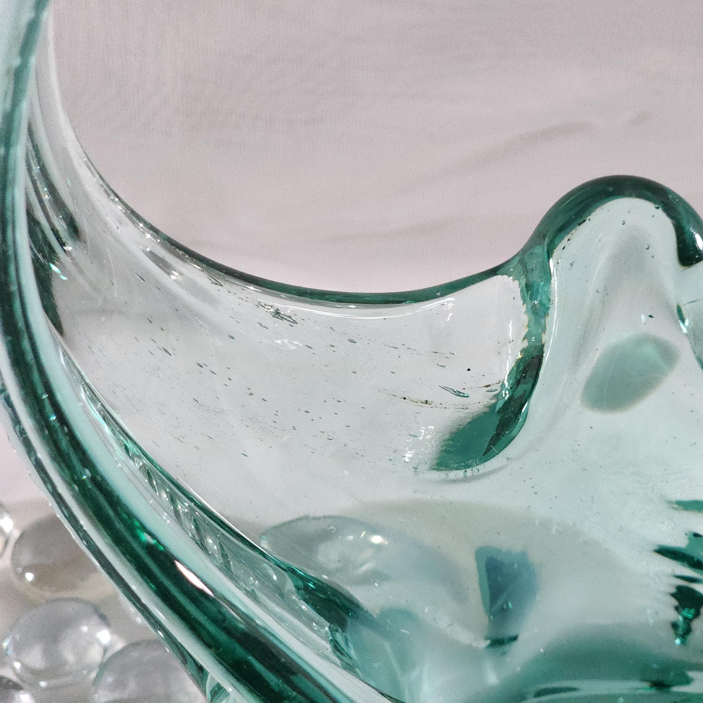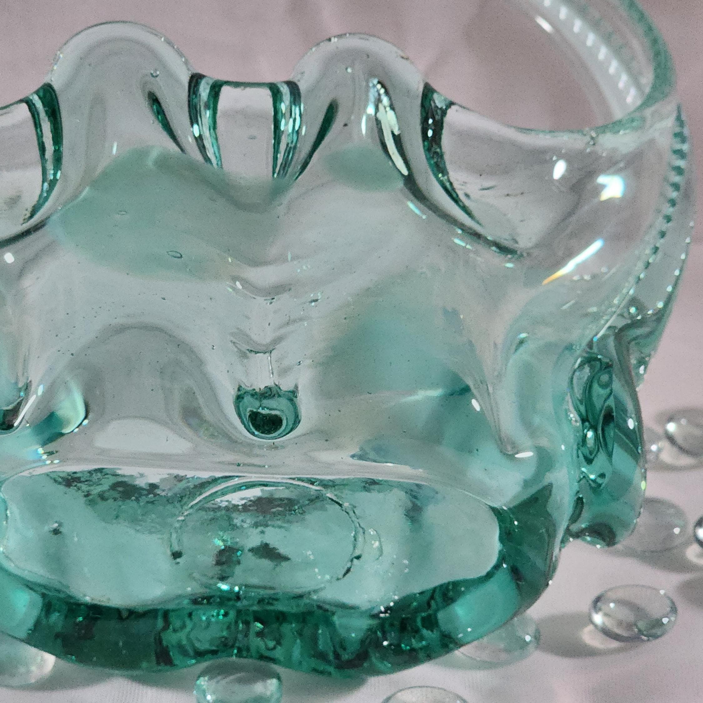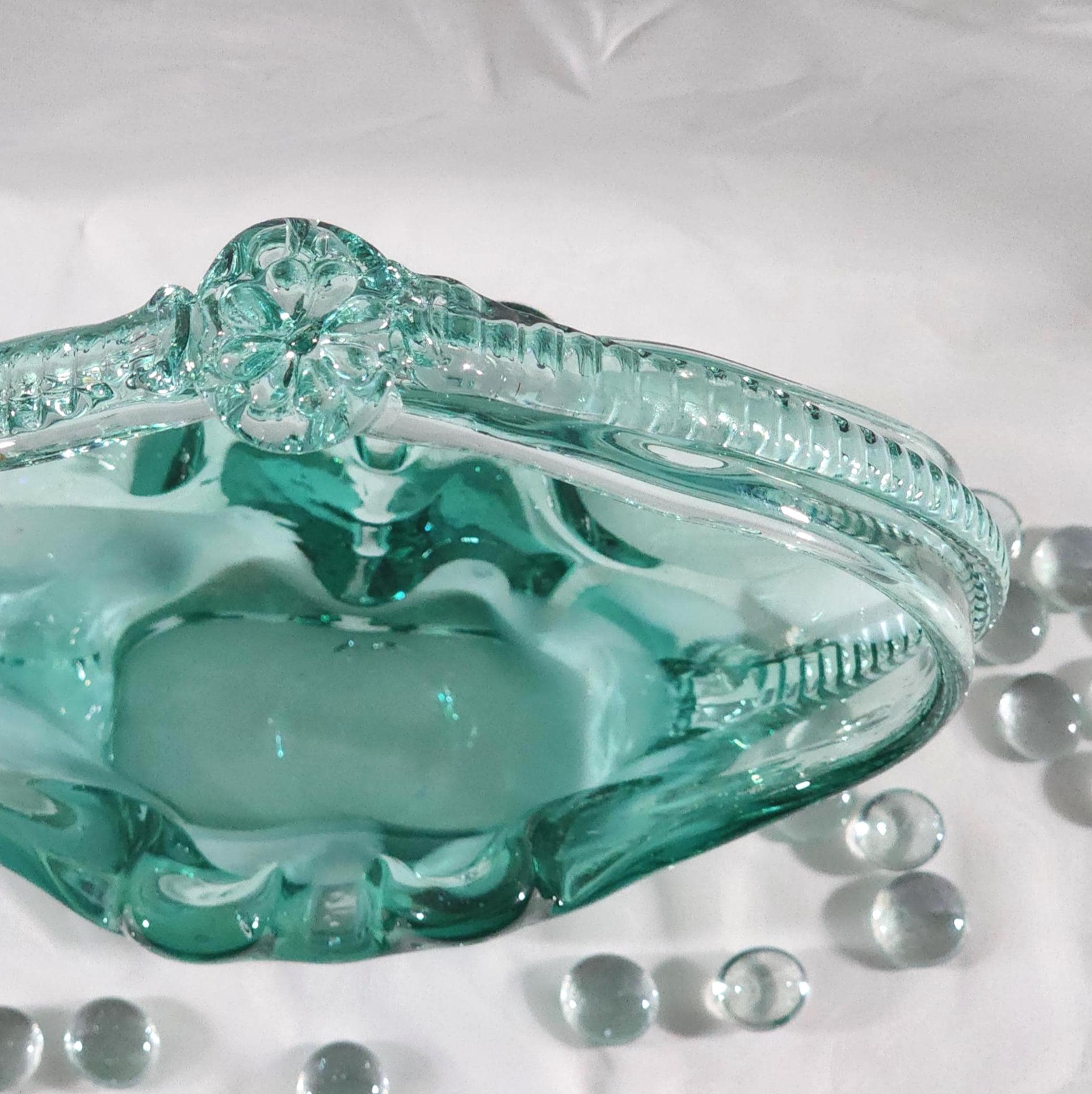 A vintage handmade teal green art glass basket showcasing a graceful free form silhouette and fluid contours. The arched handle rises naturally from the bowl and is accented with a delicate applied rosette, creating a refined decorative focal point.