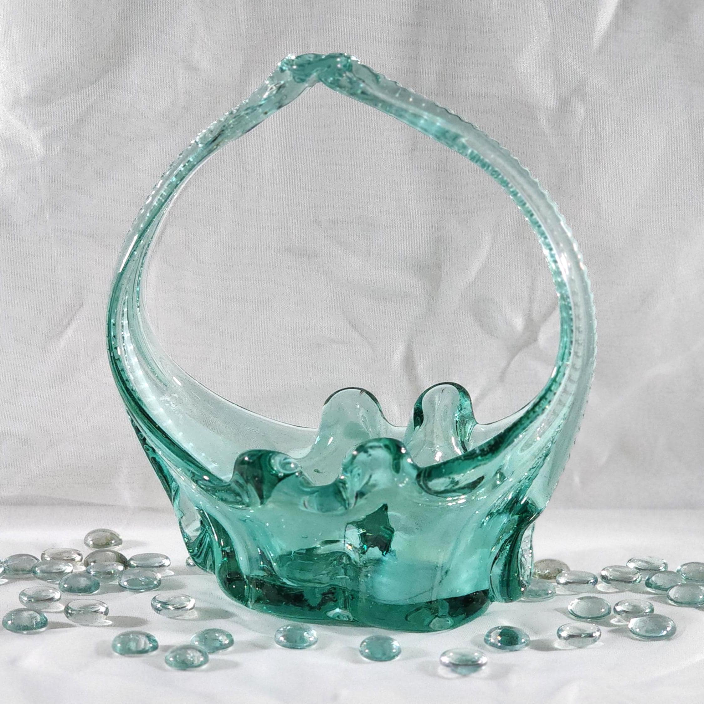 Hand Blown Teal Art Glass Basket – Large Vintage Sculptural Centerpiece Gift Decor