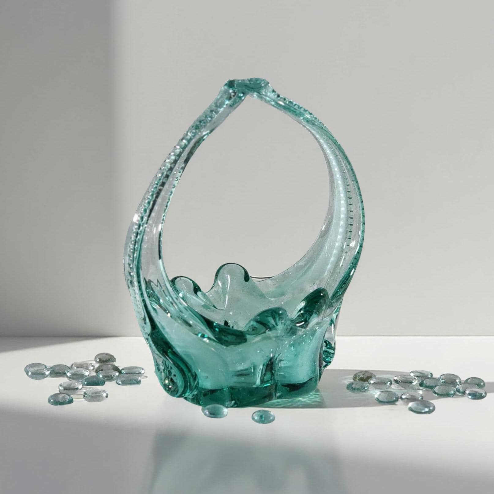 A sculptural teal art glass basket adding organic form, colour, and handmade artistry to shelves, consoles, and centrepieces.