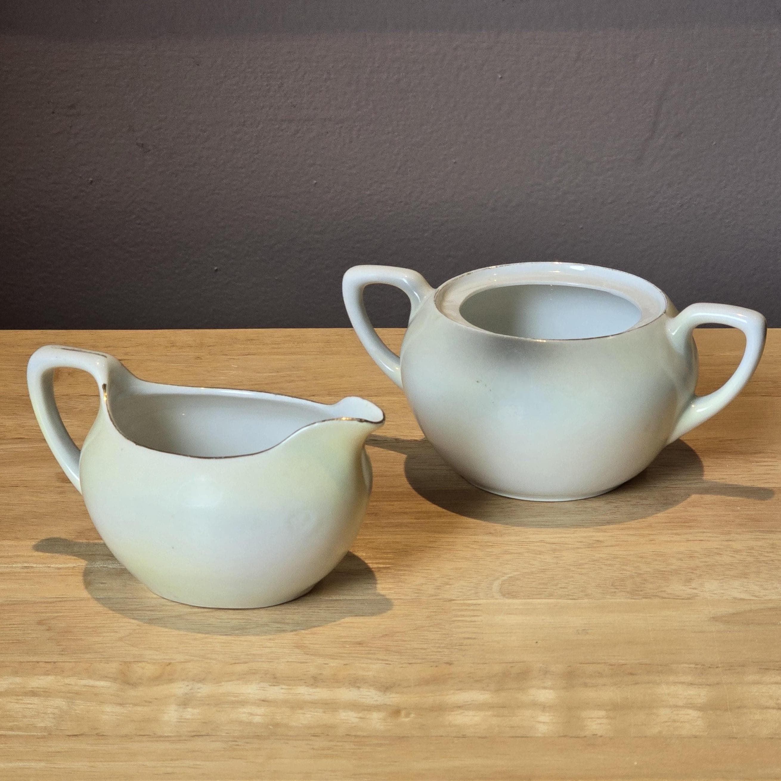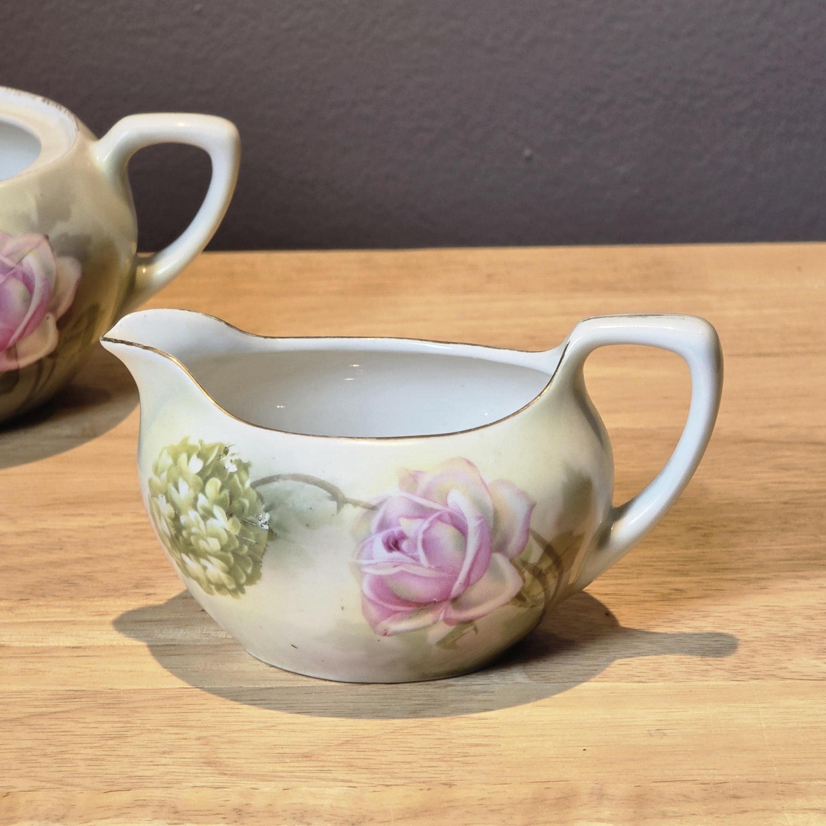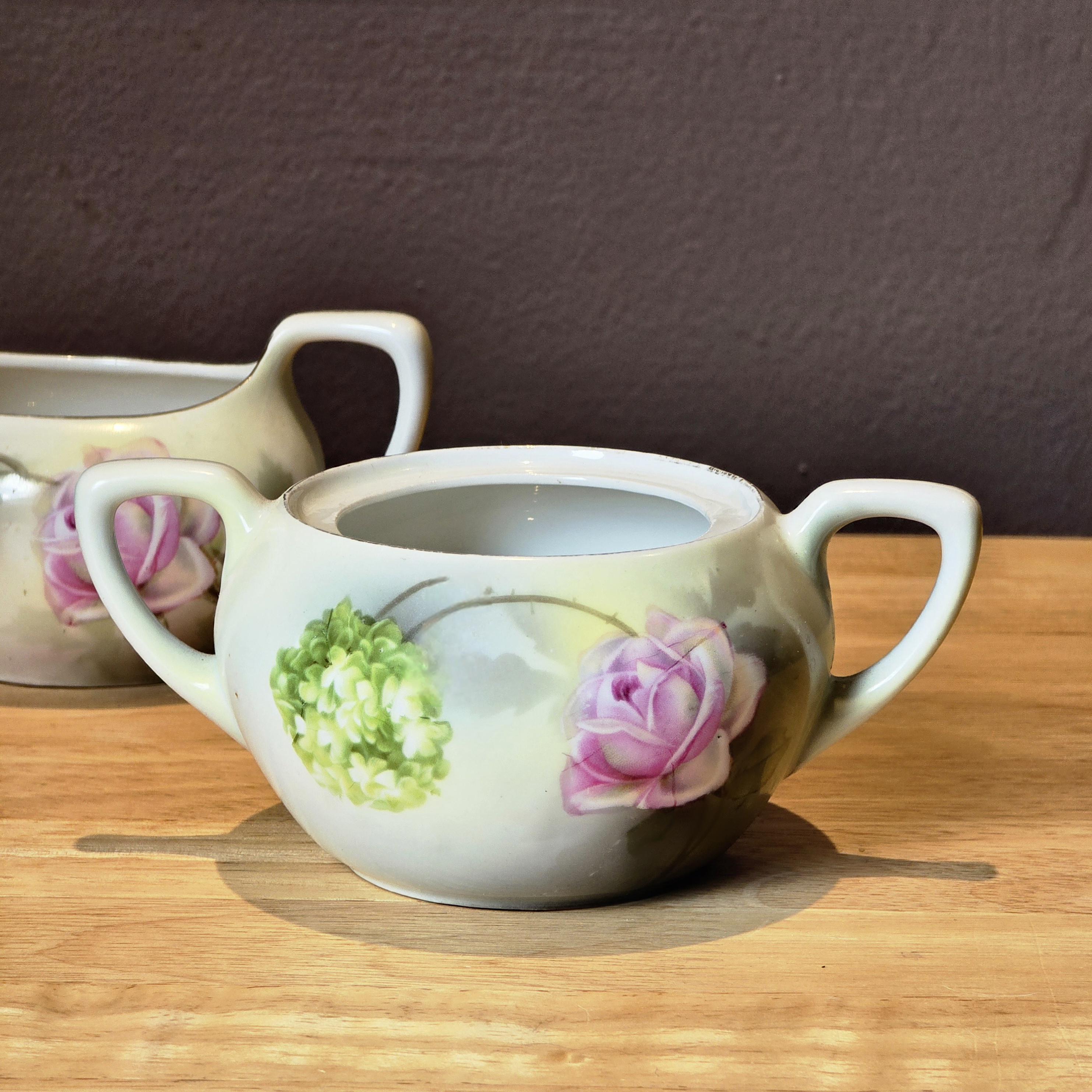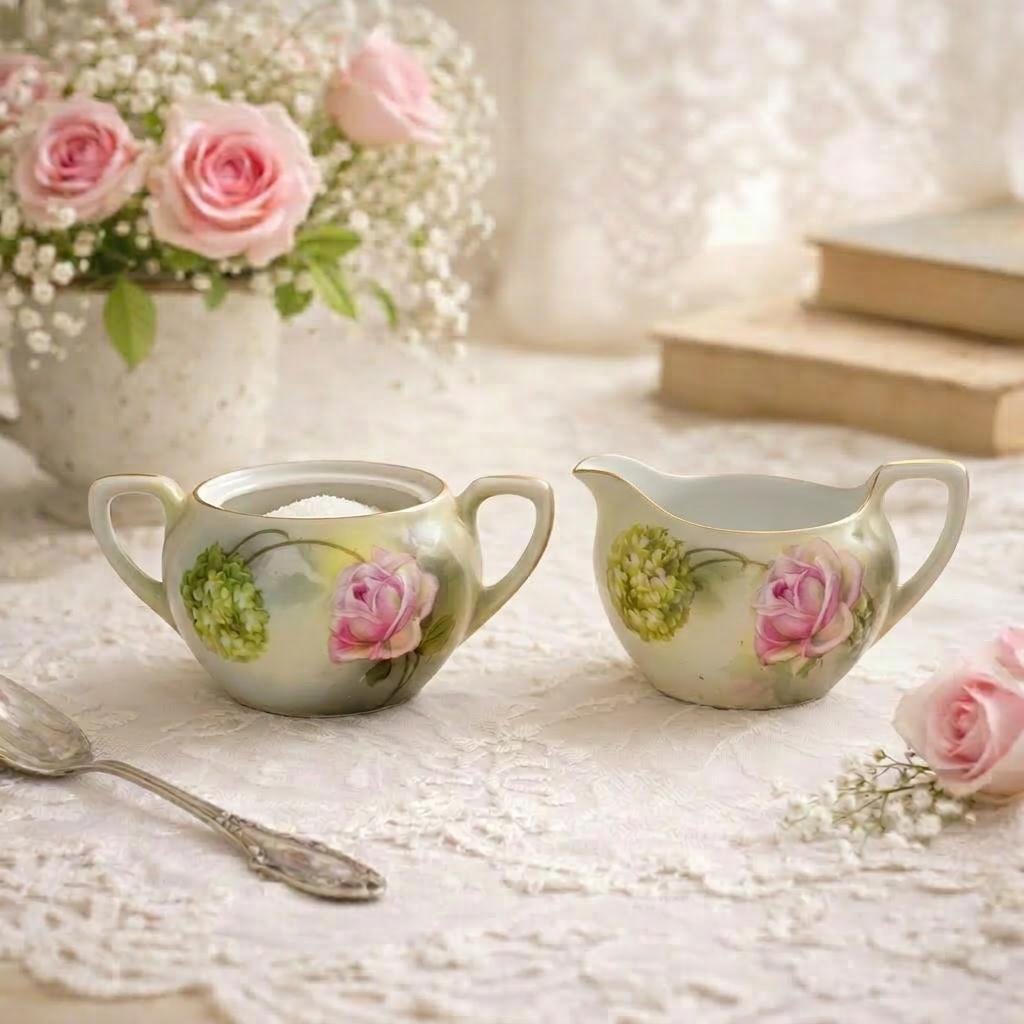 A delicate vintage RS Germany creamer and sugar set, hand painted in soft tones with refined detailing. This charming porcelain duo brings timeless elegance to tea service, whether used for serving cream and sugar or displayed as part of a curated cottage style vignette. A graceful addition to any vintage collection.