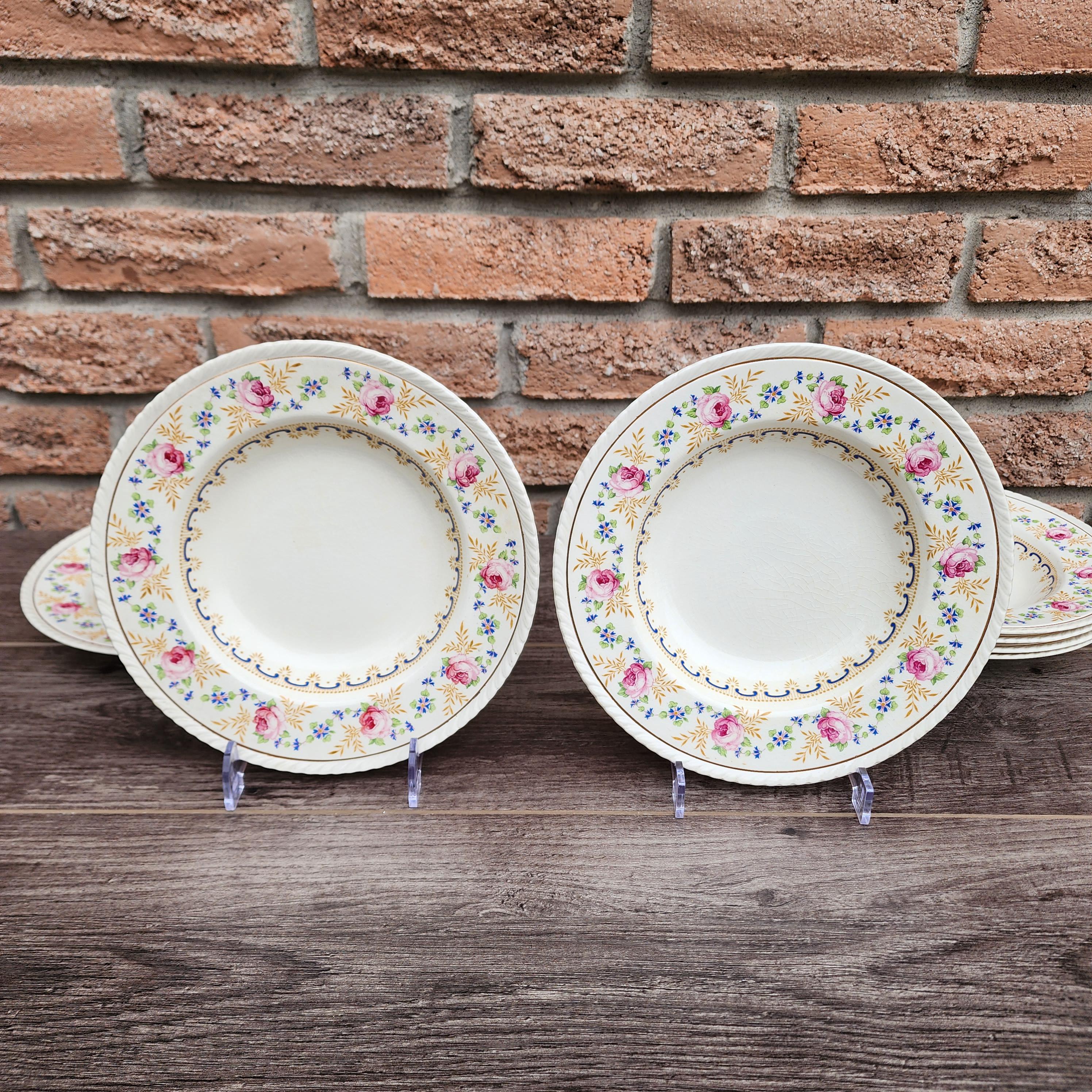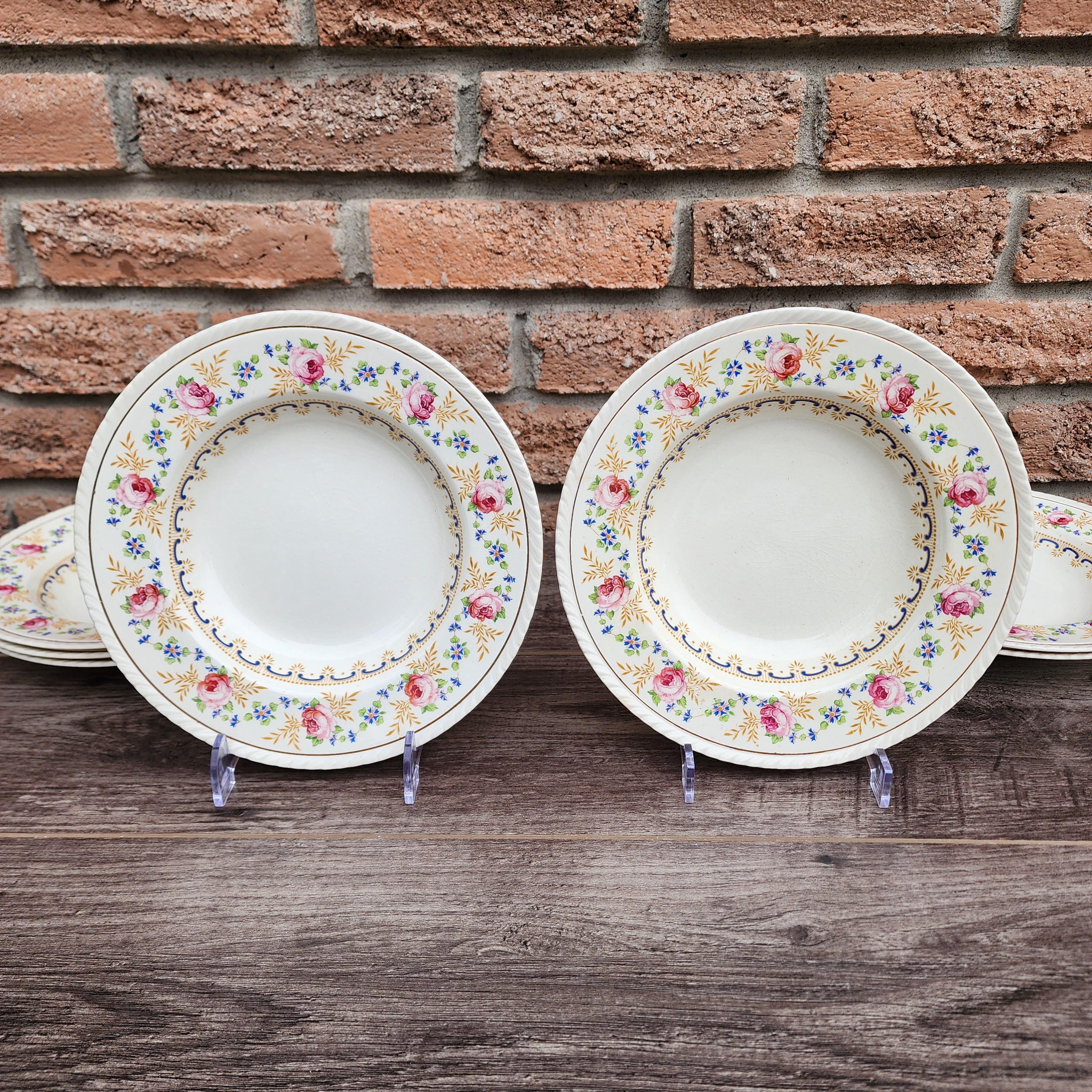 A versatile set of vintage rimmed soup bowls perfect for everyday meals, layered place settings, or adding gentle cottage warmth to your table décor.