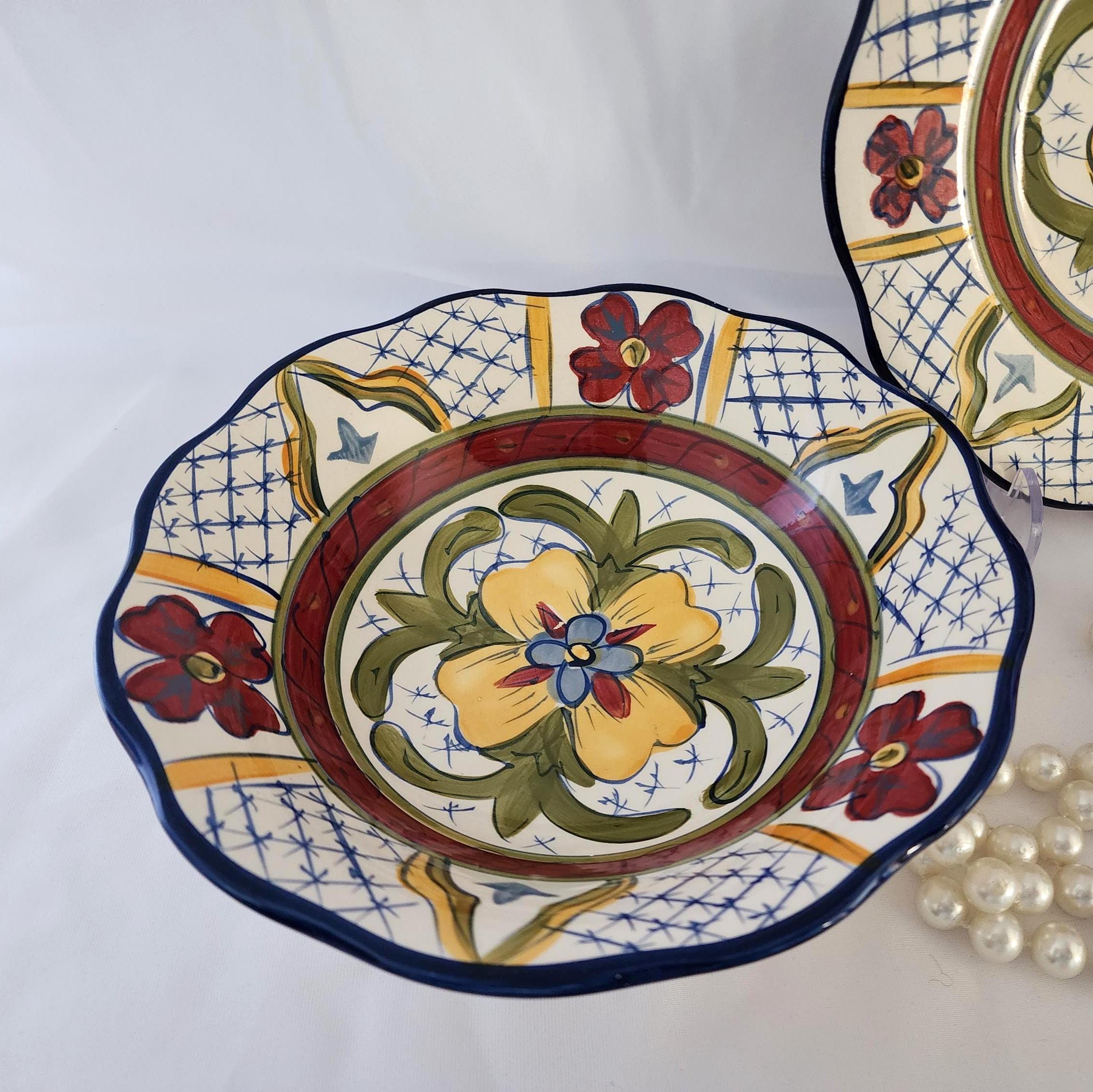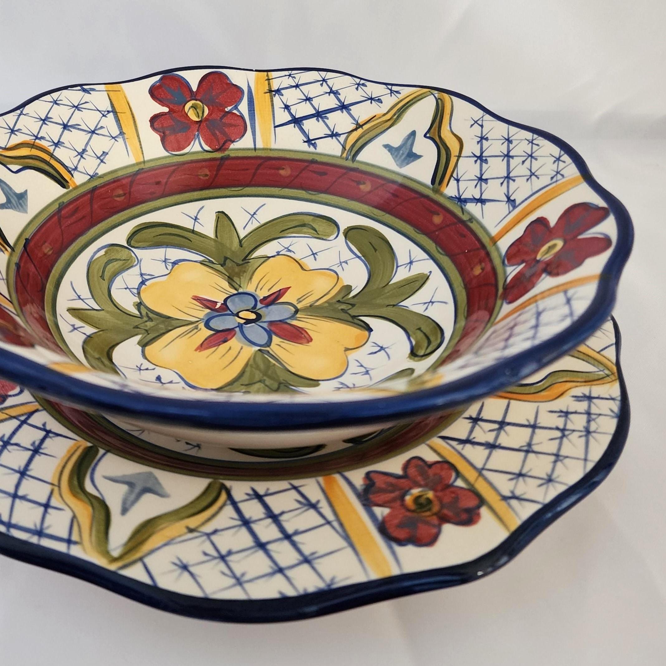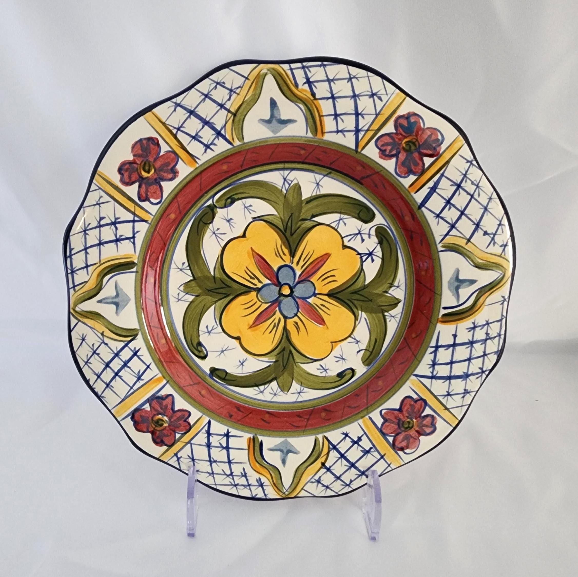 This vibrant Cordoba soup bowl and luncheon plate set adds bold color and pattern to everyday dining or artful table arrangements. The design features a bold central yellow floral medallion framed by olive green scrollwork, a deep red border ring, and hand painted crosshatch detailing in rich Mediterranean tones.