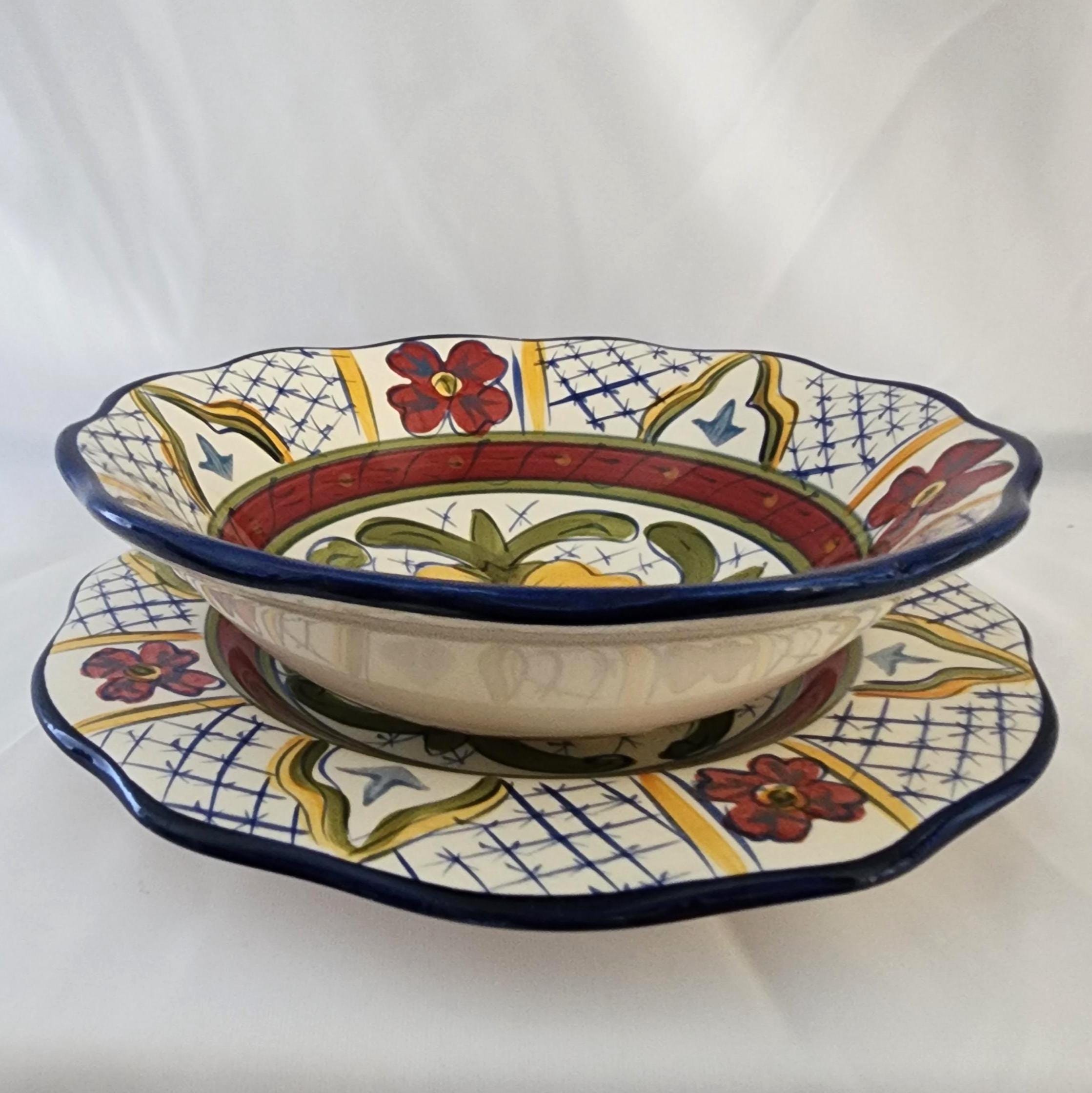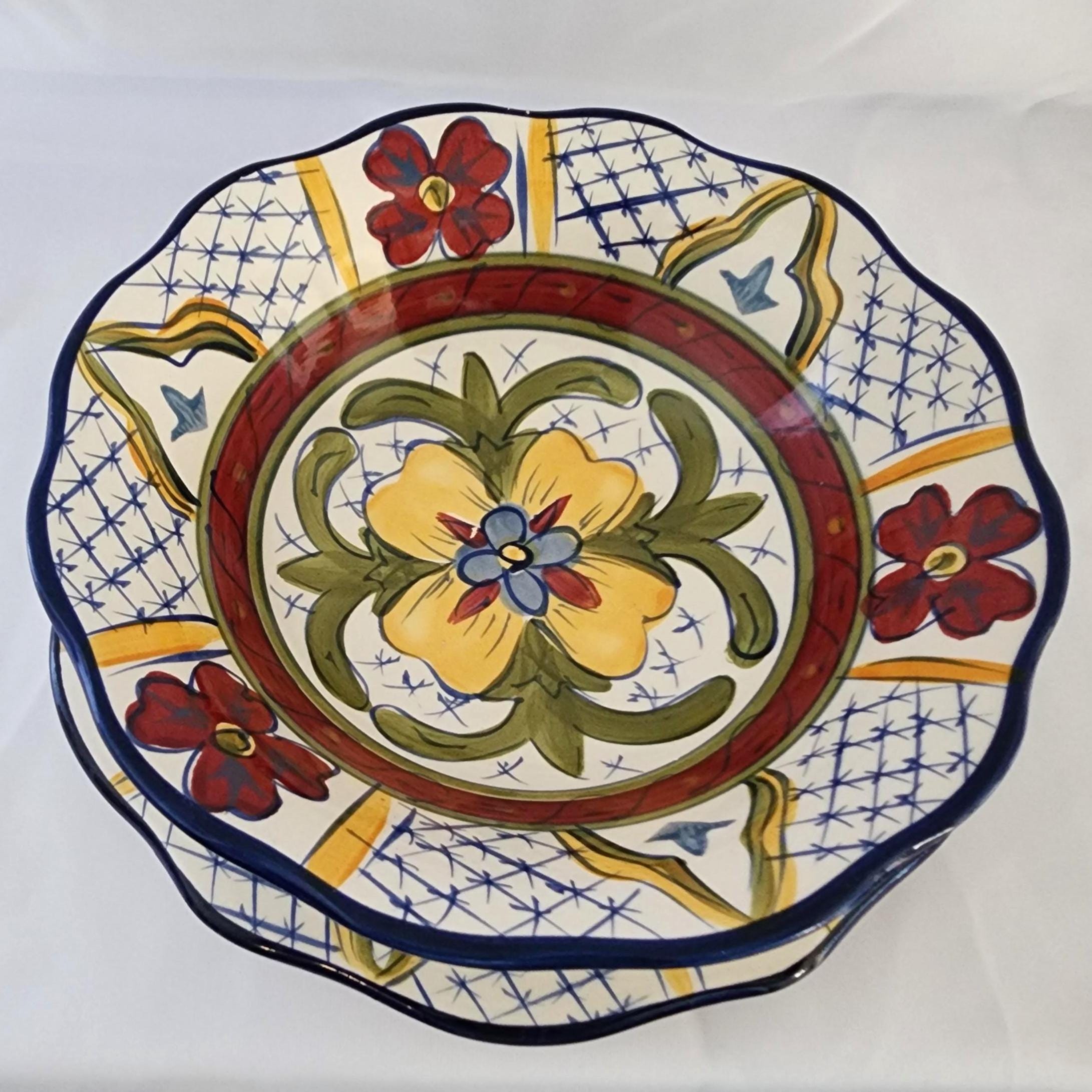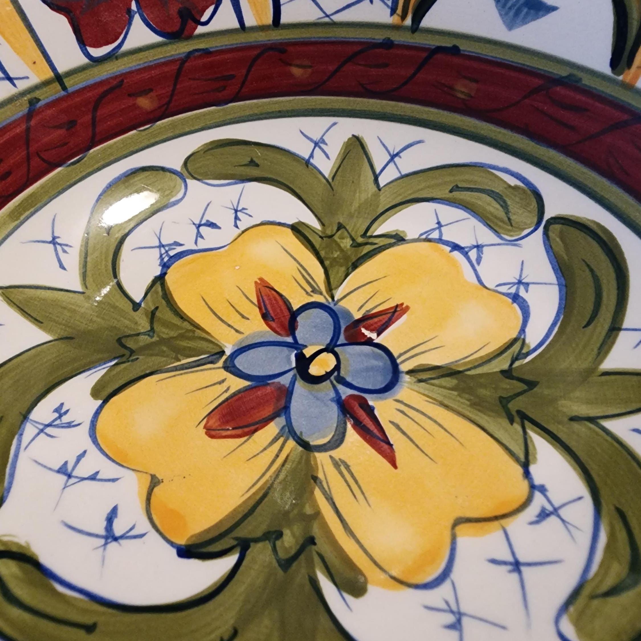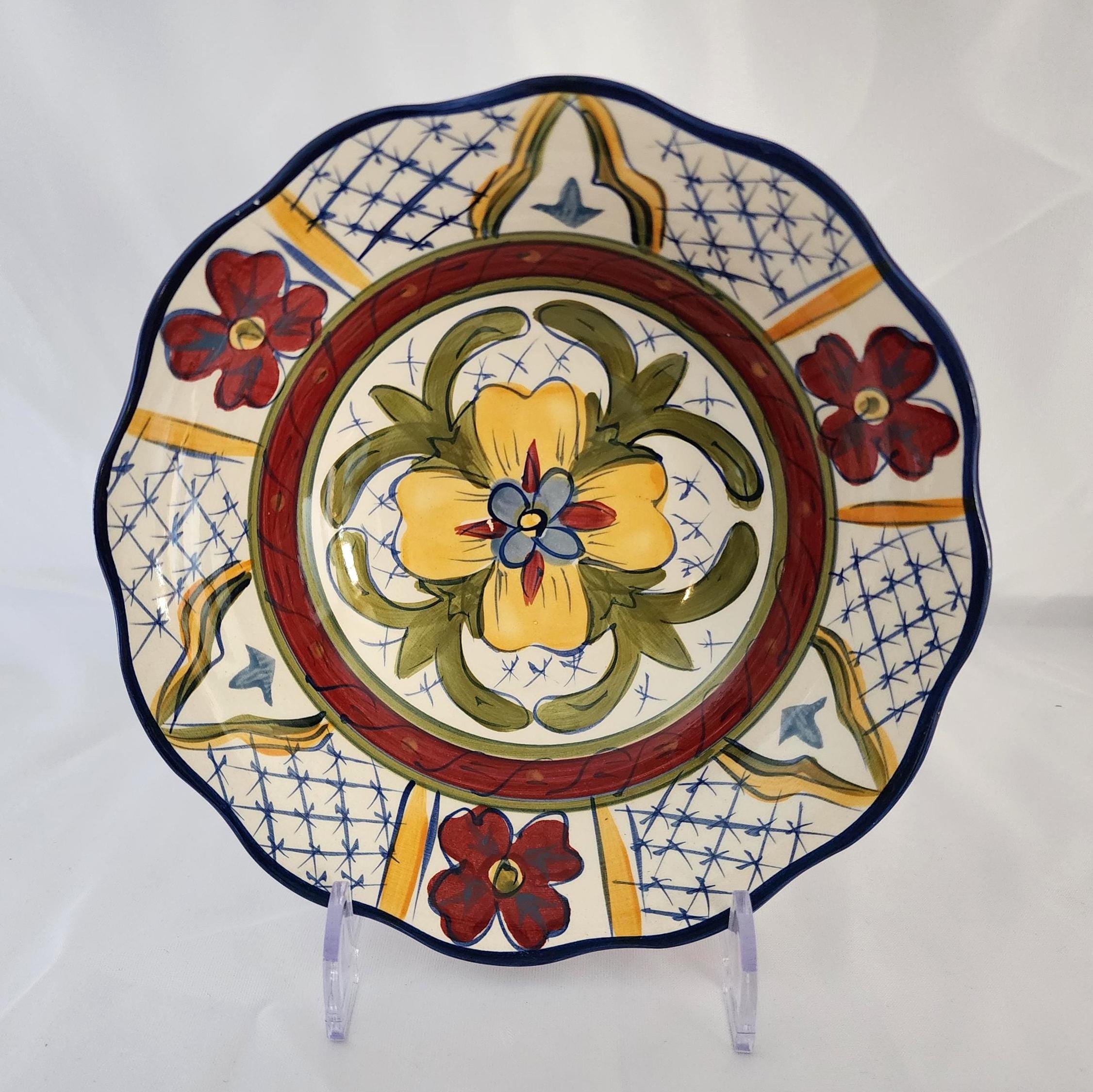 This vibrant Cordoba soup bowl and luncheon plate set adds bold color and pattern to everyday dining or artful table arrangements. The design features a bold central yellow floral medallion framed by olive green scrollwork, a deep red border ring, and hand painted crosshatch detailing in rich Mediterranean tones.
