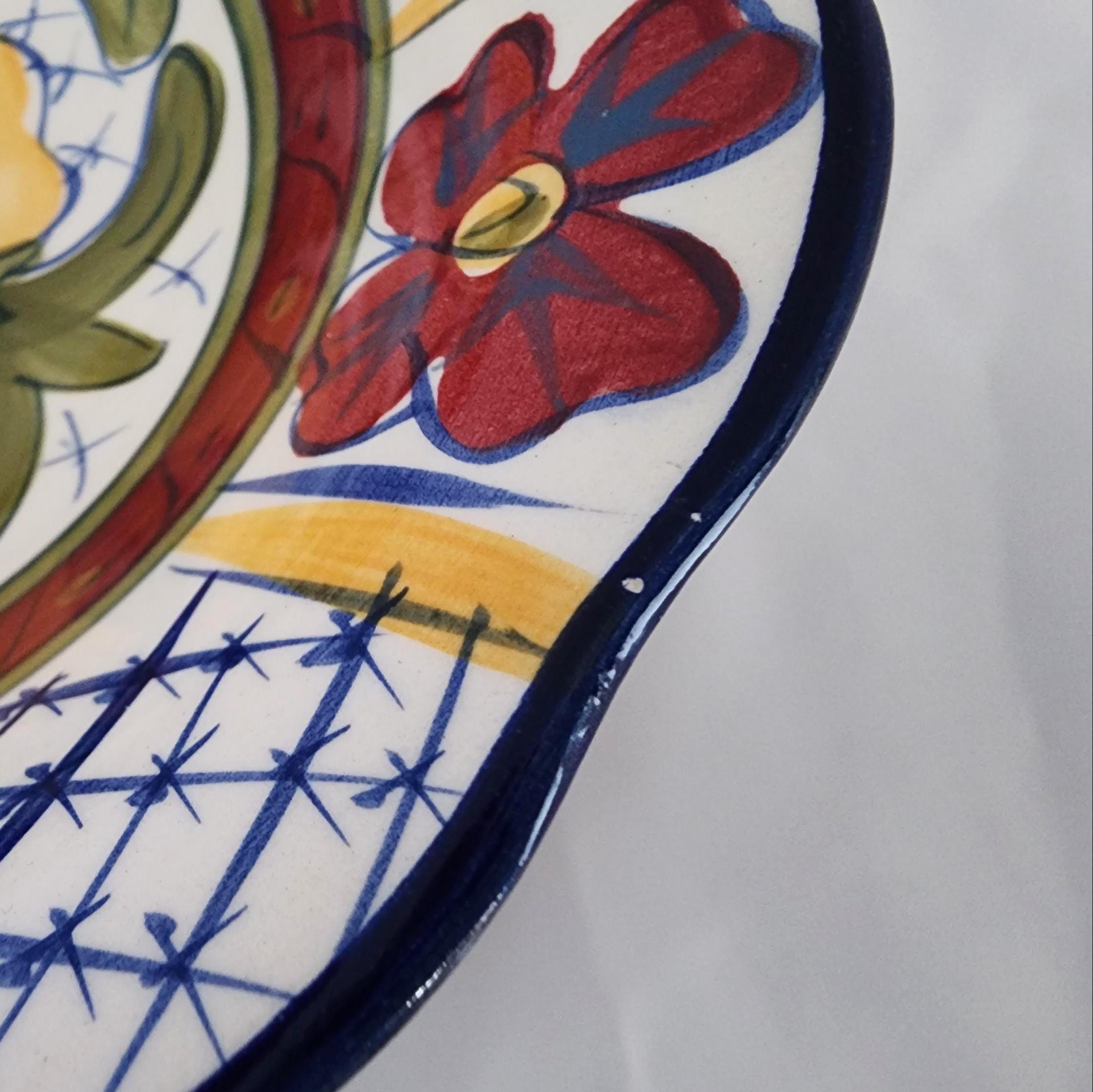 Scalloped rims and navy edging create gentle dimension, while smaller red blossoms and geometric panels reference classic Iberian ceramic ornament. The palette of mustard, burgundy, olive, navy, and cream brings warmth and depth, standing out beautifully against neutral linens or rustic wood surfaces.