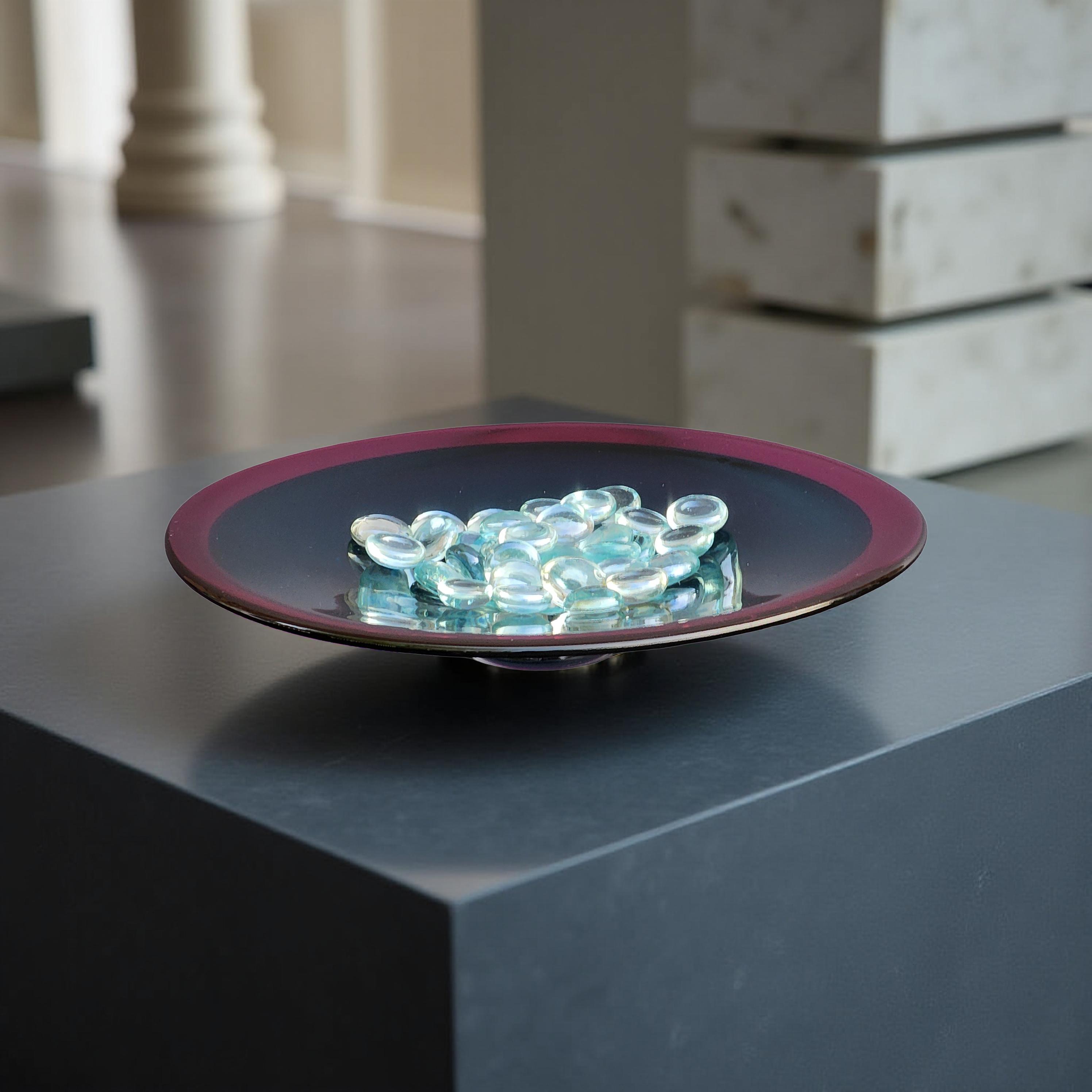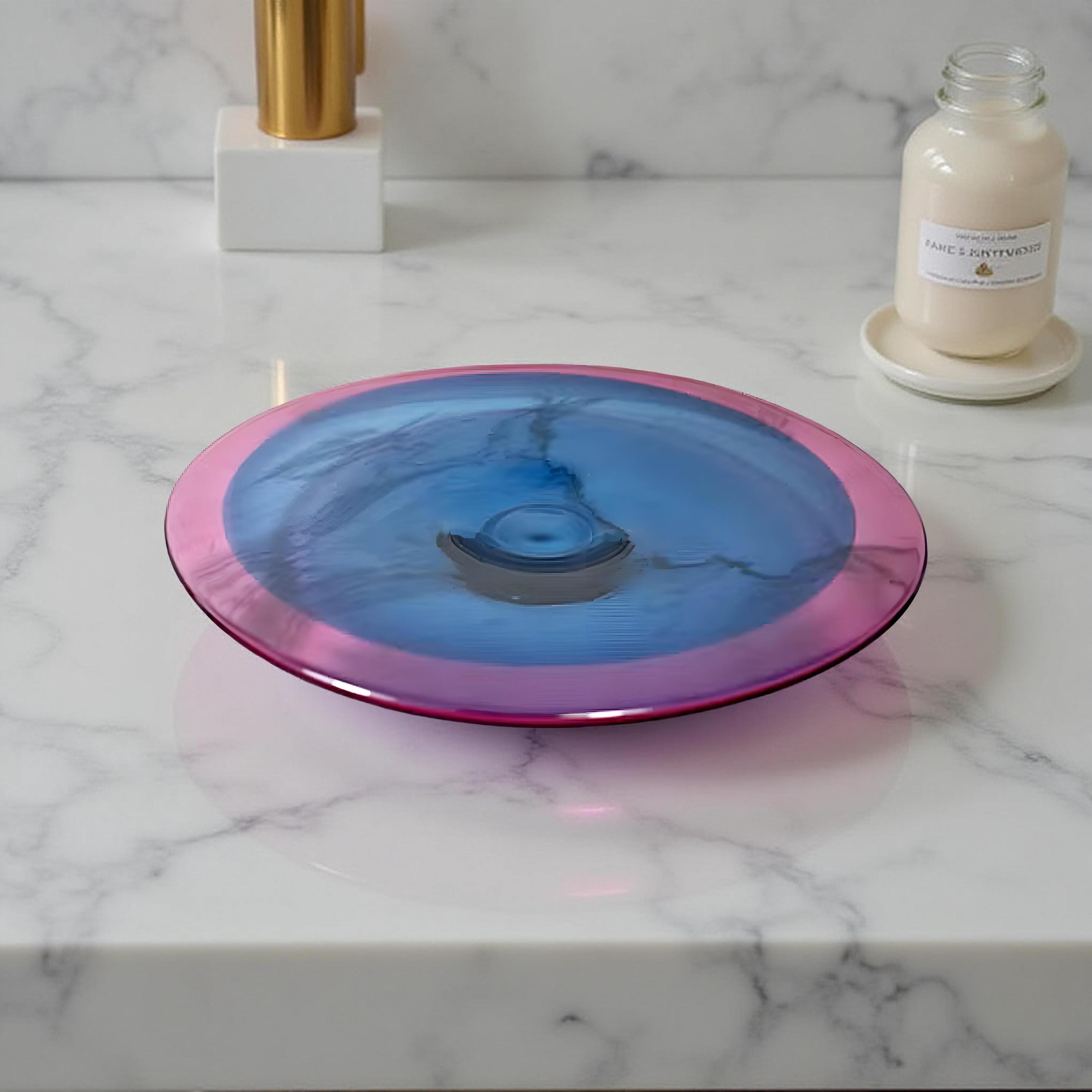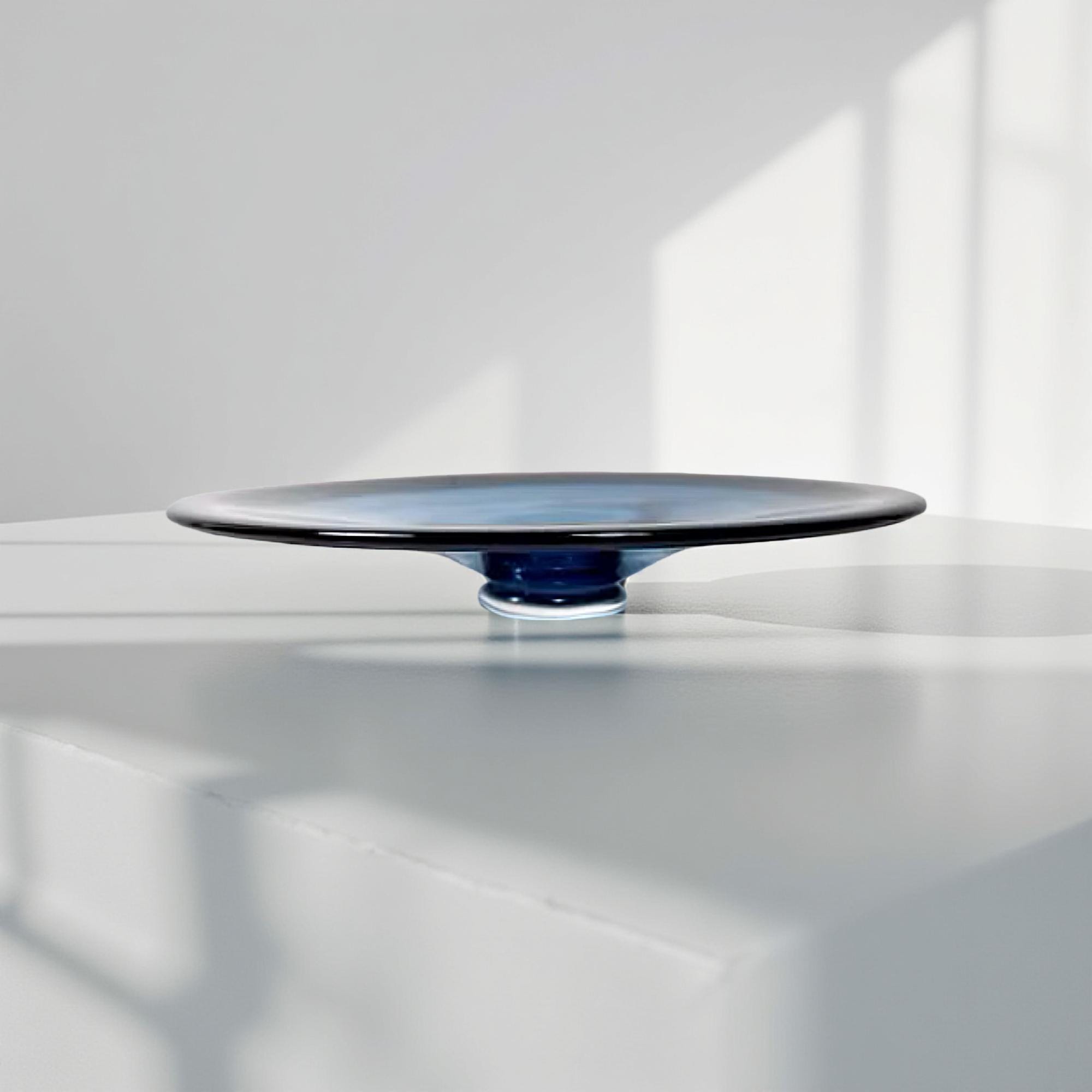 A bold studio glass dish offering vibrant colour and minimalist form for shelves, consoles, and curated interiors.