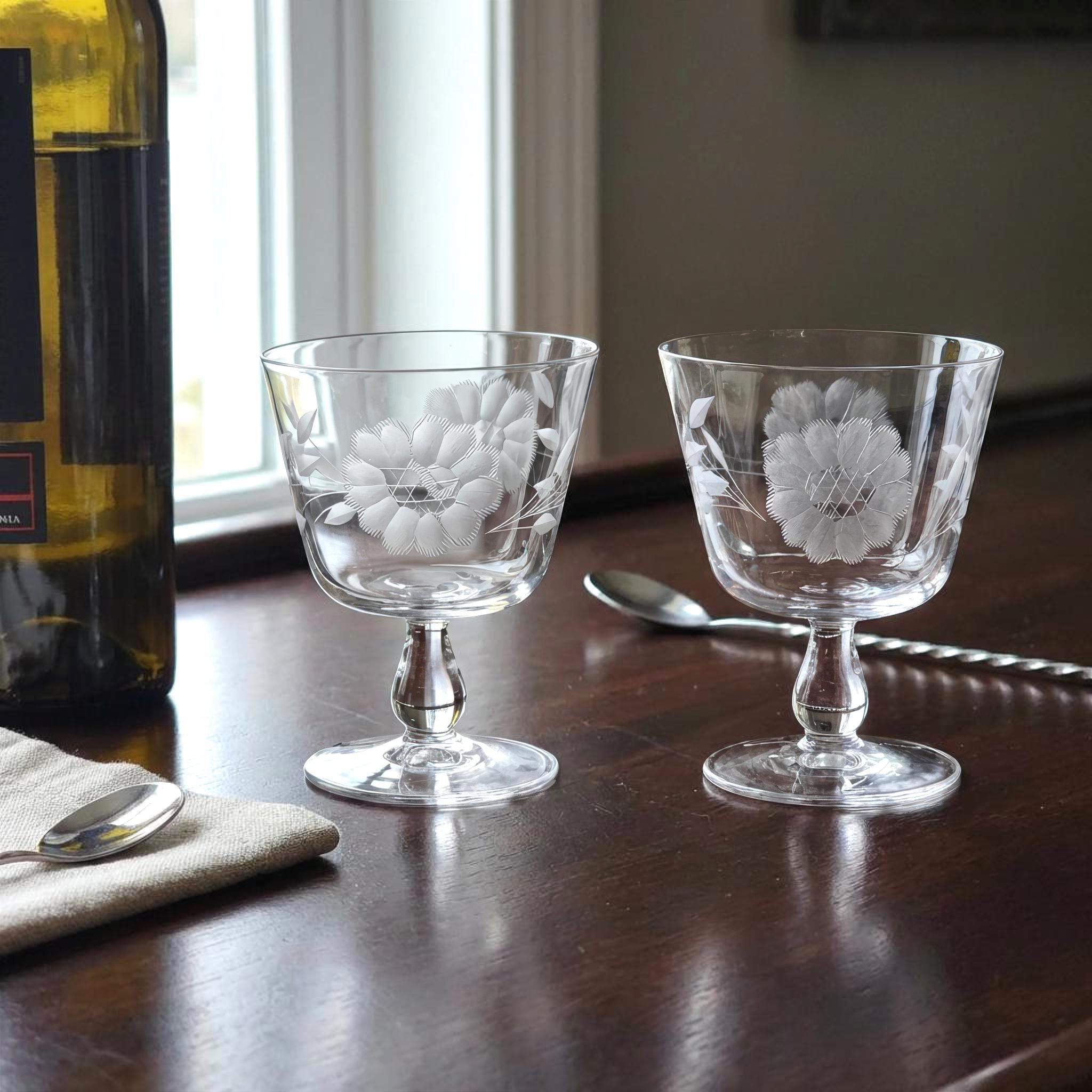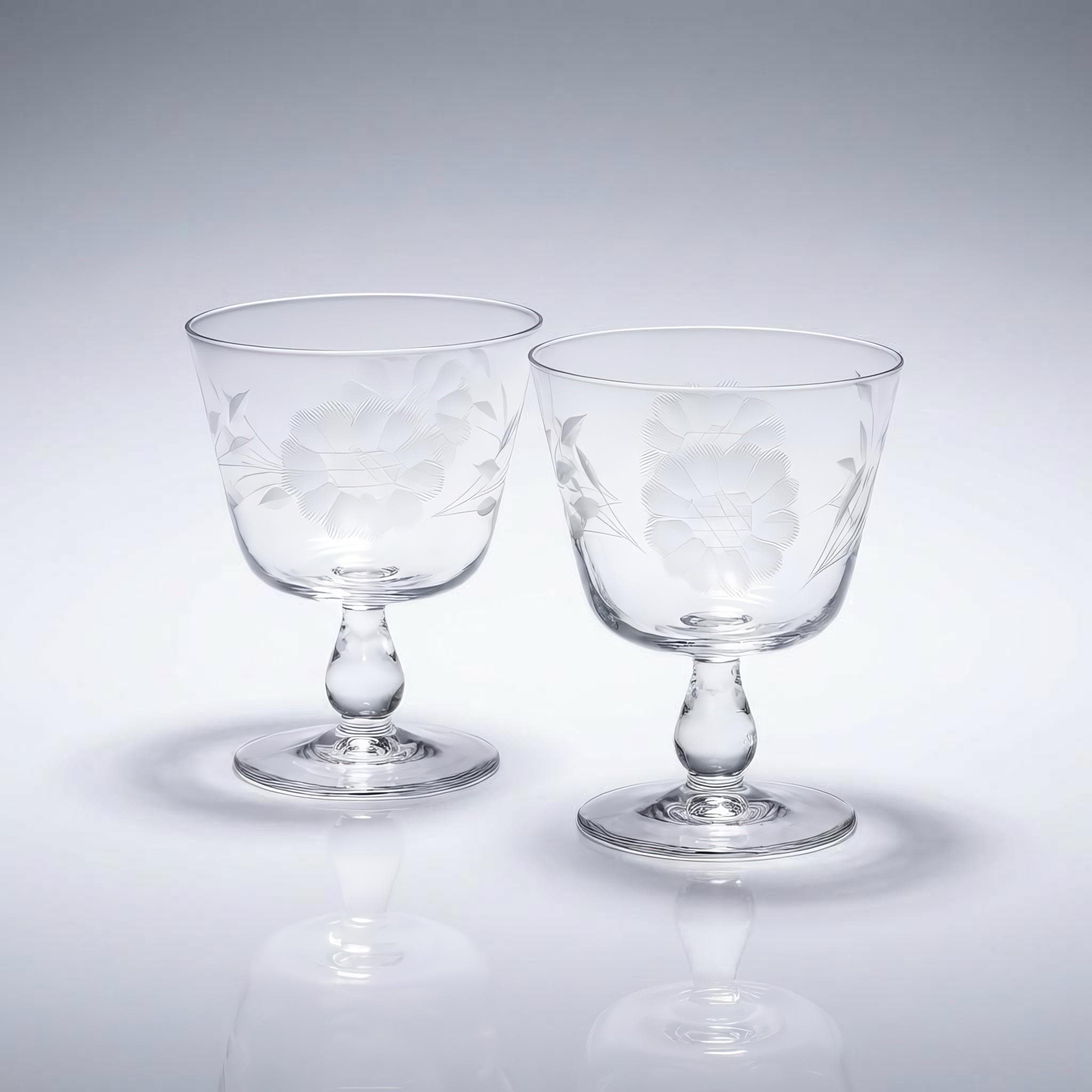 A set of two vintage Hughes Cornflower etched port wine glasses featuring the distinctive bulbous non optic stem. Hand etched in Toronto on Imperial Glass blanks, each piece displays crisp clarity and refined proportion suited to intimate cocktail service or classic bar styling.