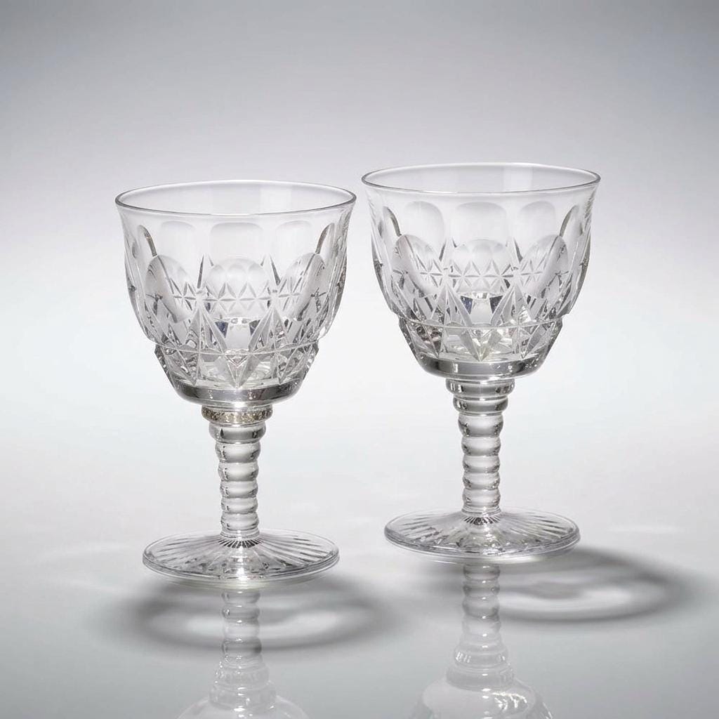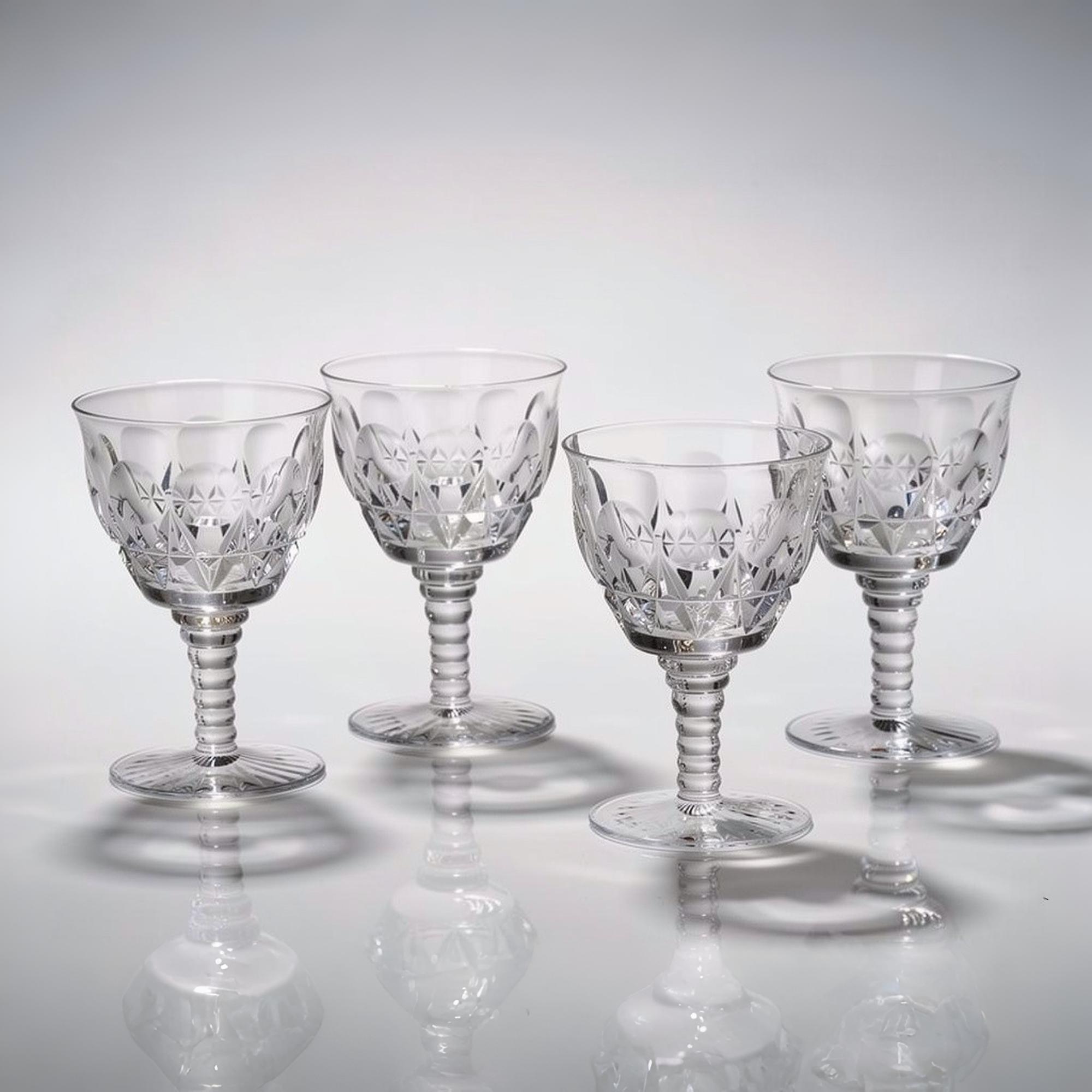 Mid century crystal stemware balanced decorative sparkle with practical entertaining. Cordials were traditionally used for aperitifs or digestifs, and their smaller scale reflects formal dining customs of the era. The crisp cutting and weight suggest quality lead crystal production.