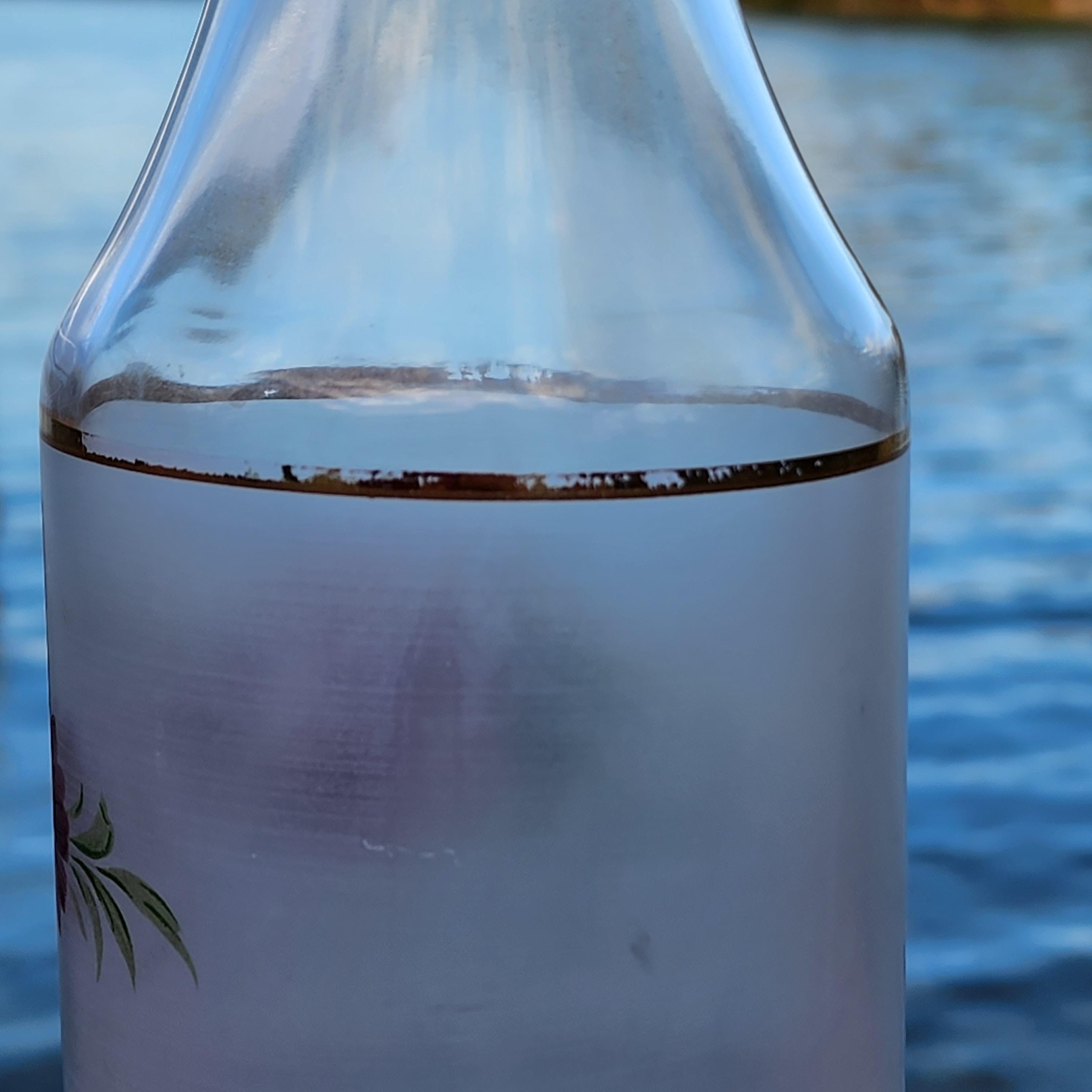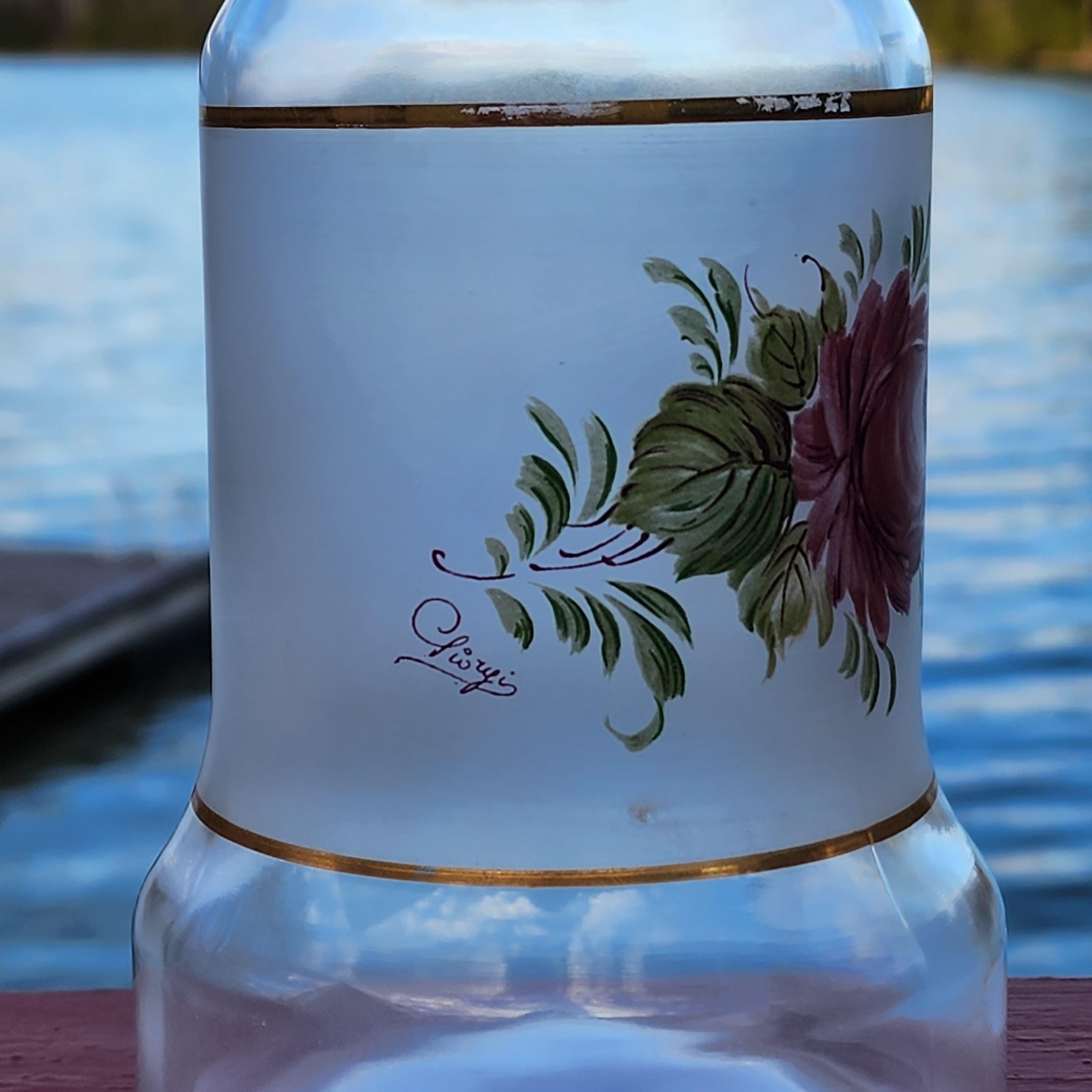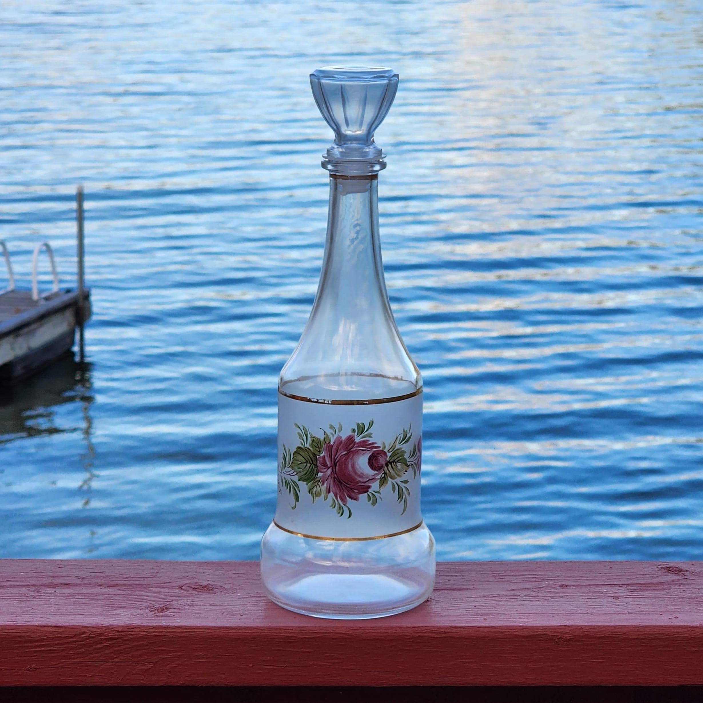 Vintage Italian Hand Painted Frosted Glass Decanter – Red Roses Gold Bands – Cristallerie Style
