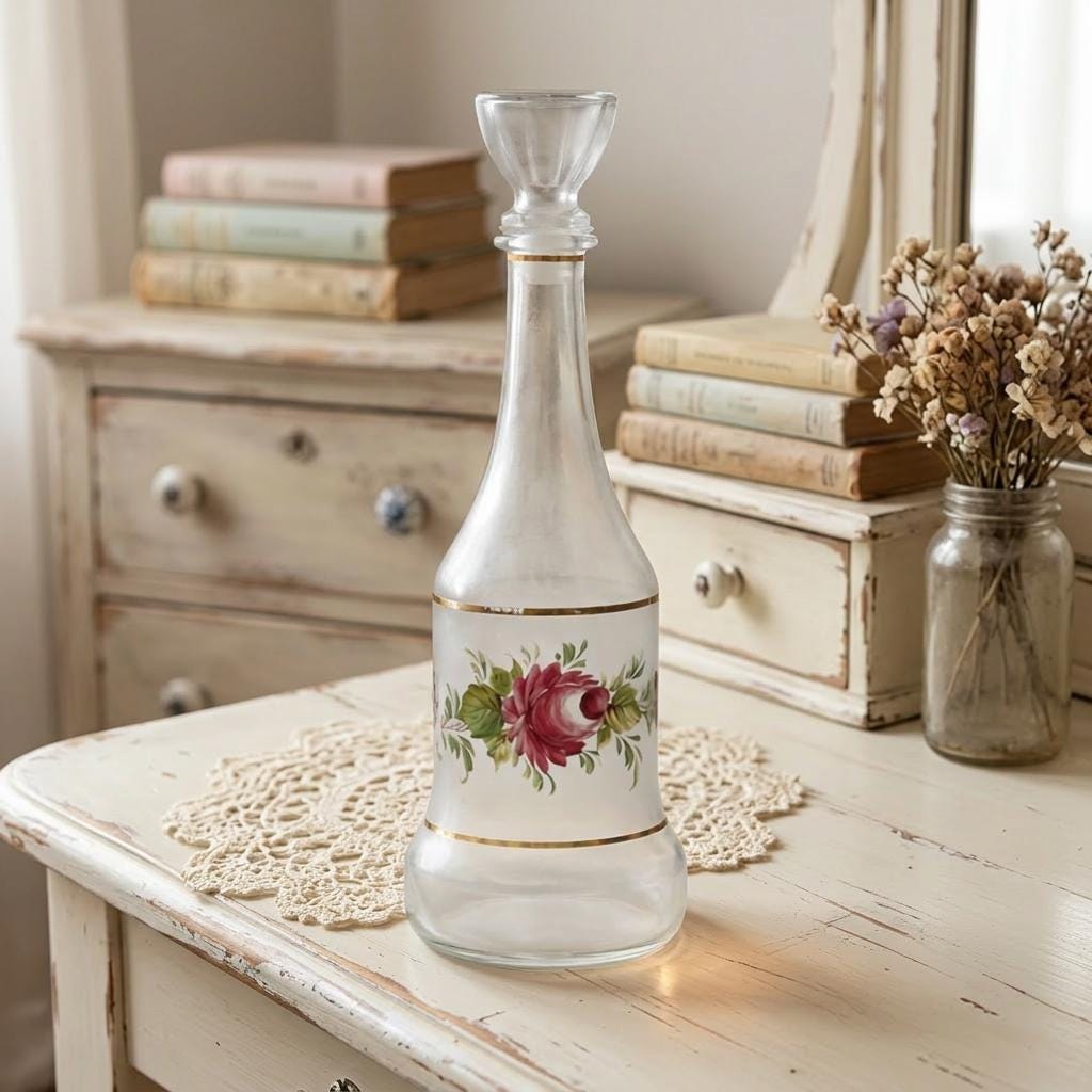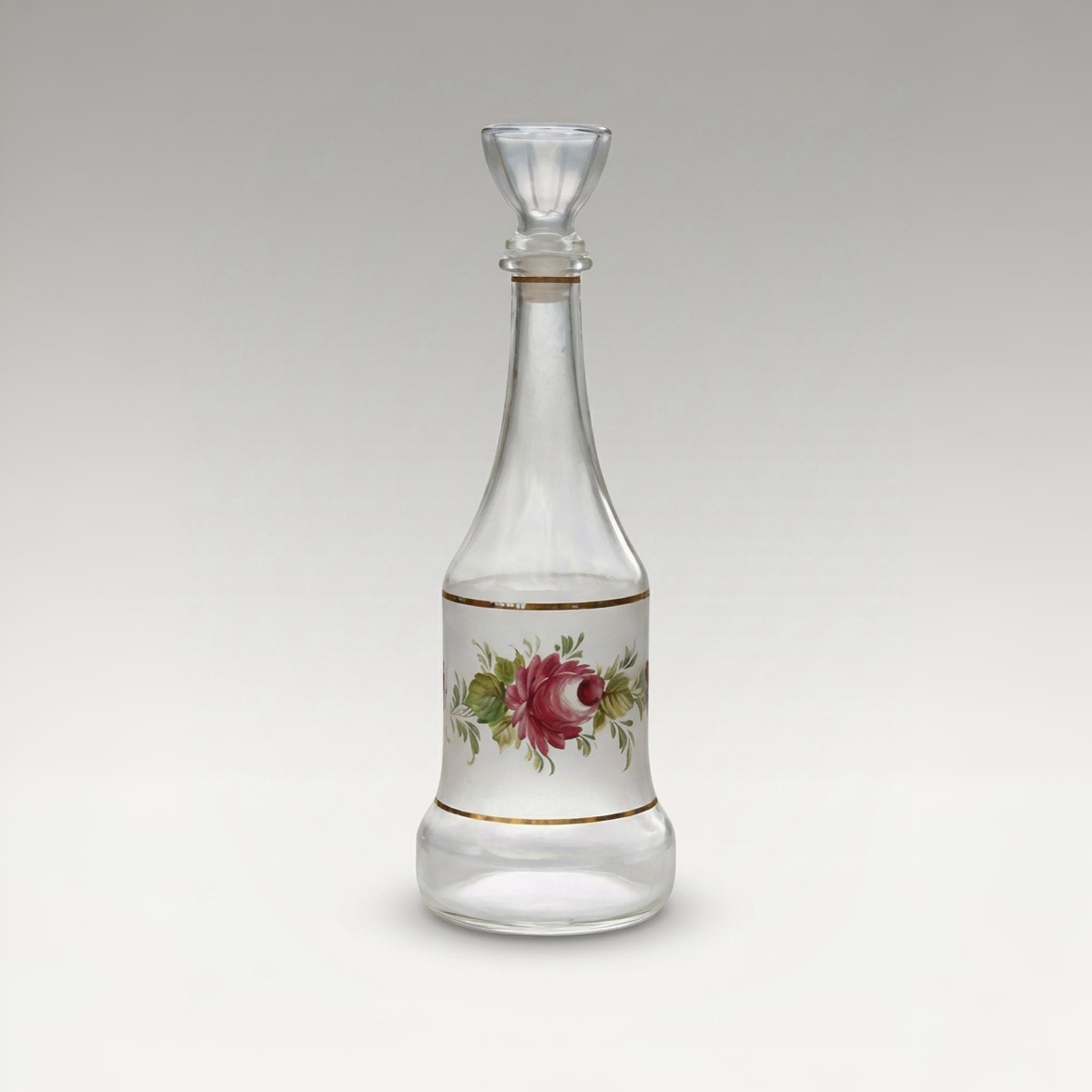 A vintage Cristallerie hand painted glass wine and liquor decanter, made in Italy, featuring romantic red roses framed by gold bands against an opaque frosted ground. The softly tapered silhouette and original stopper with its plastic screw type cork reflect mid century craftsmanship, while the frosted field enhances depth and allows the florals to gently glow. A charming addition to bar carts, sideboards, or cottage inspired entertaining displays.
