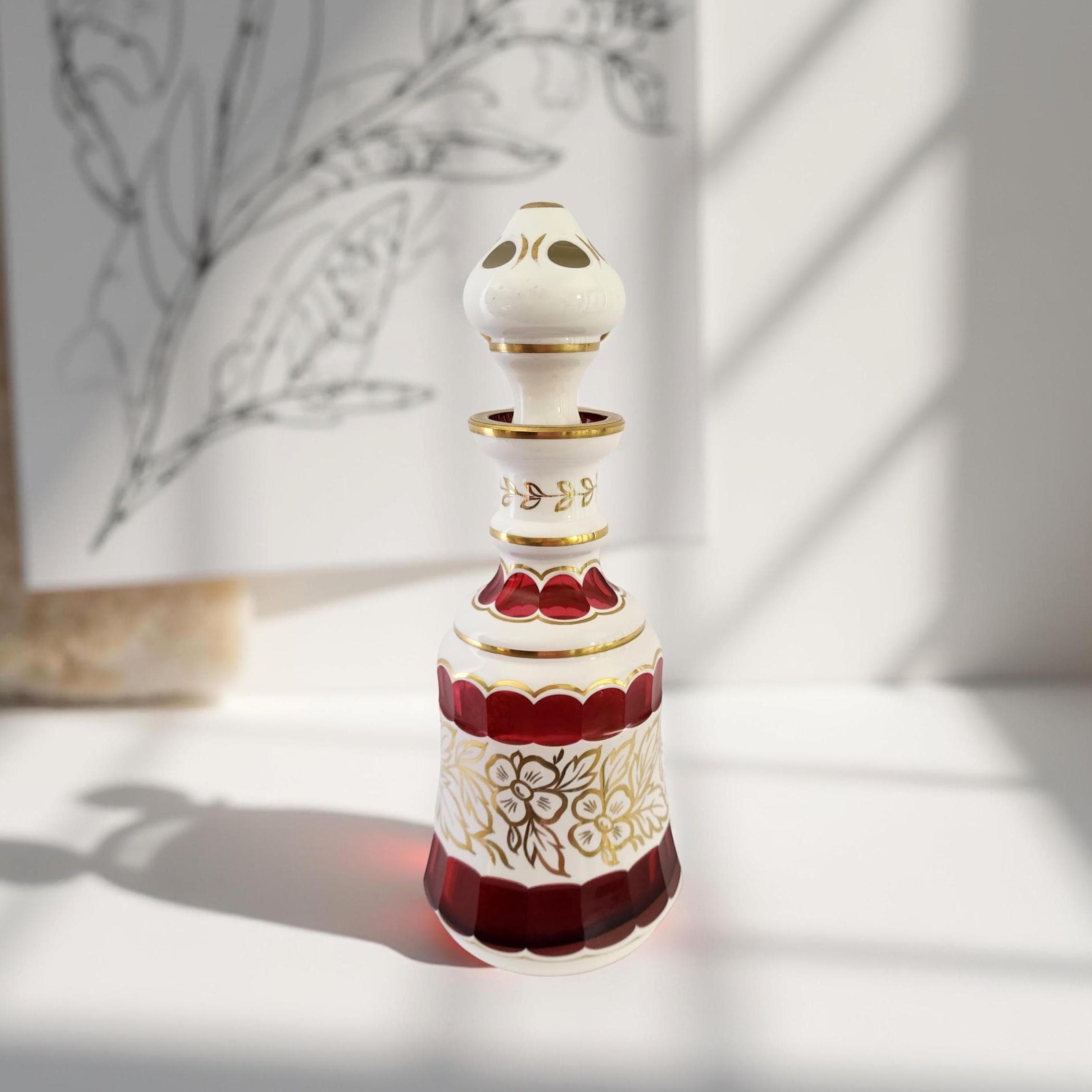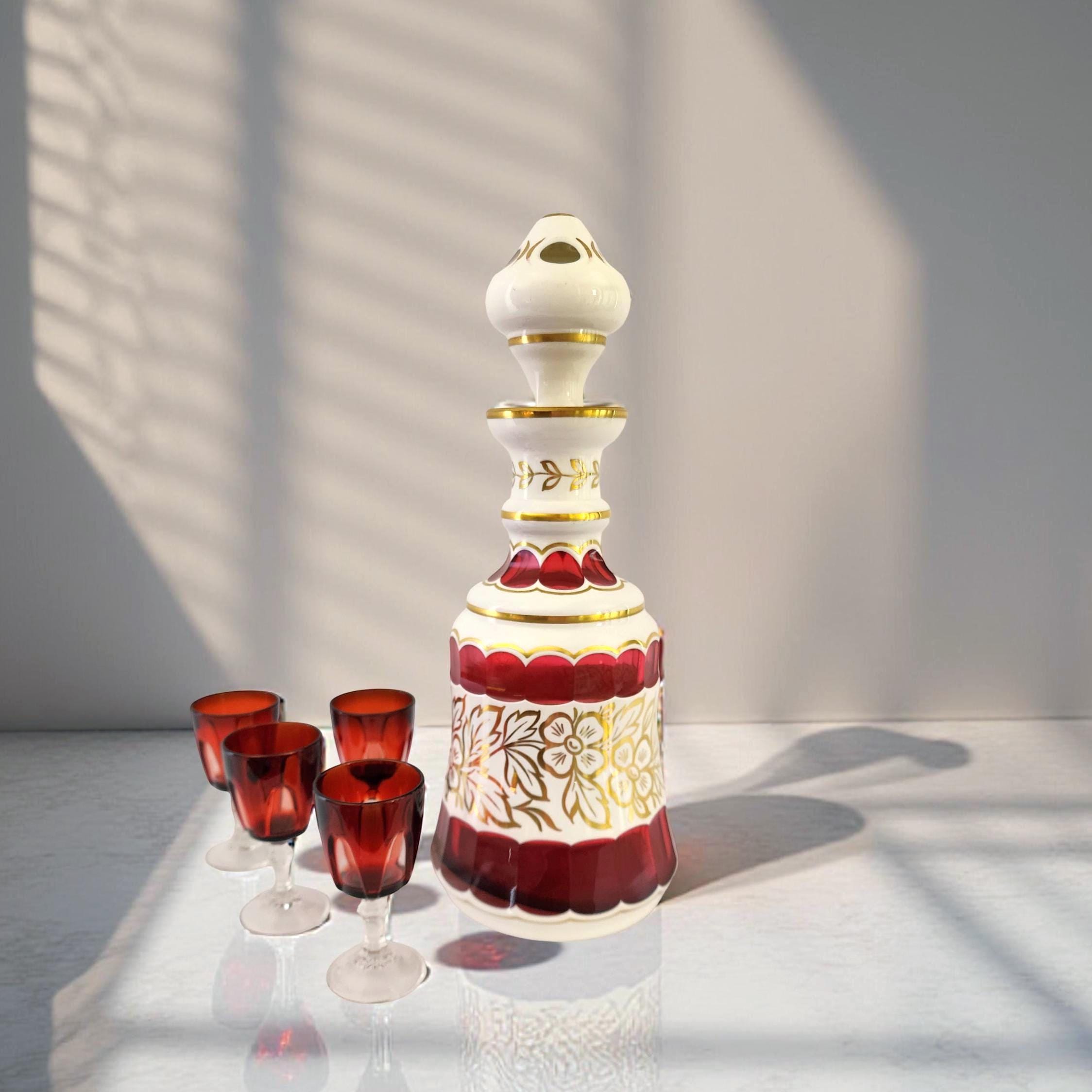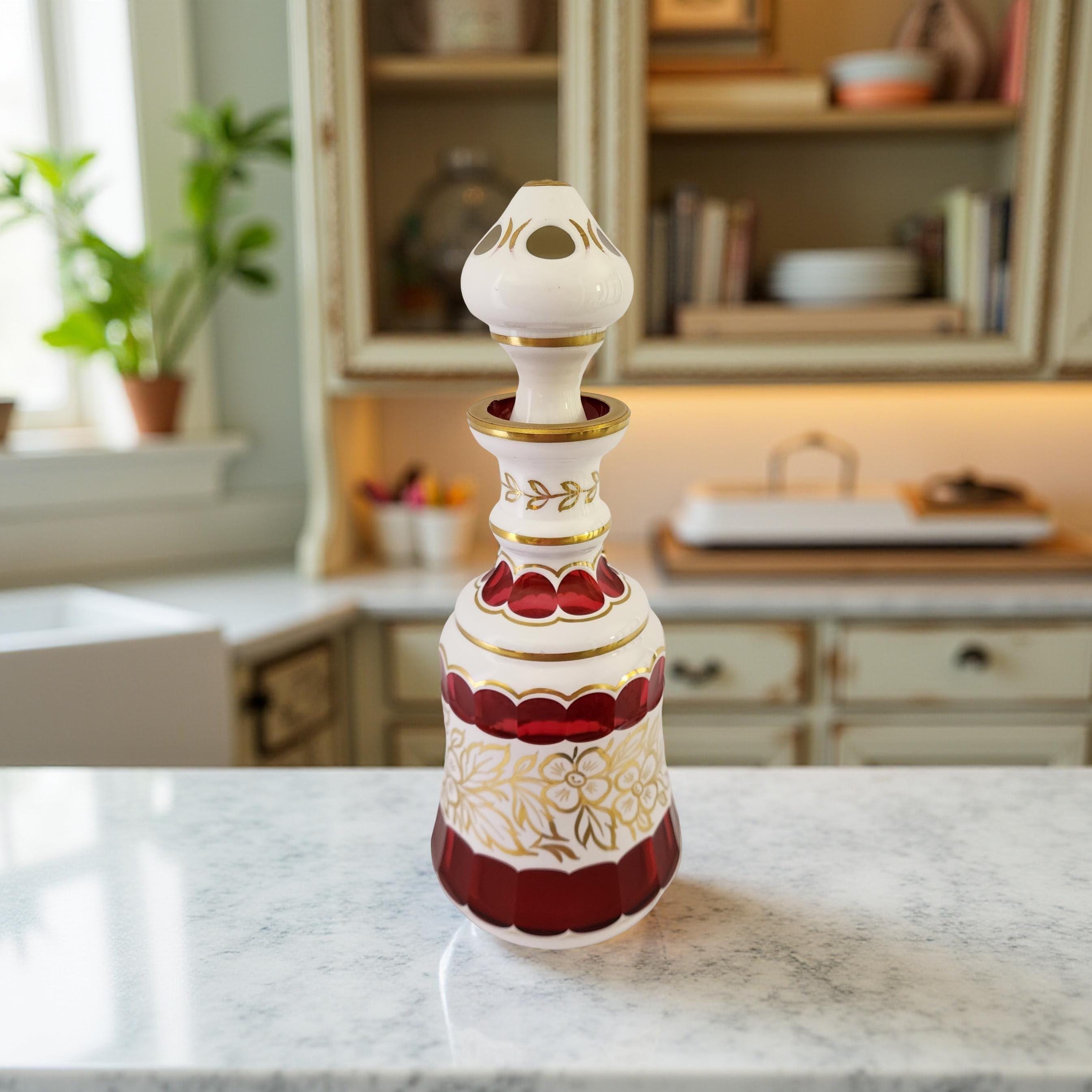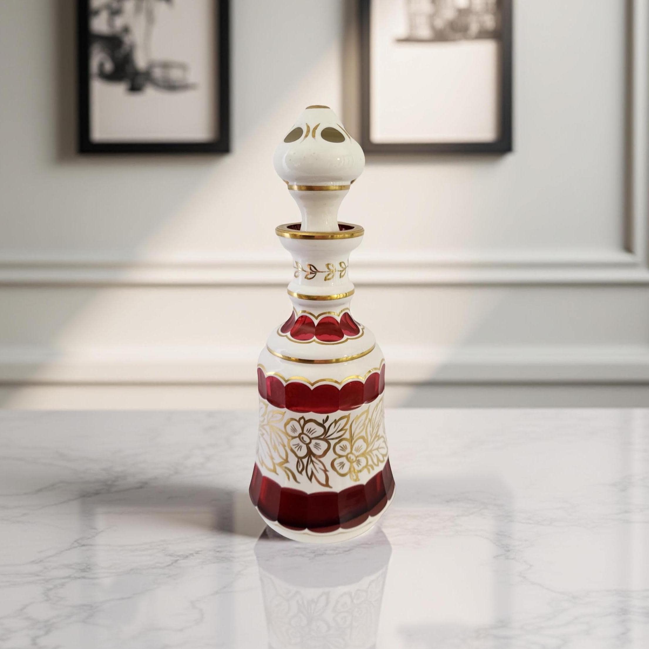 A vintage Czech ruby cased white overlay decanter featuring layered red and white glass with hand applied gold accents. Its tall tapered form is adorned with floral and geometric cutwork that removes the white casing to reveal the ruby layer beneath.