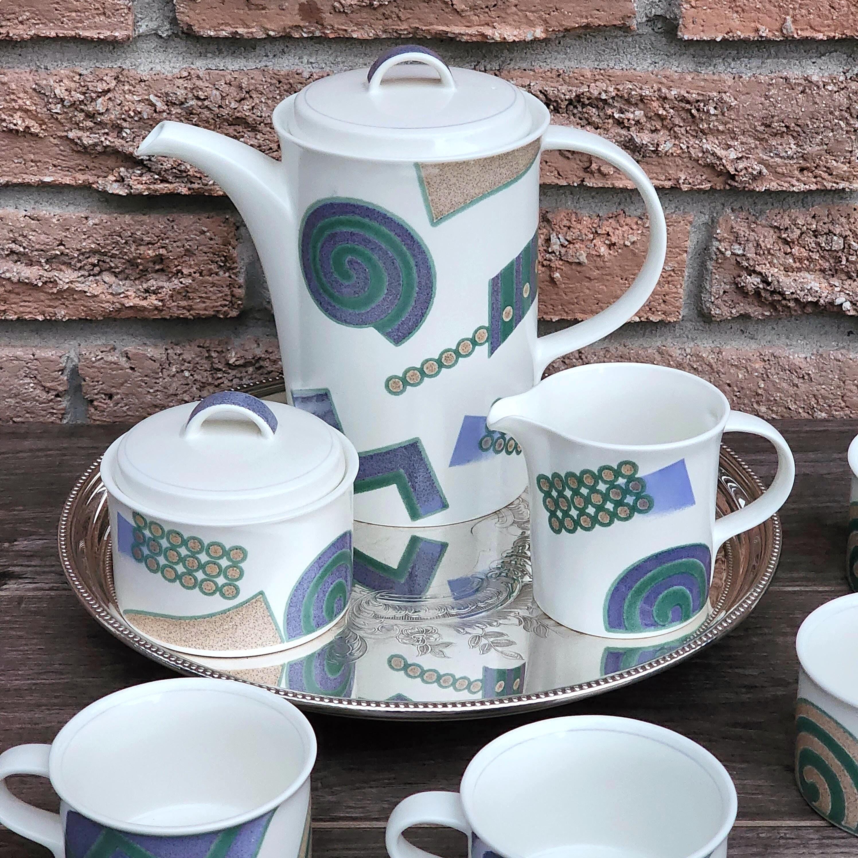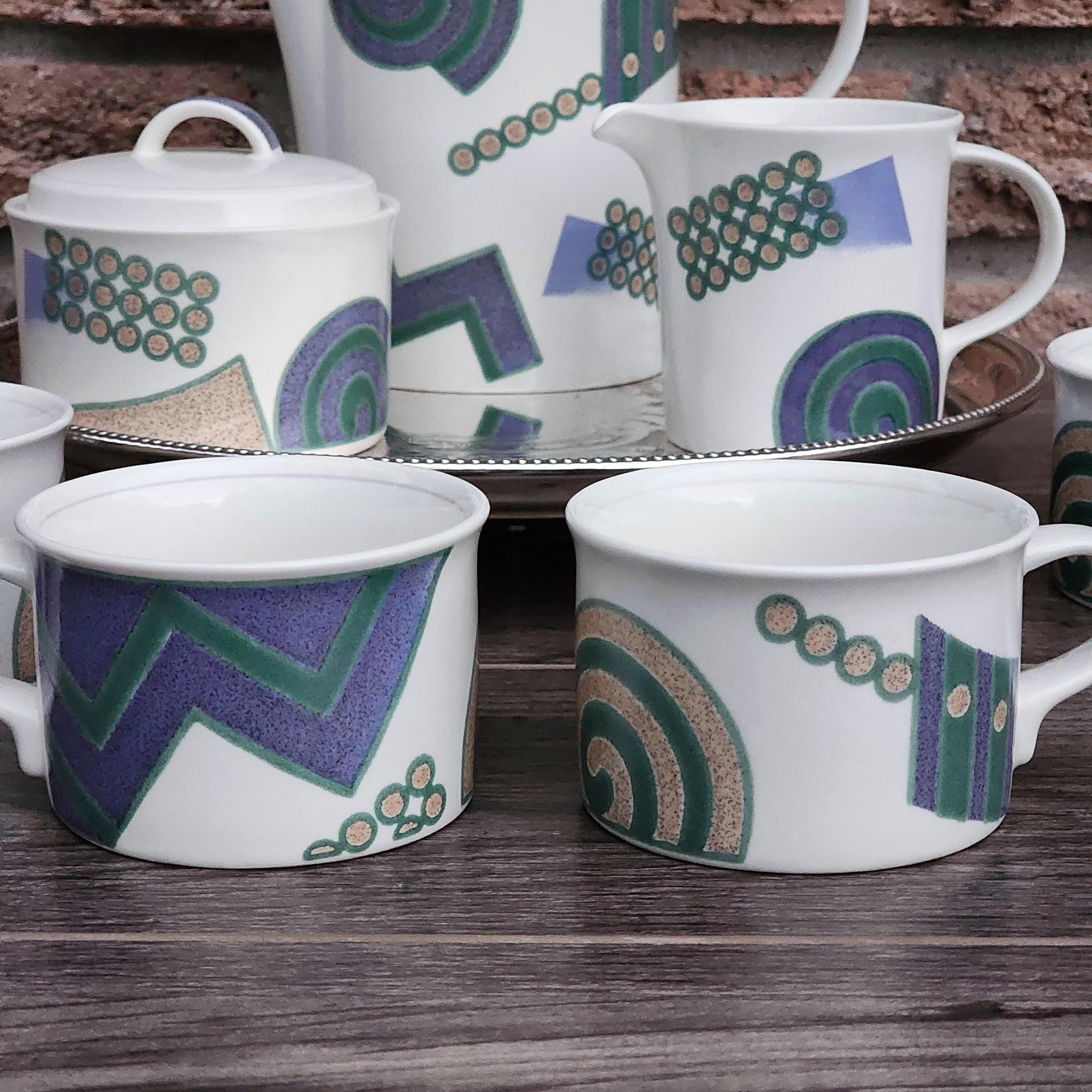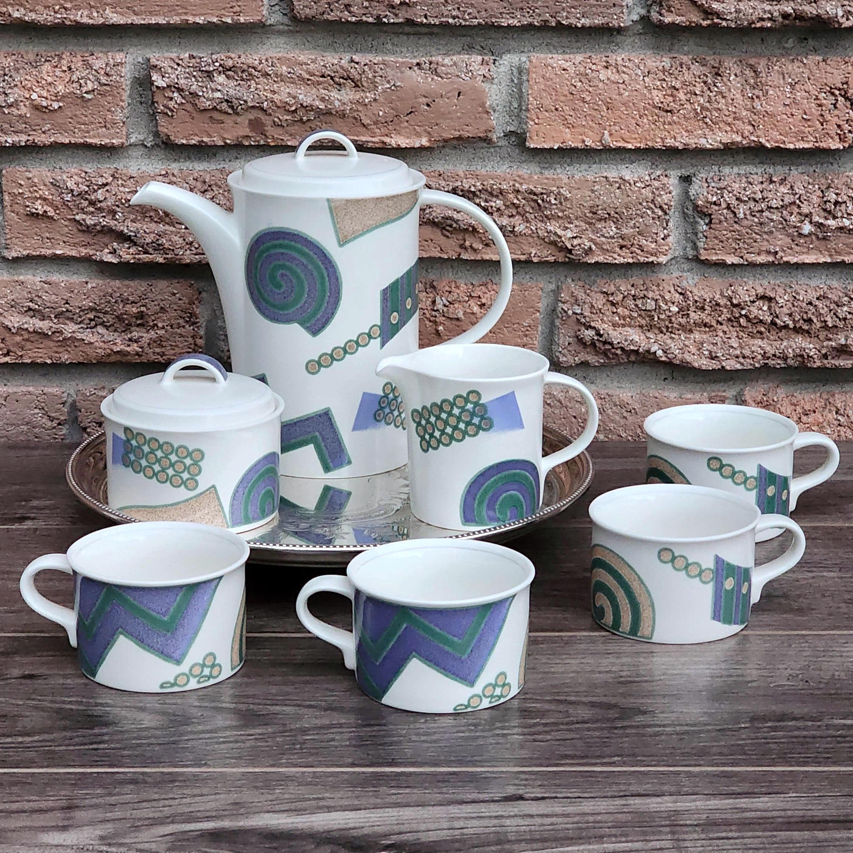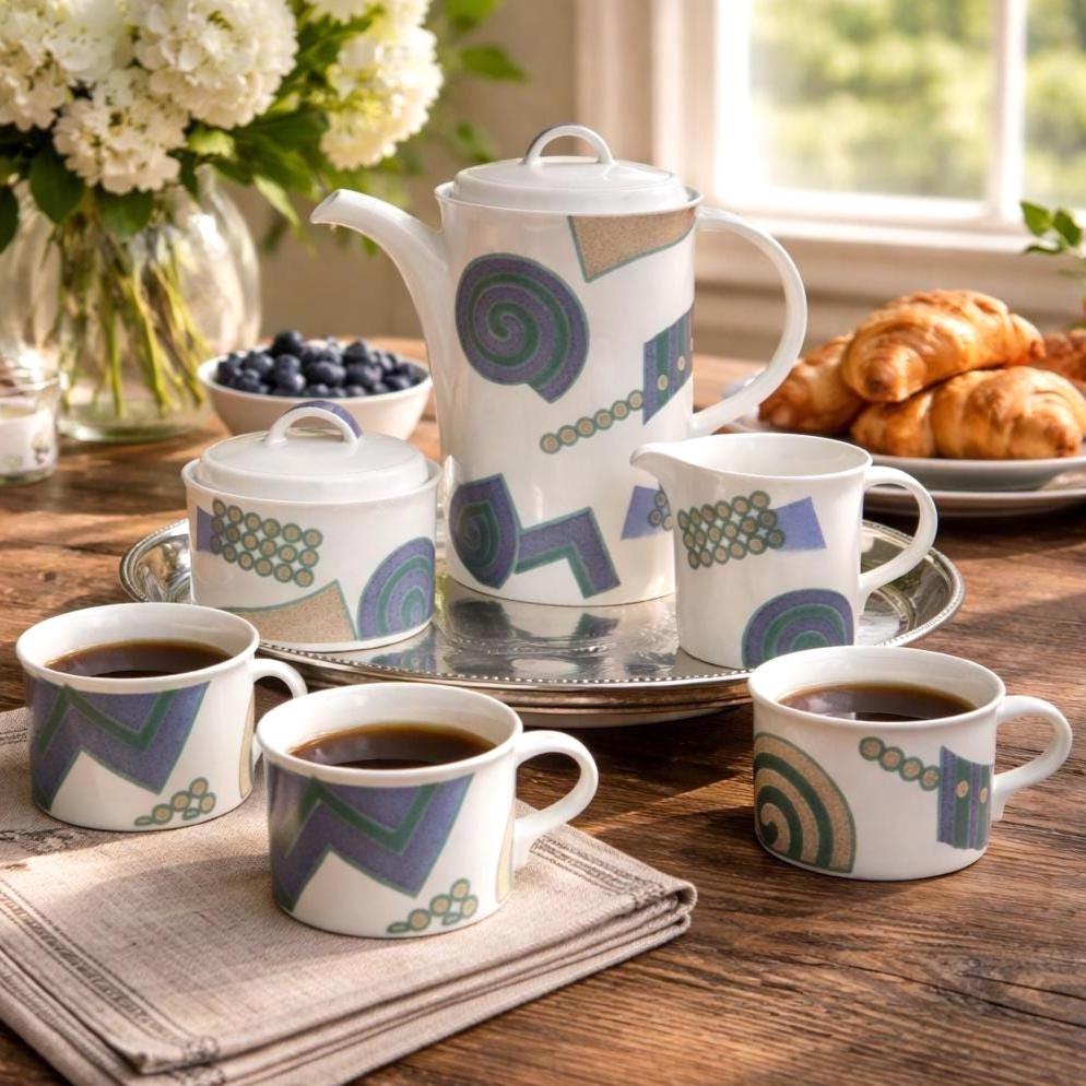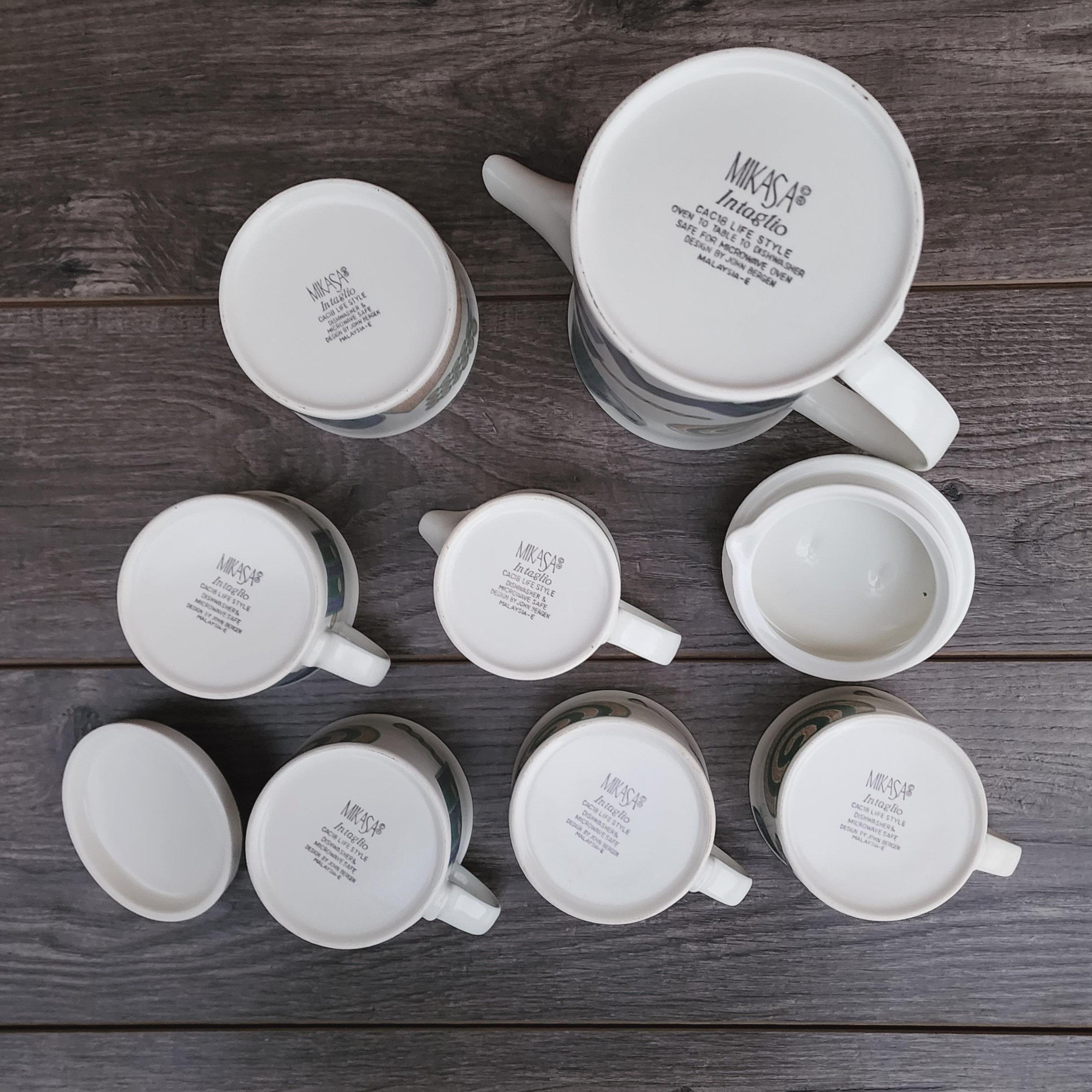 A vintage nine piece Mikasa Intaglio coffee set finished in teal with soft blue violet, green and beige accents on an off-white ground. This coordinated set brings a refined yet relaxed feel to coffee service, perfect for morning rituals, weekend brunch, or styled display in a contemporary kitchen.