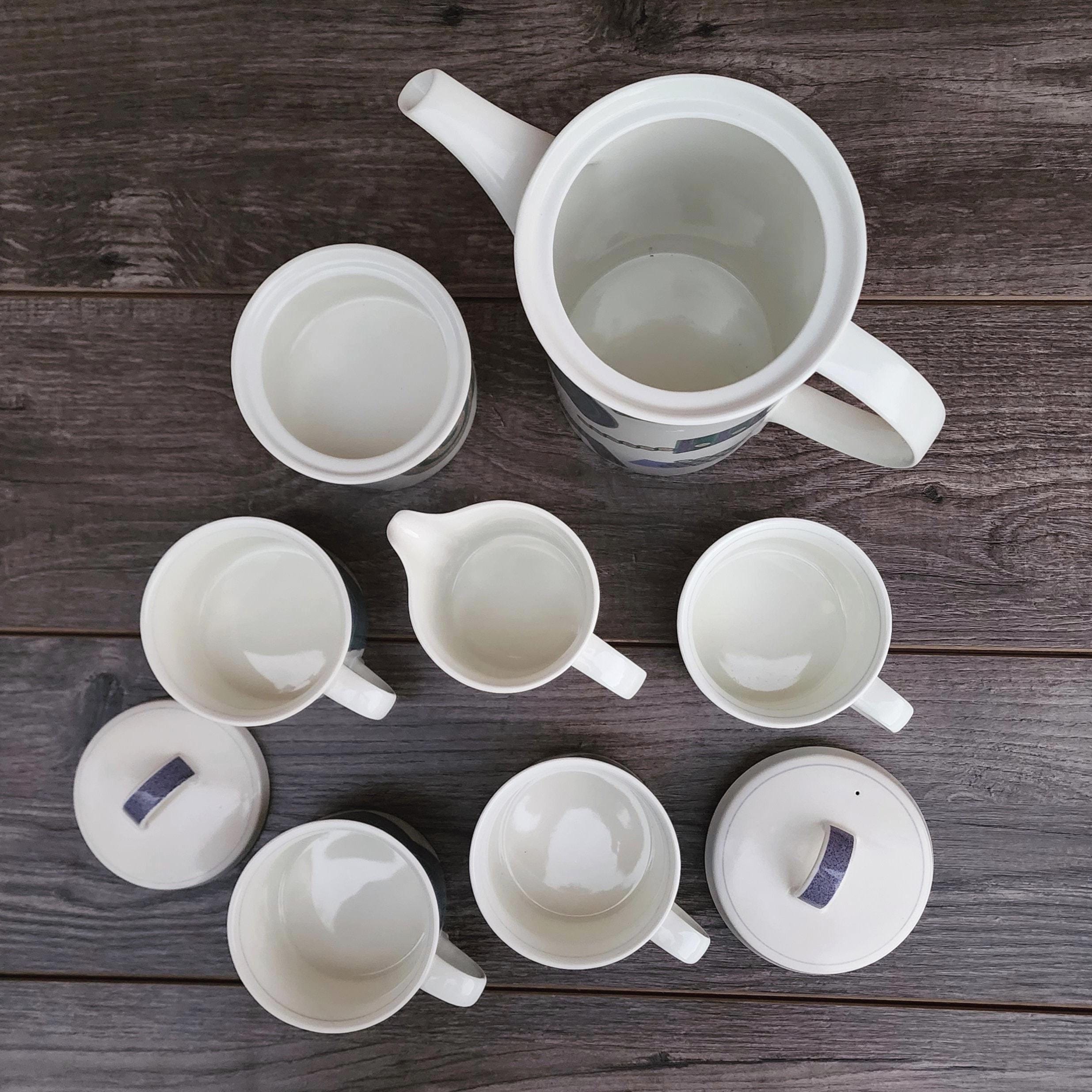 • Includes: Coffee pot with lid, sugar bowl with lid, creamer, 4 cups