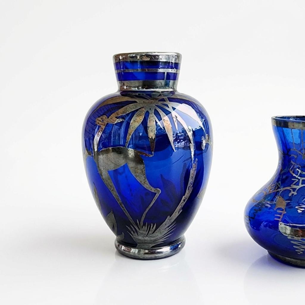 Mid Century Bohemian Mini Vase – Collectible Cobalt Glass Silver Overlay Deer Scene