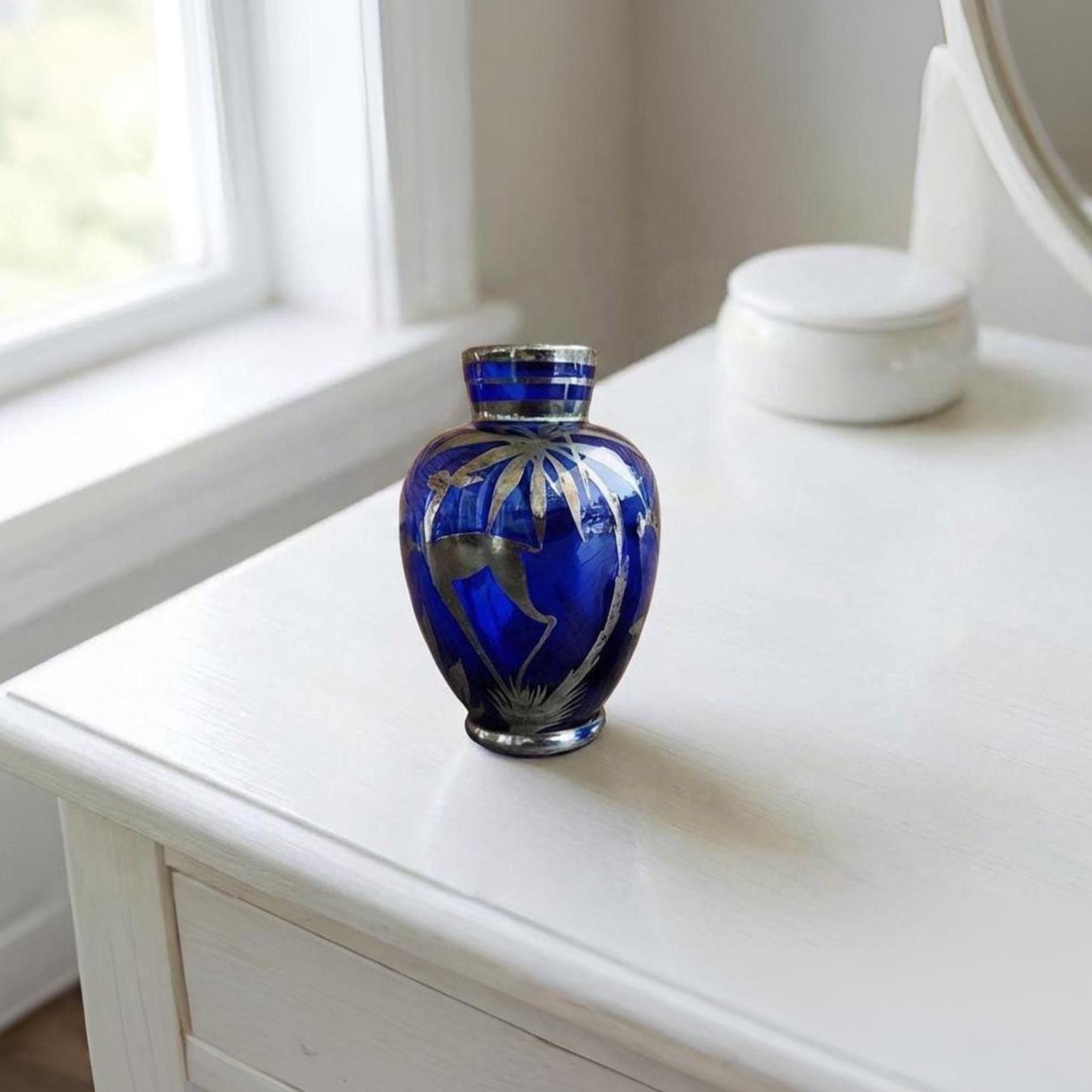 A mid-century Bohemian cobalt blue mini vase offering jewel-like display appeal, well suited to a sunlit windowsill, a single bloom on a side table, or placement within a curio cabinet. Finished with a silver-overlay deer and palm tree scene, this piece reflects the Bohemian tradition of richly colored glass paired with finely detailed figural decoration.