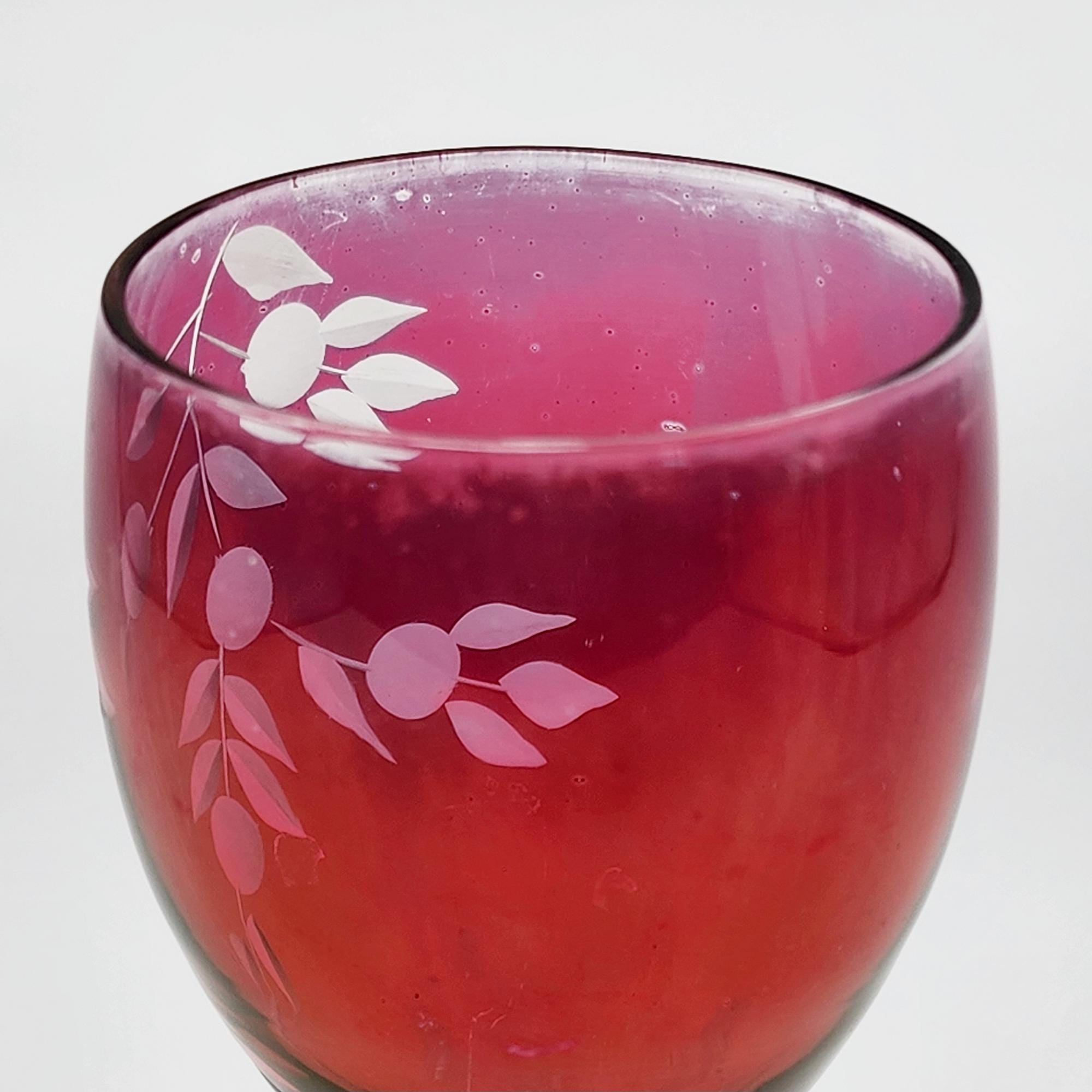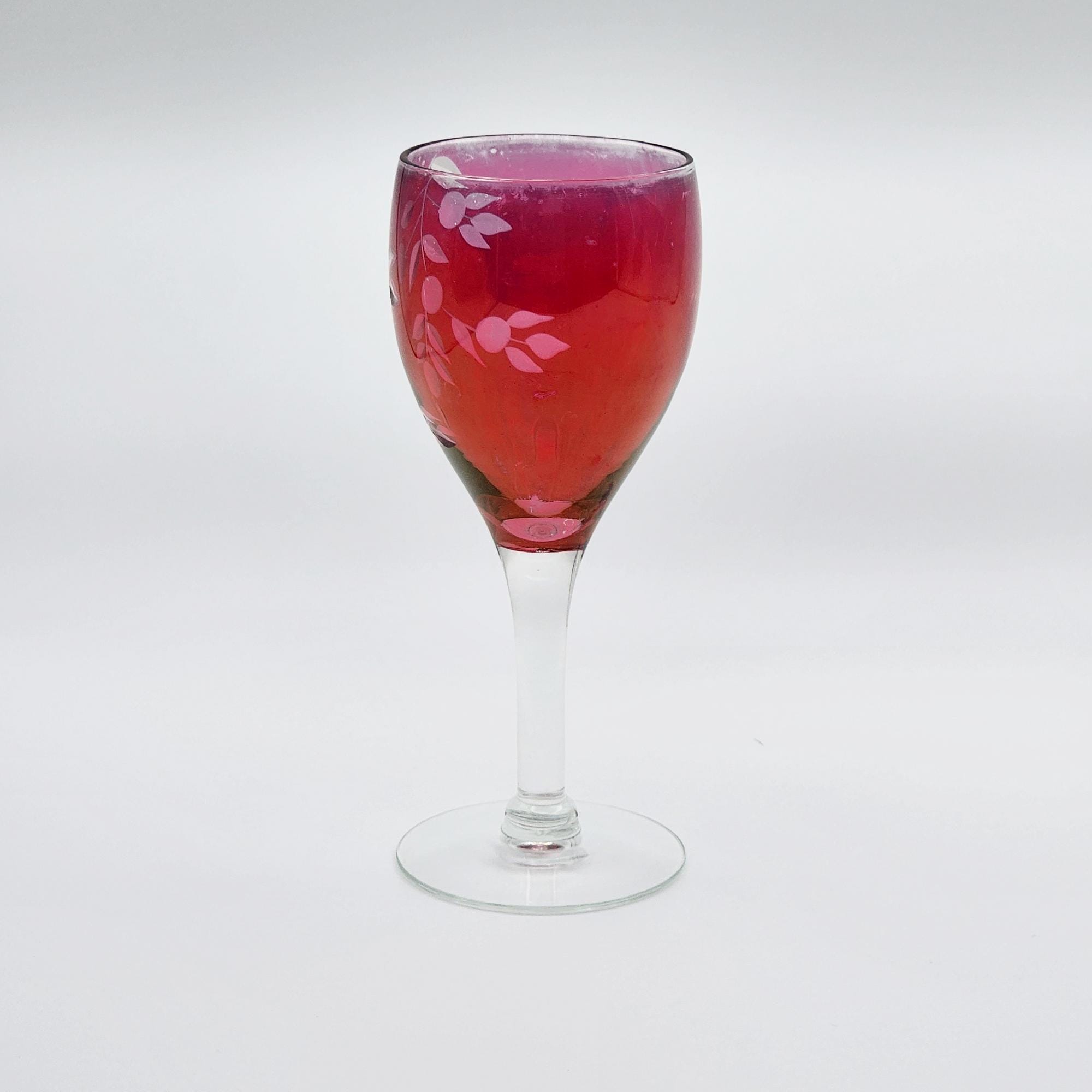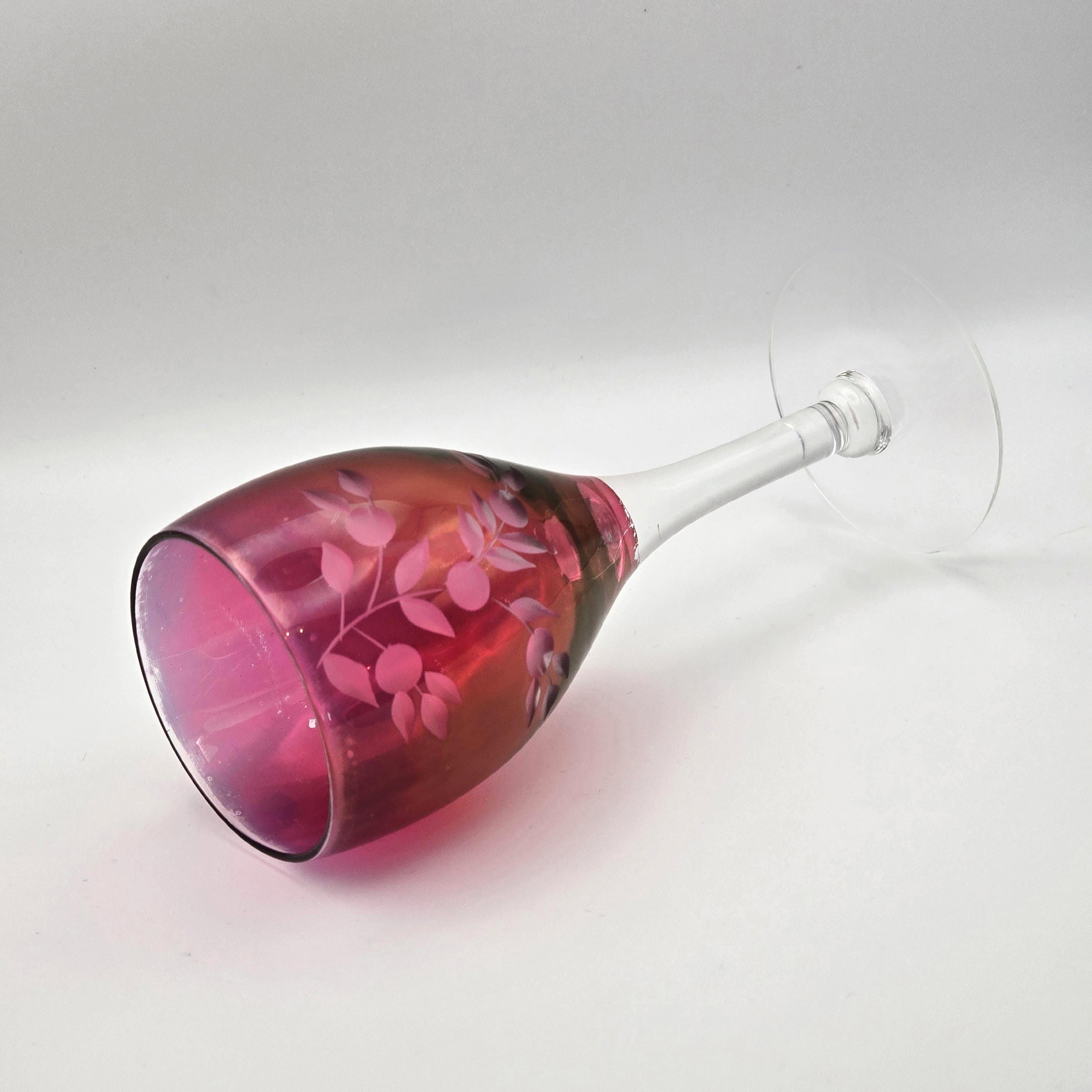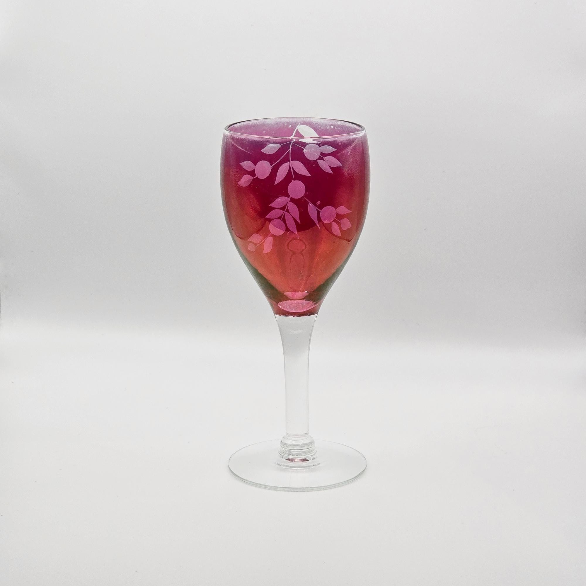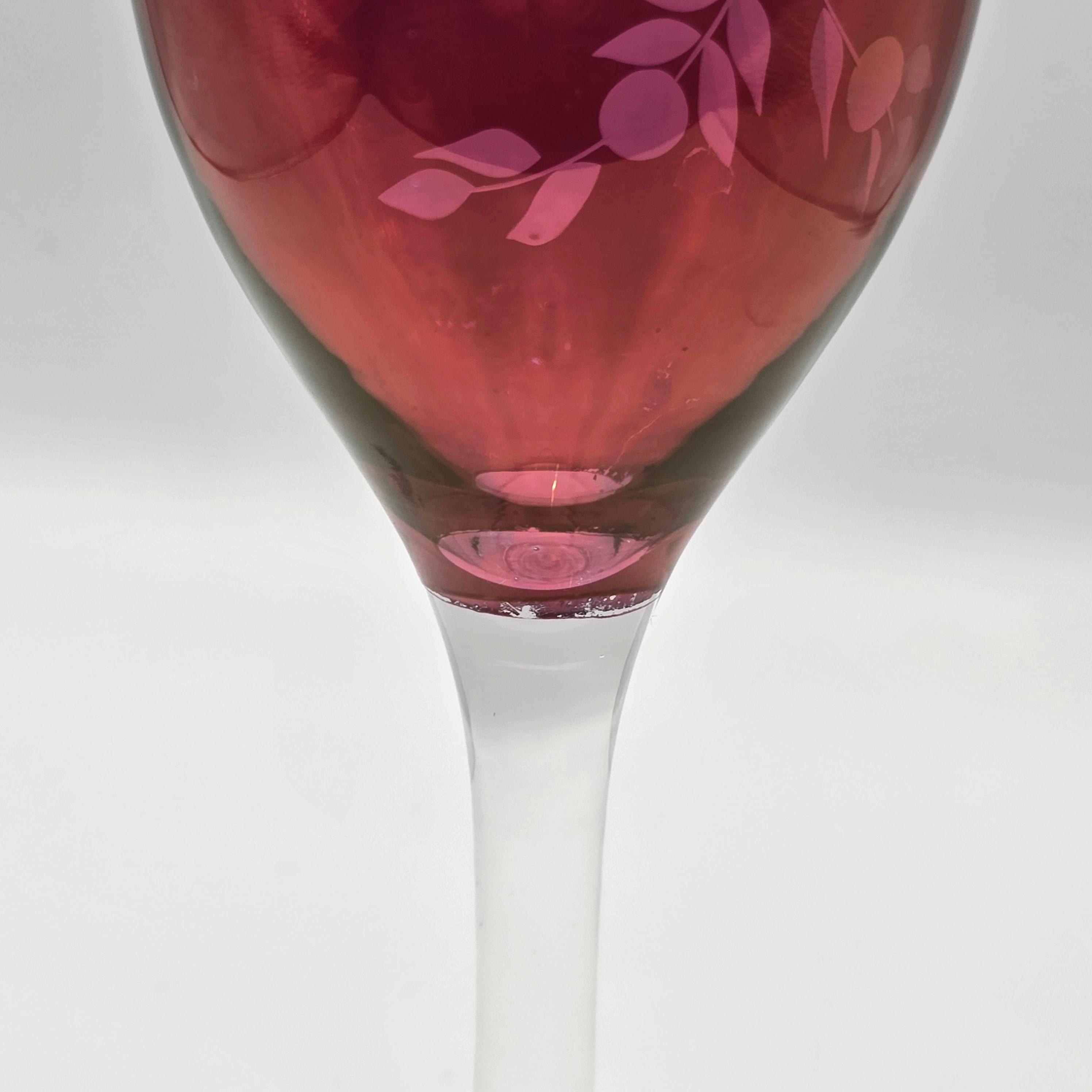 Ruby flash stemware gained popularity in the early 20th century for its decorative impact and approachable elegance. Etched botanical motifs like these were especially common during the 1930s–1940s. The style is consistent with European ruby flash stemware produced during the interwar period.