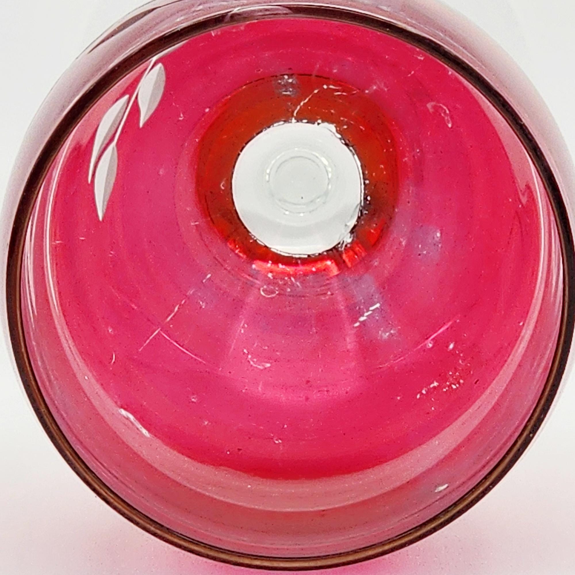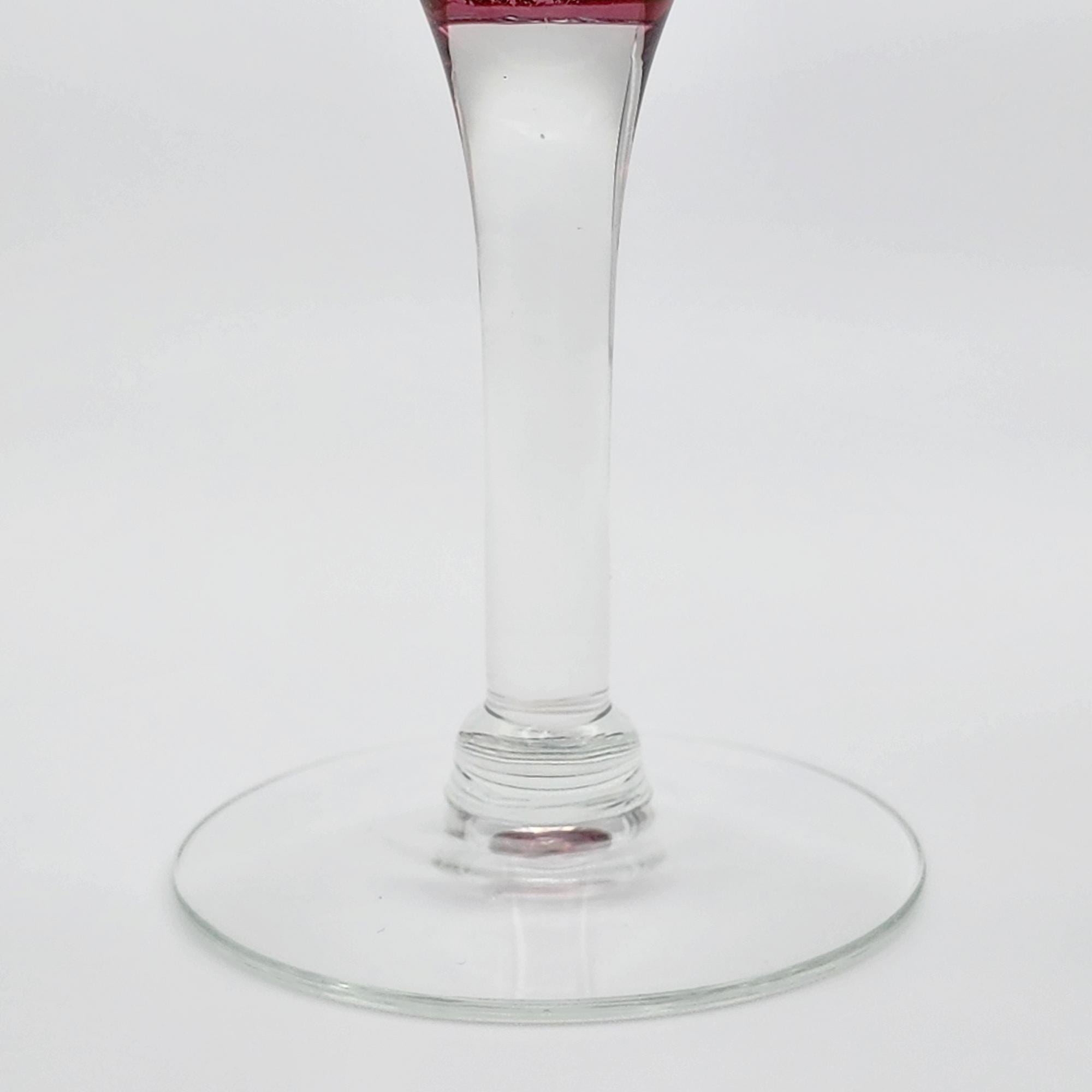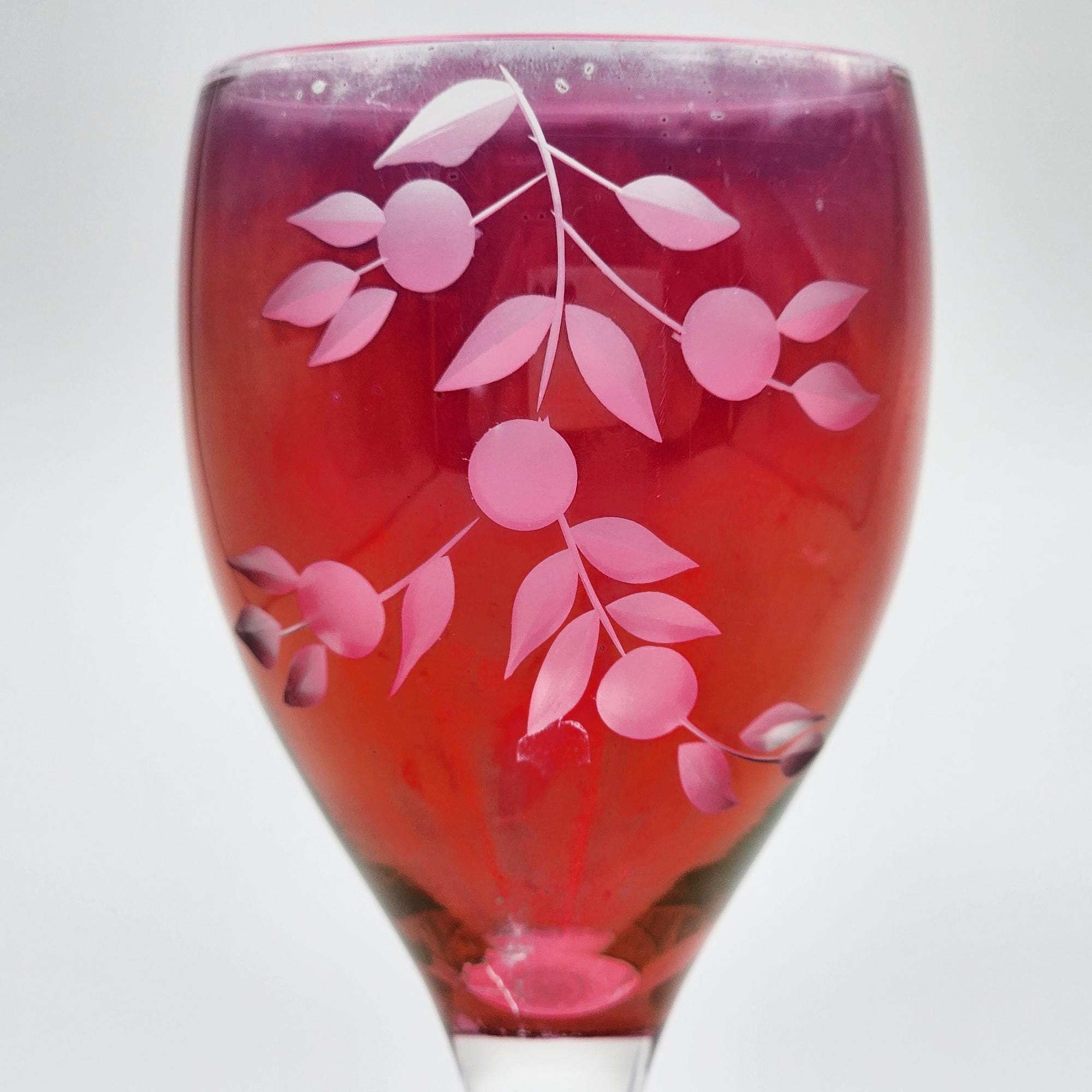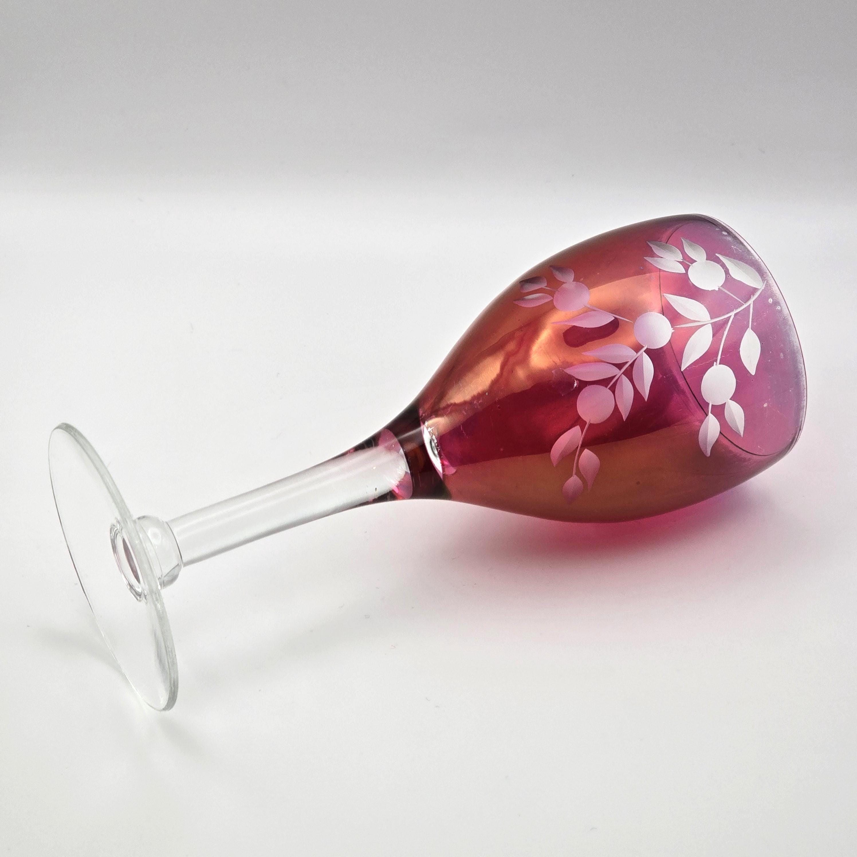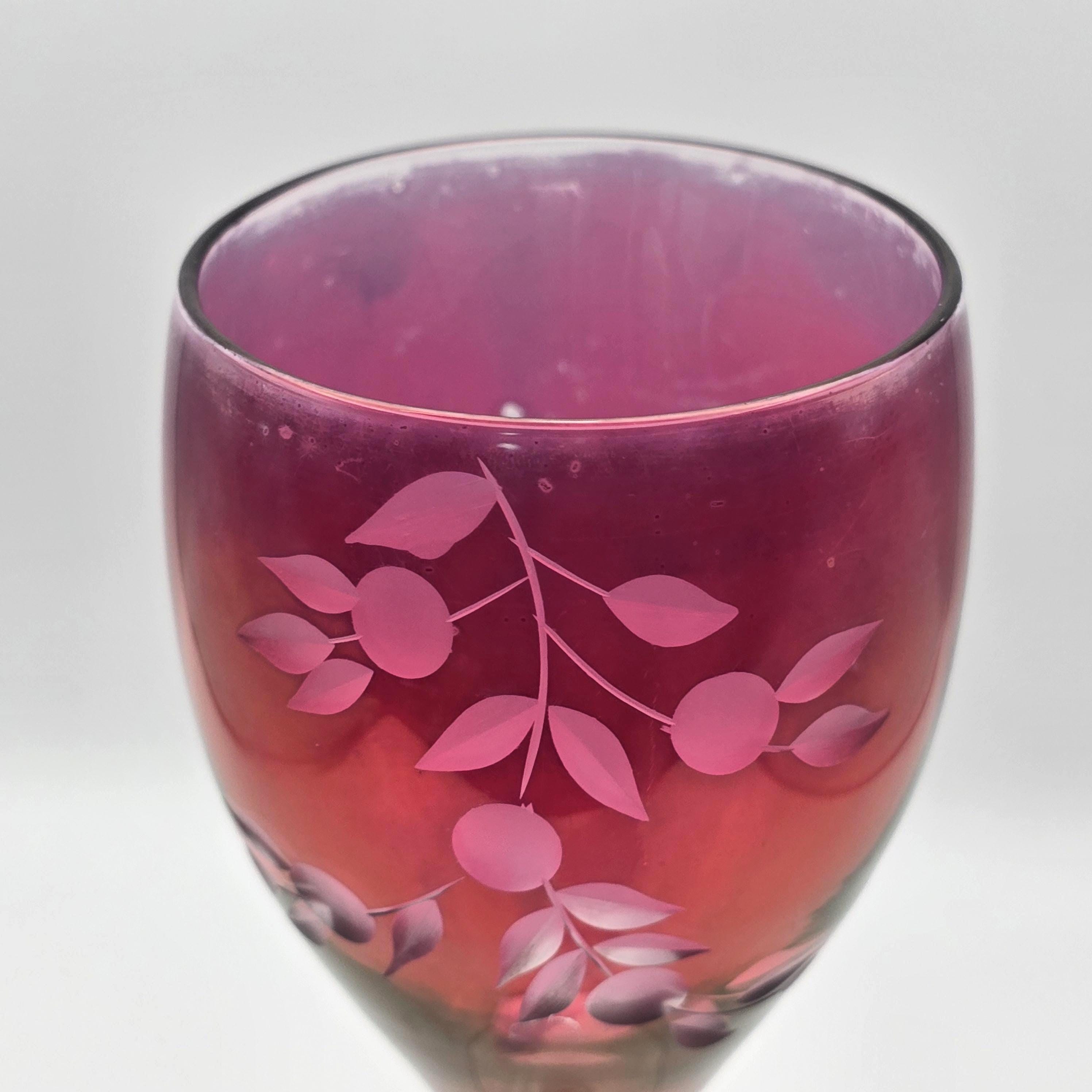 Ruby flash stemware gained popularity in the early 20th century for its decorative impact and approachable elegance. Etched botanical motifs like these were especially common during the 1930s–1940s. The style is consistent with European ruby flash stemware produced during the interwar period.