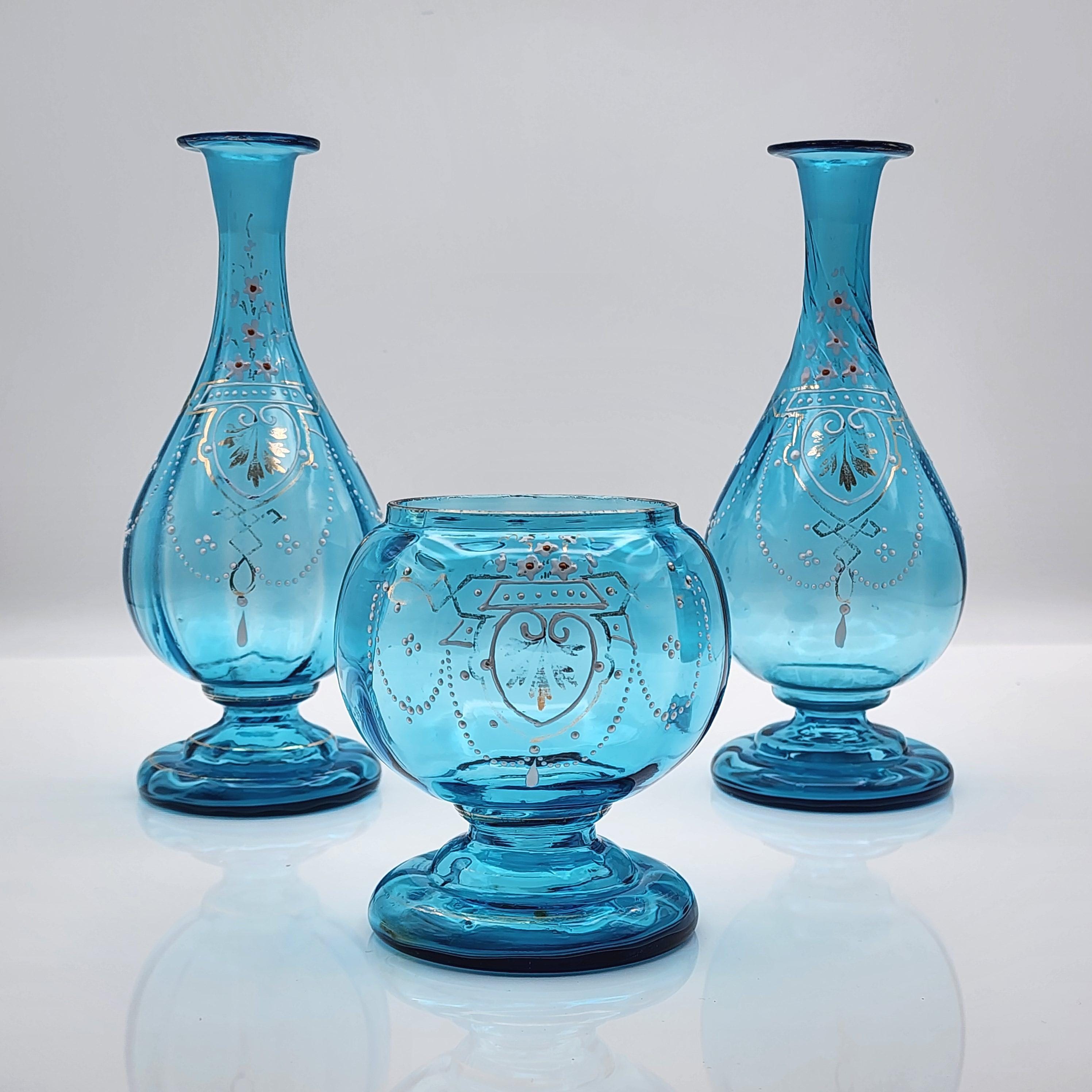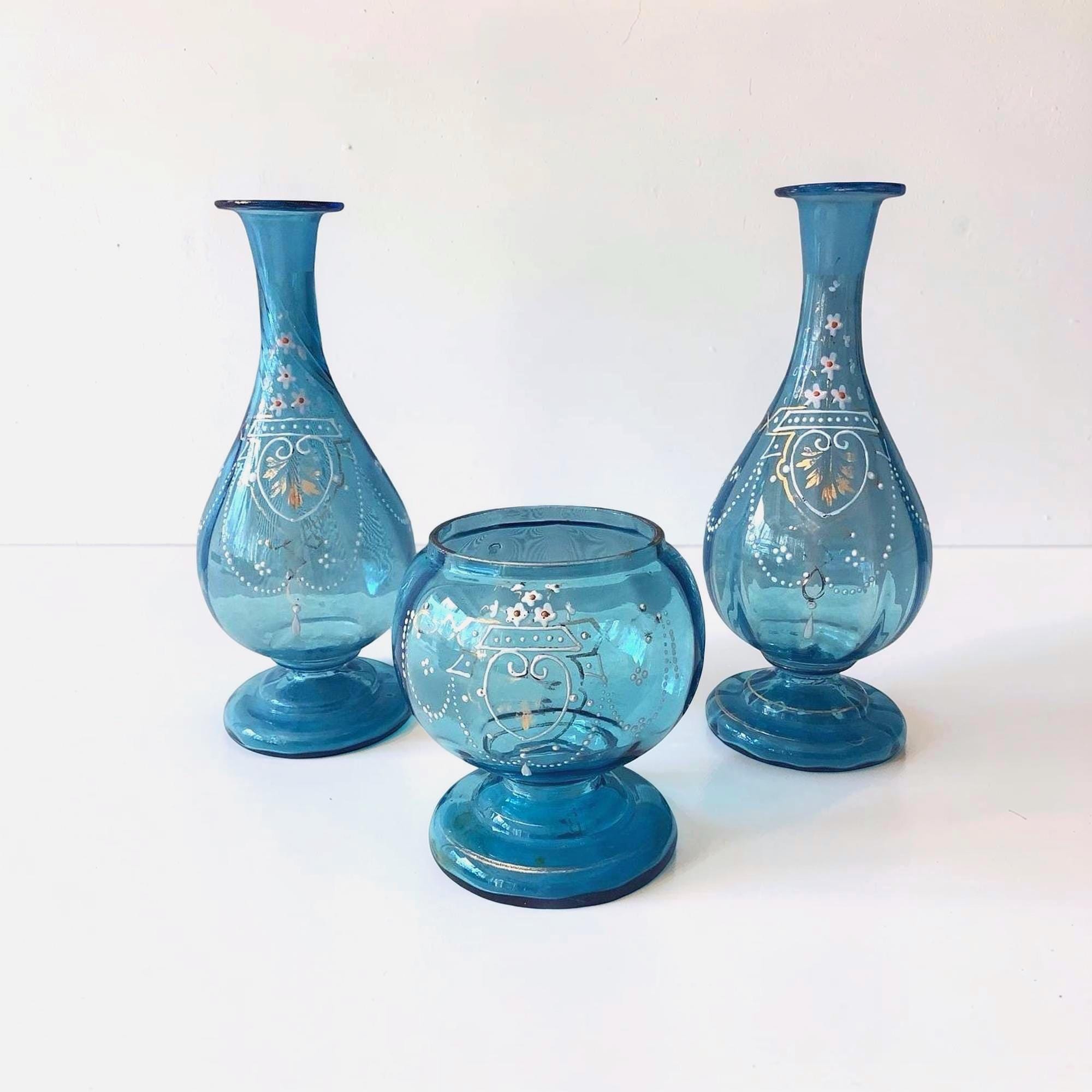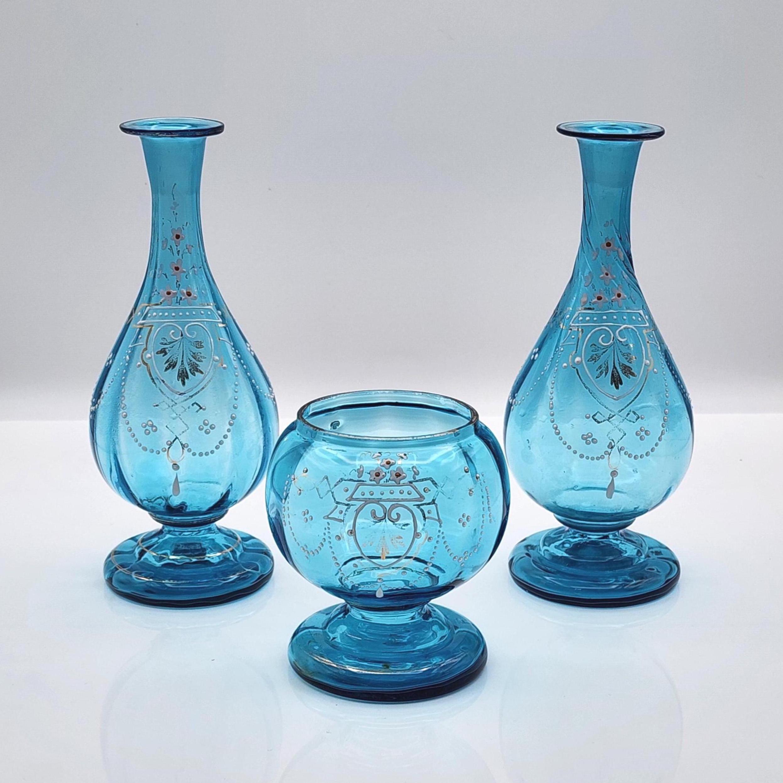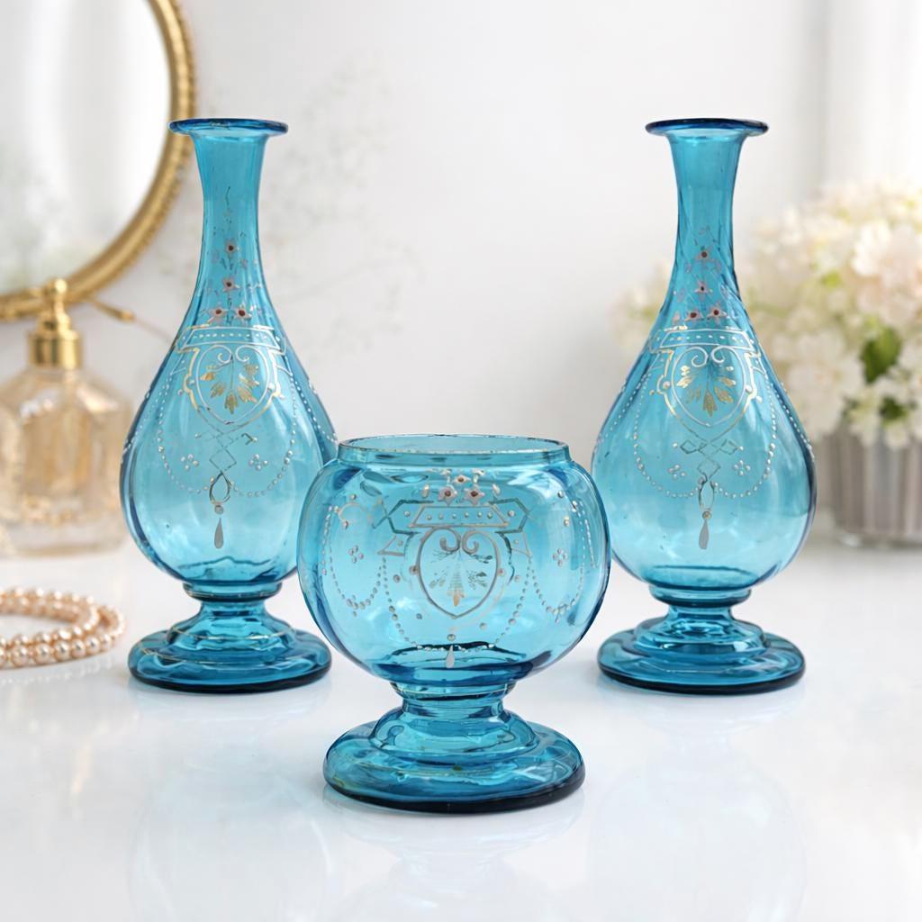 An antique three piece dressing table set in luminous aqua hand blown glass, attributed to the late nineteenth century. Comprising two elegant vases and a lidded vanity jar, each piece features delicate hand painted floral ornament and gilt accents, beautifully reflecting the decorative refinement of the Victorian era.