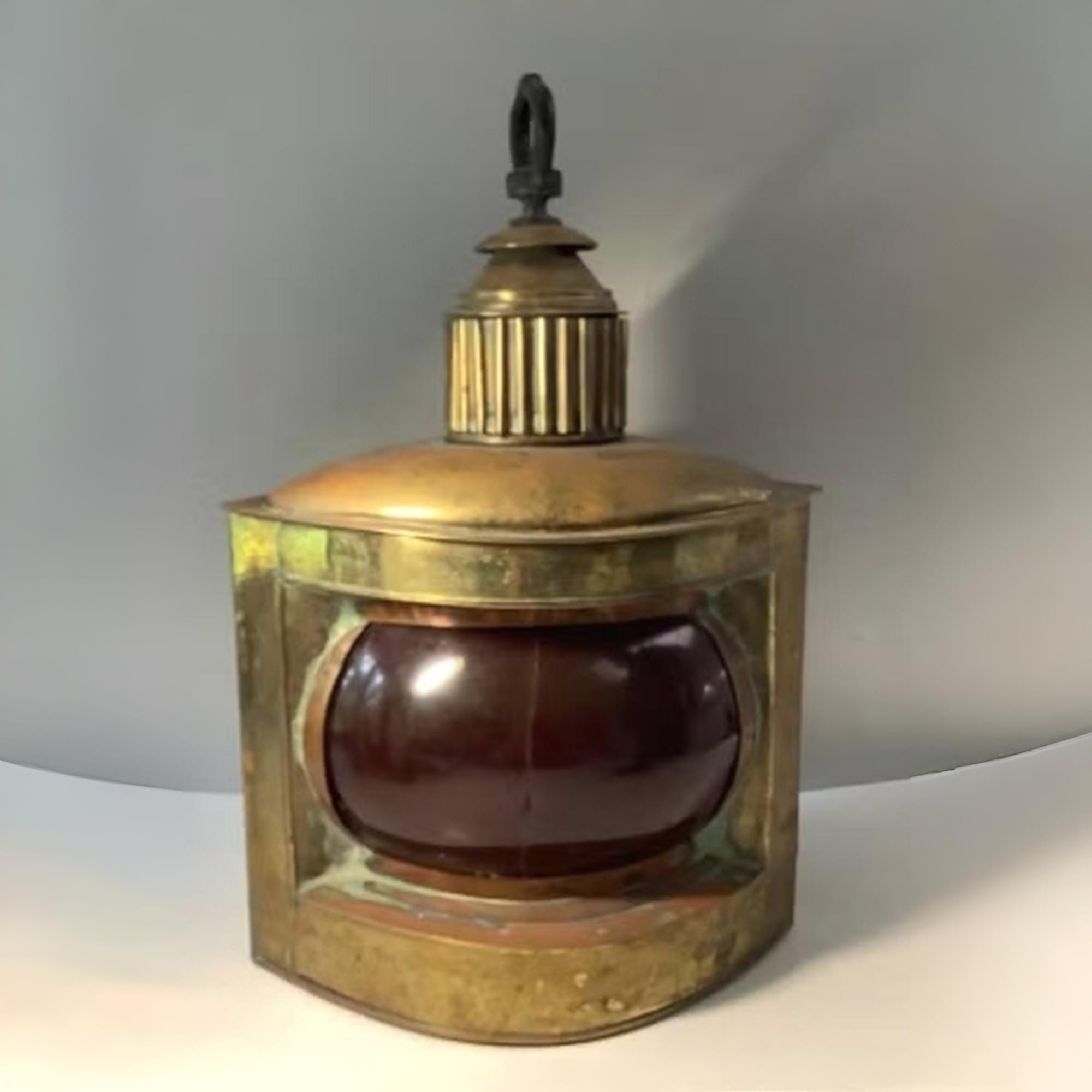 Red signal lanterns were mounted on a vessel’s port side to indicate position and direction, paired with green lanterns on the starboard side. Examples like this are valued today for their historic function, robust scale, and unmistakable nautical presence, making them desirable additions to maritime collections or coastal inspired interiors.