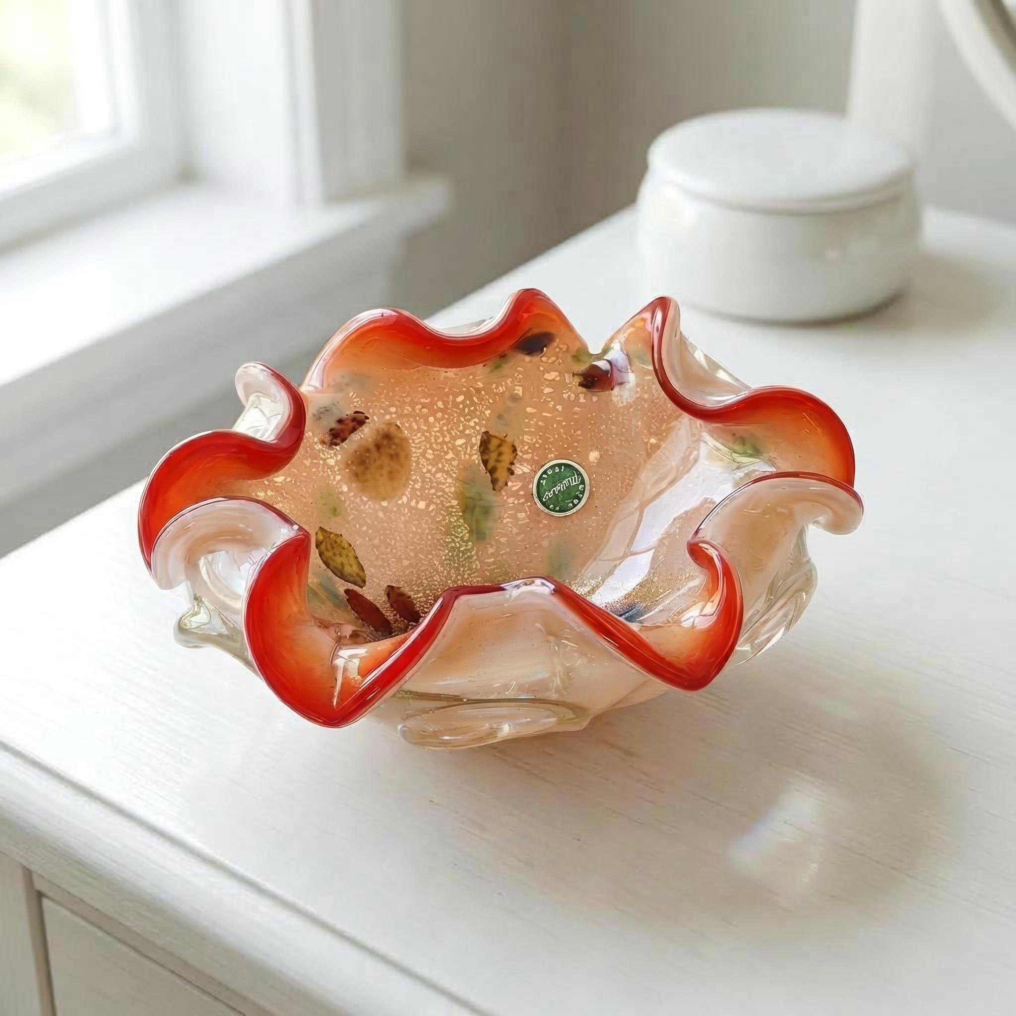 A mid-century Murano art glass bowl featuring a warm ivory-toned core with multi-colour Tutti Frutti spatter and fine aventurine flecking, framed by a bold hand-formed red rim highlighting expressive Italian glassmaking. Designed to serve as a candy dish, vide-poche, or sculptural display piece.