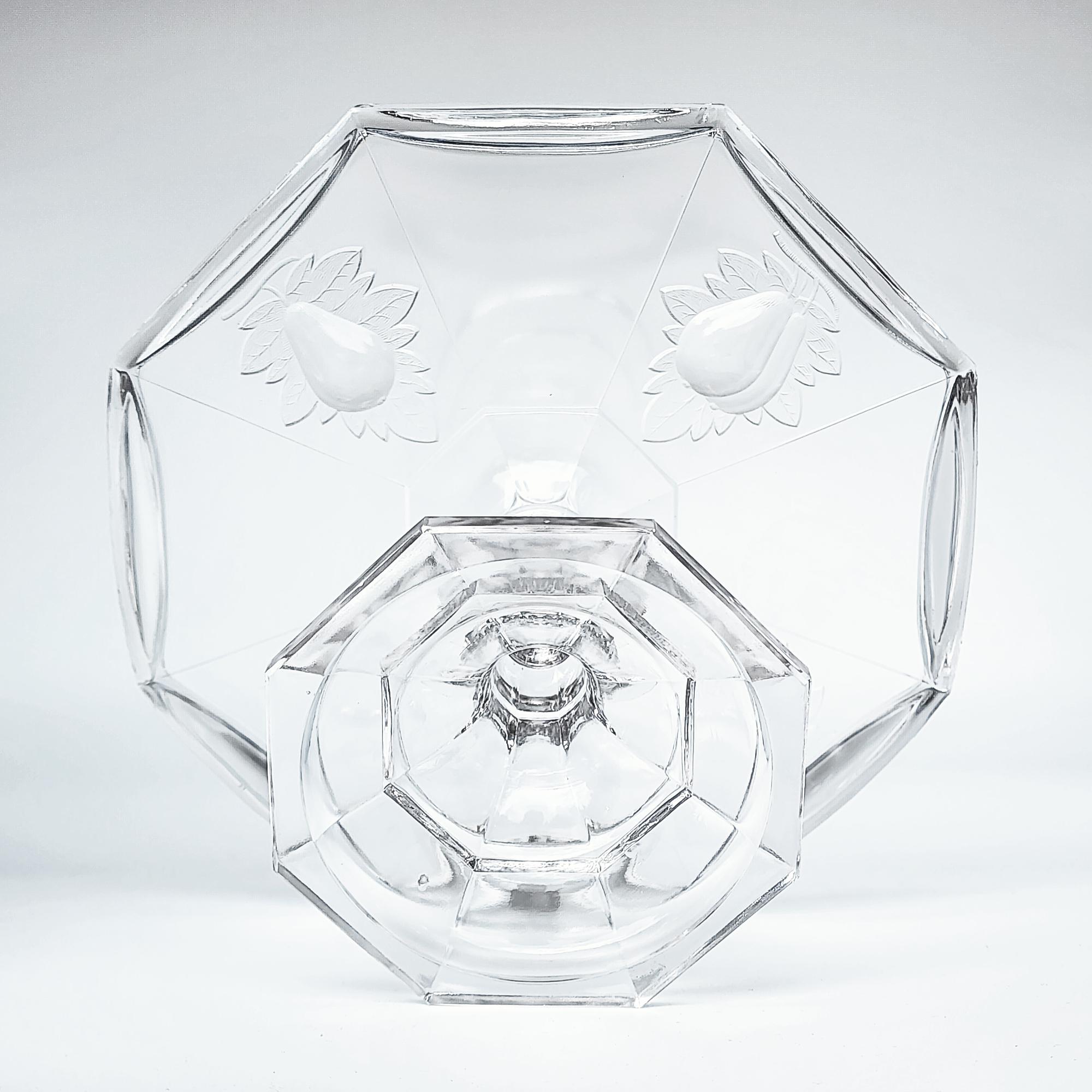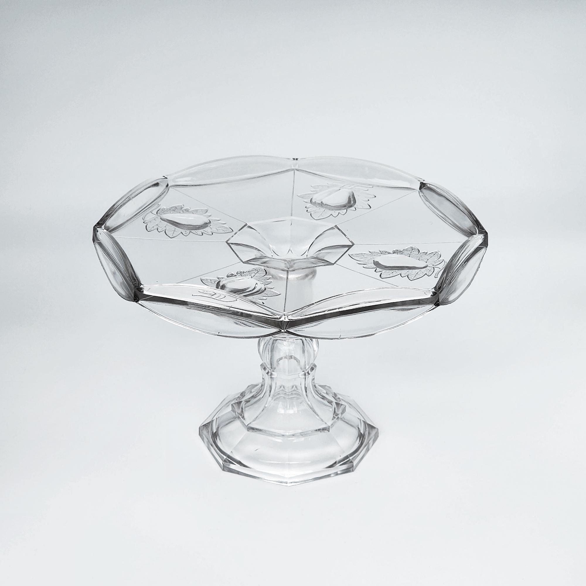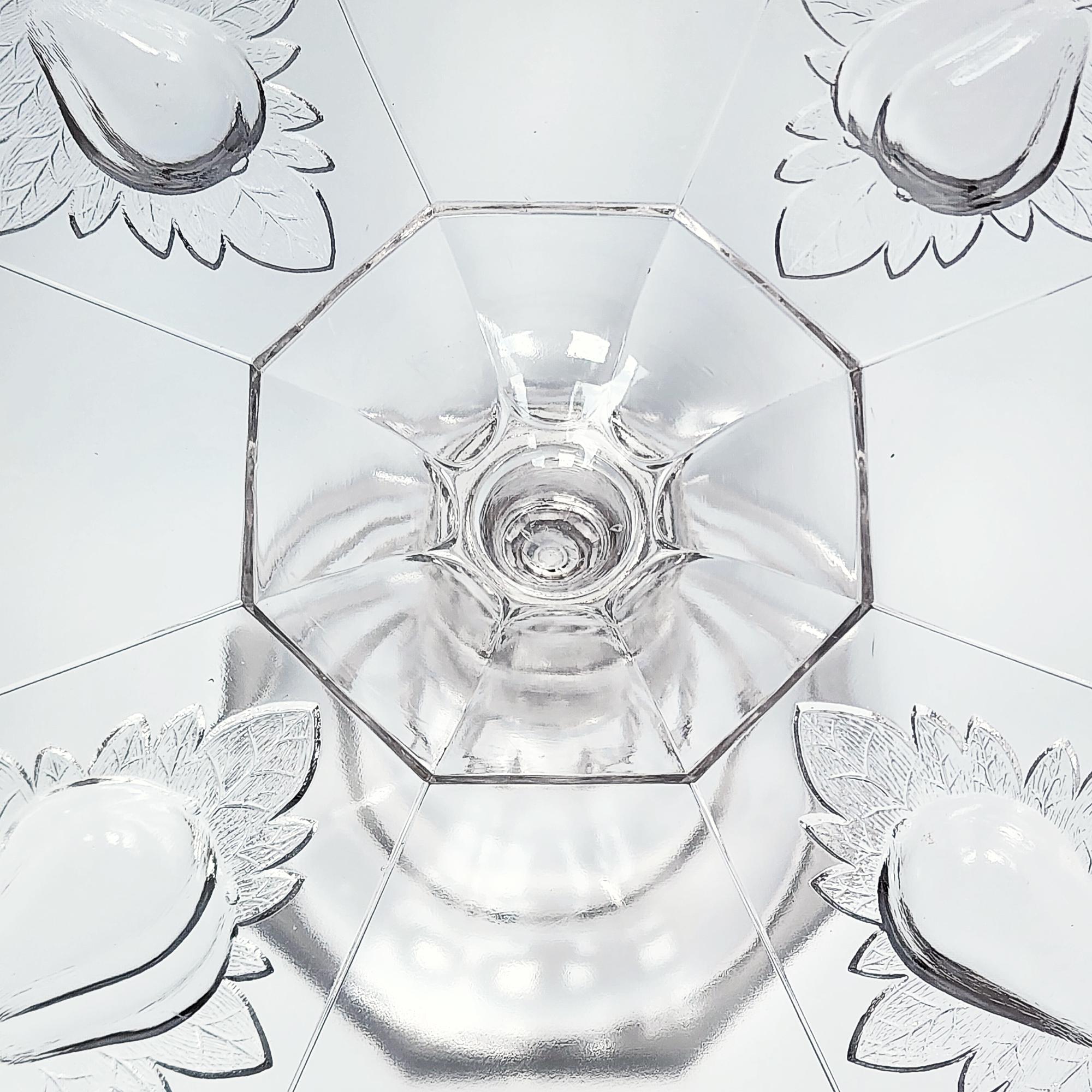 An antique Adams Baltimore Pear “Gipsy” pedestal cake stand in early American pattern glass, dating to the 1870s. The raised pear motif, symbolizing abundance and hospitality, encircles the bowl above a faceted pedestal base, exemplifying the bold relief and clarity characteristic of late 19th-century pressed glass. Suitable for cakes, pastries, or fruit, it serves equally well as a Victorian display centerpiece.