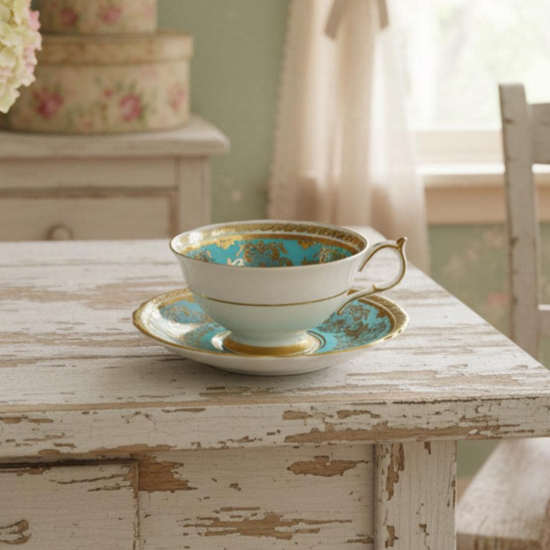 A vintage tea set, produced by Paragon in England, featuring a richly detailed turquoise interior bordered with hand-applied gold scrollwork and a softly fluted white exterior accented by a gilt-edged handle and rim.