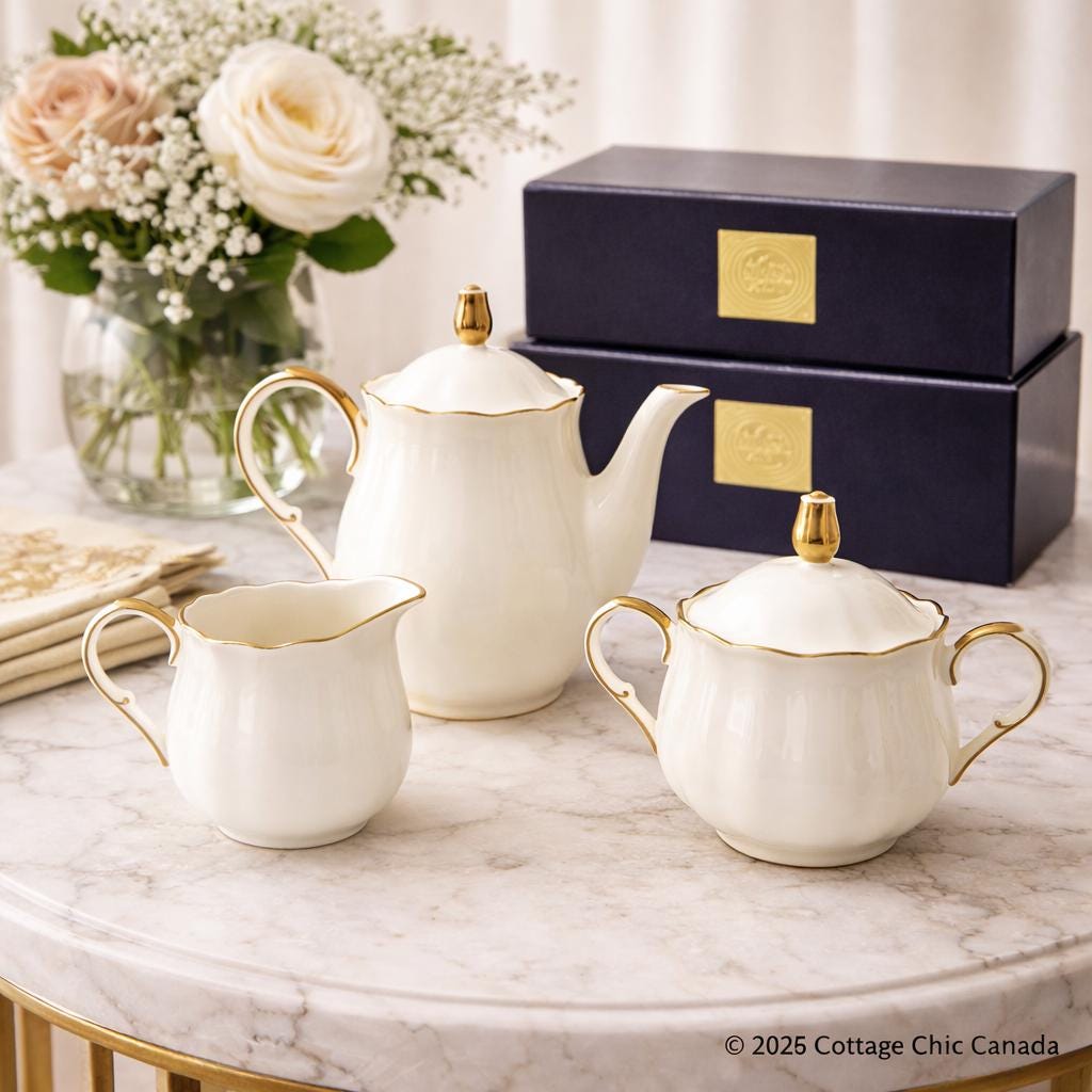 • Mini coffee pot with lid, creamer, and covered sugar bowl