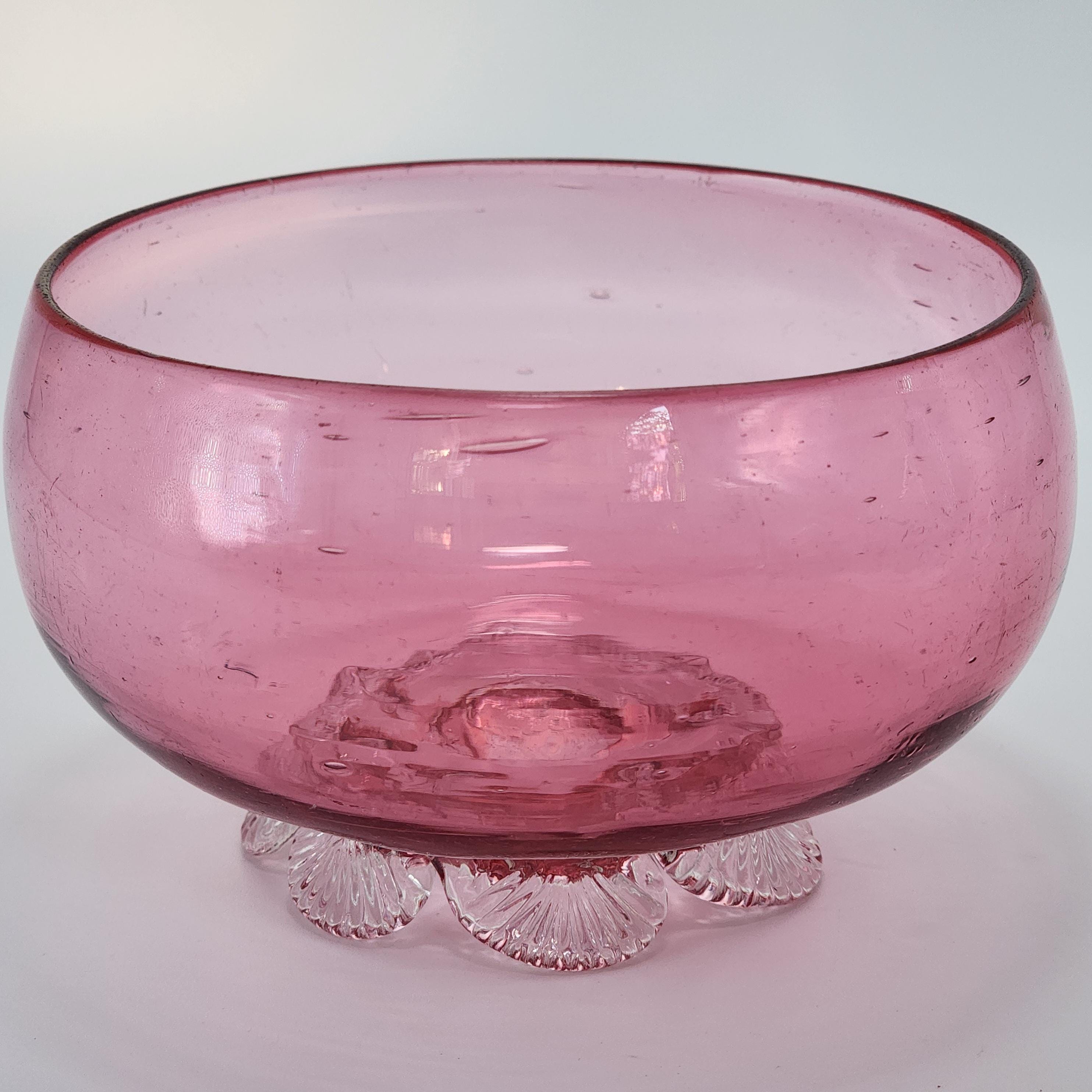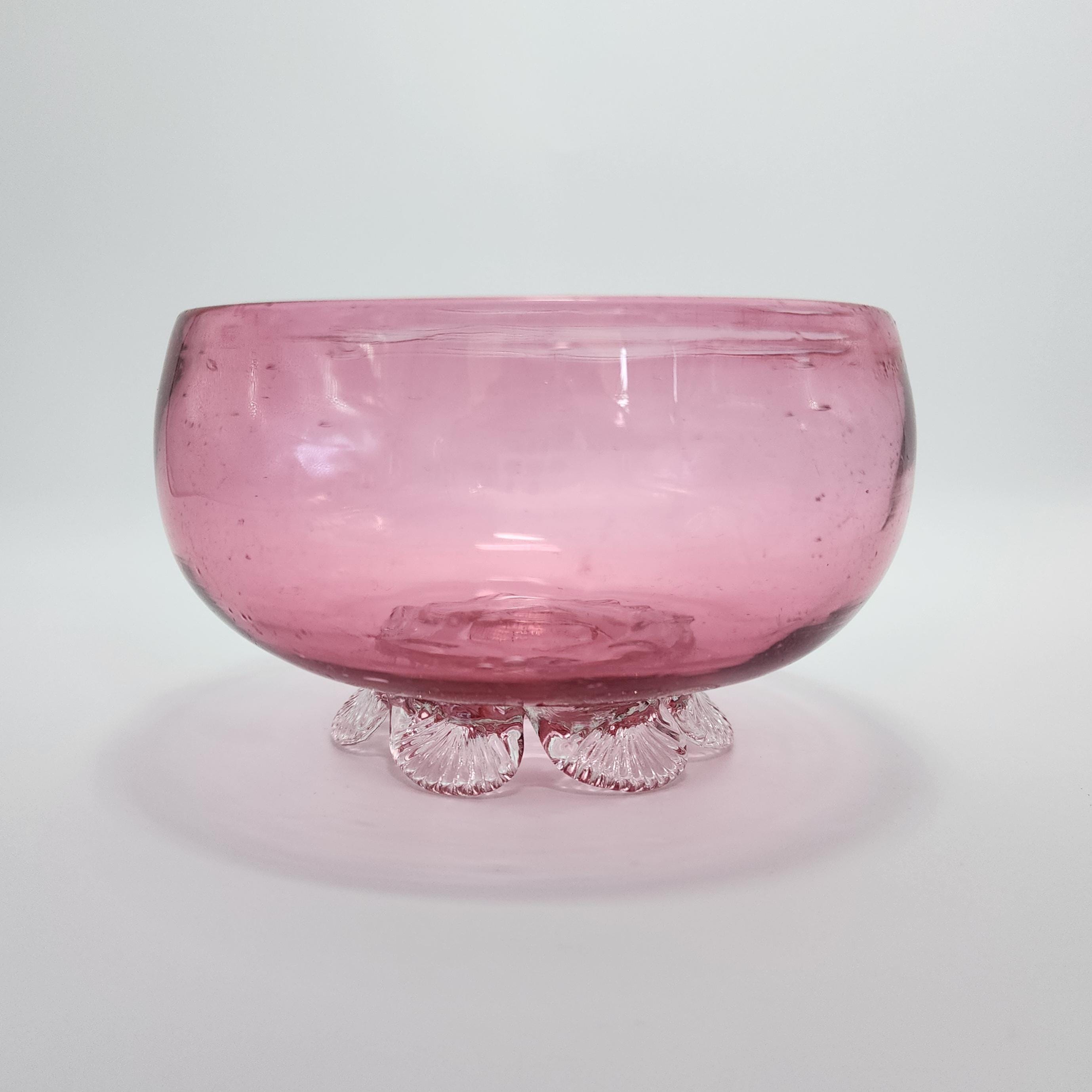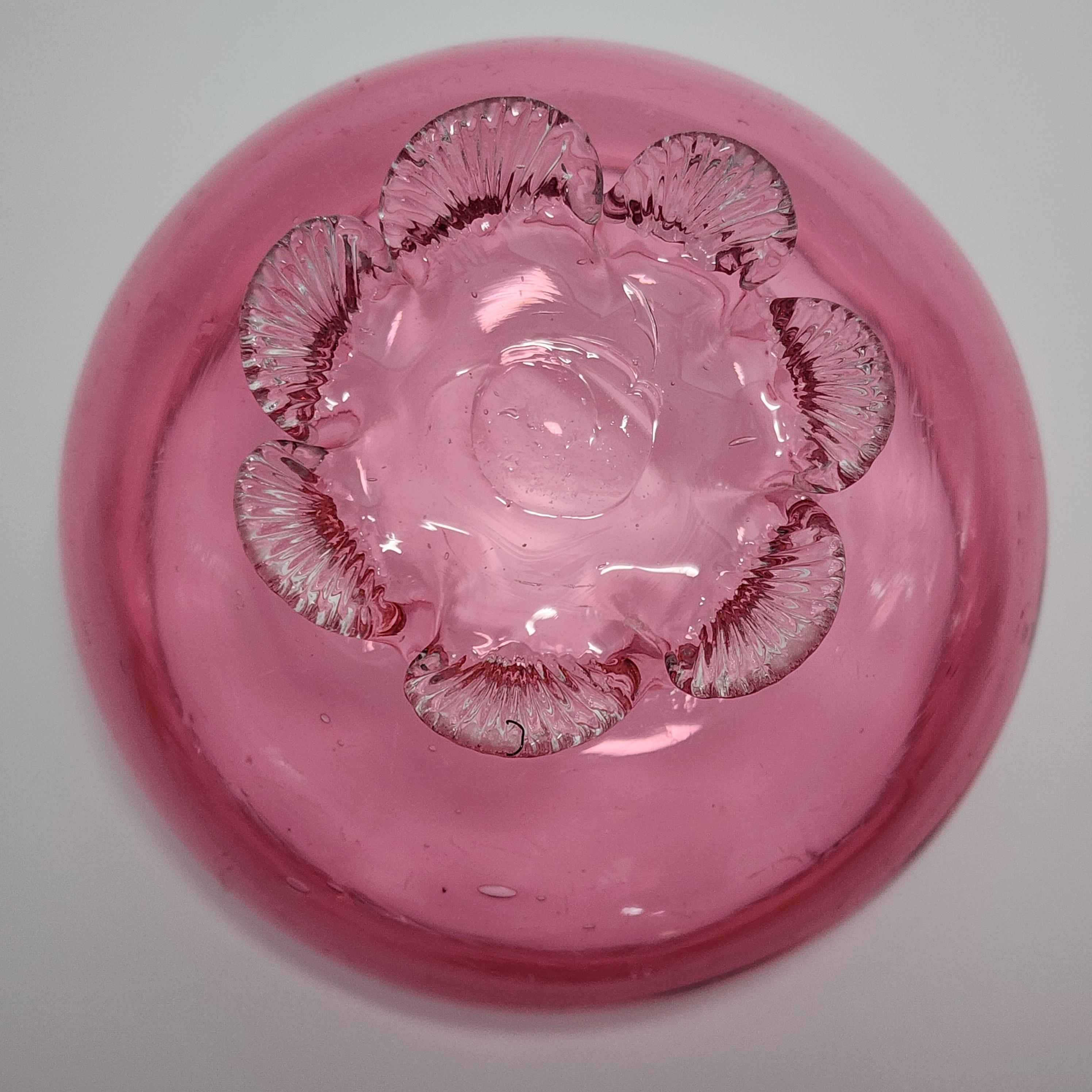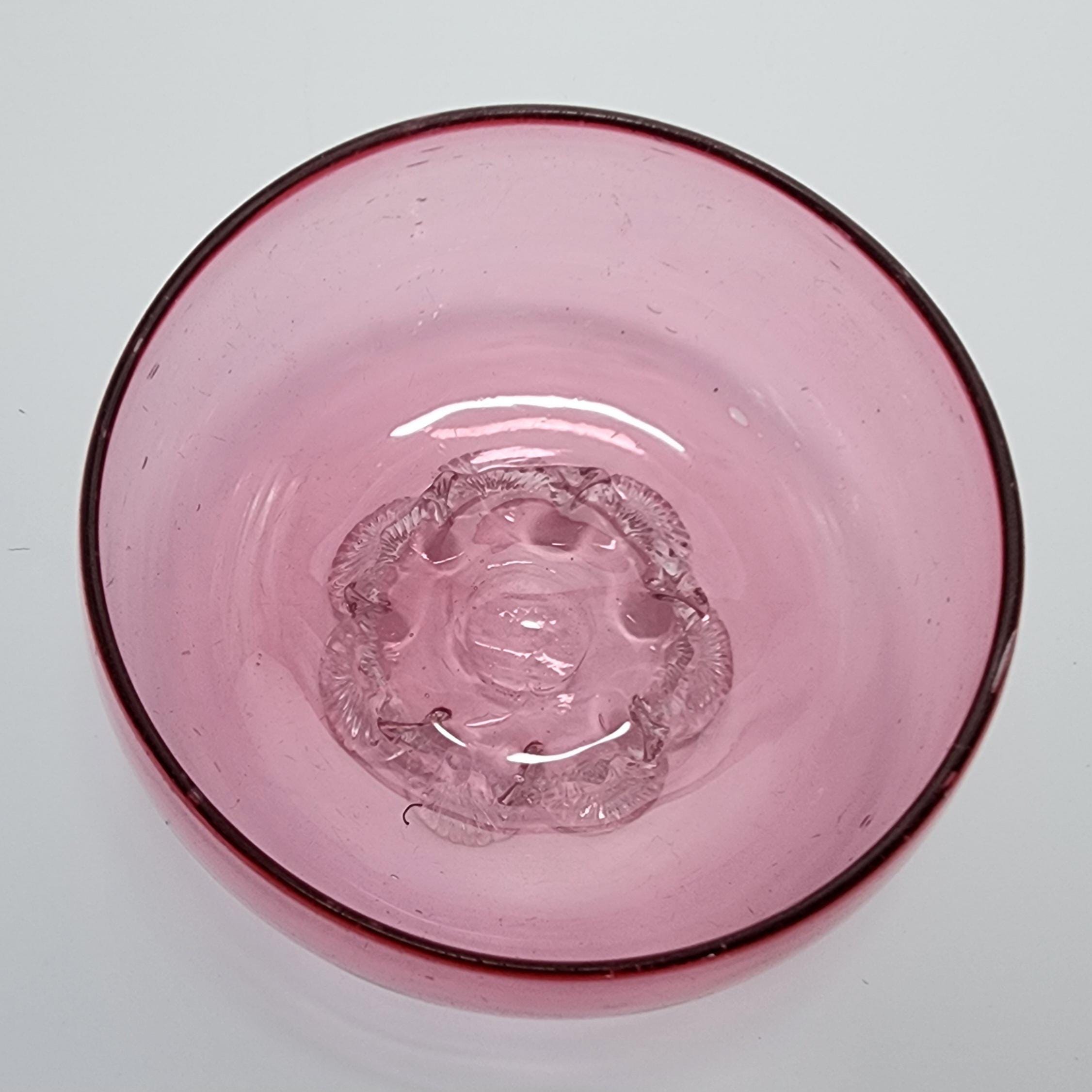 An antique Victorian pink cranberry glass dish with a softly scalloped base and luminous hand blown body. Its rich tone shifts beautifully with light, appearing cool and translucent against pale settings and deepening to a warmer rose in ambient surroundings, a natural characteristic of authentic cranberry glass.