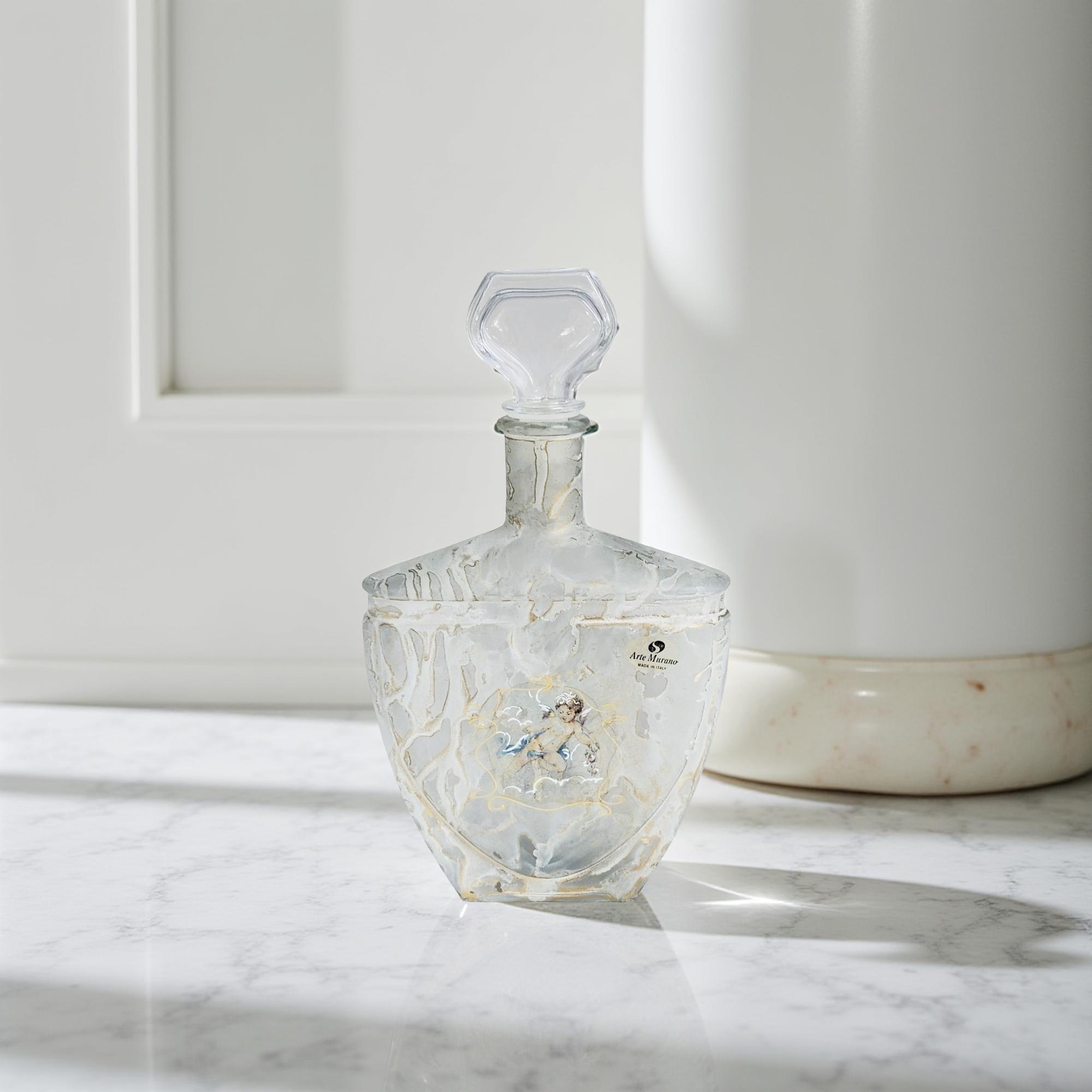 Creazioni Silvestri produced decorative glass under the Arte Murano label, supplying international markets during the 1970s and 1980s revival of classical and Art Deco–inspired forms. This decanter reflects that period’s emphasis on clarity, sculptural balance, and ornamental detailing, including subtle marbling and gilt decoration with a classical cherub motif. The incised letter “S” confirms Silvestri studio production, a mark commonly associated with pieces marketed to North American luxury retailers.