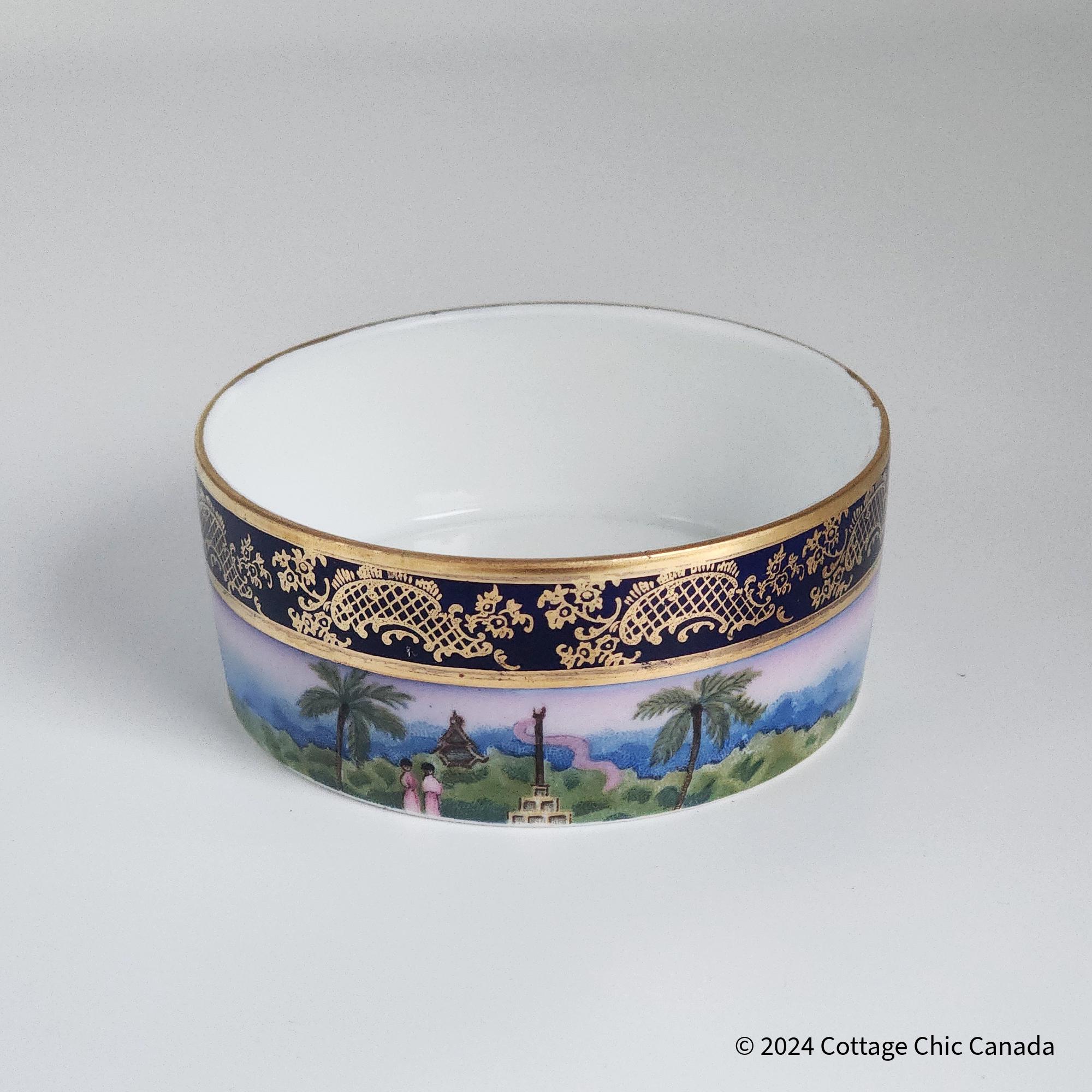 Hand-painted porcelain pieces like this one are admired for their craftsmanship and individuality, where each brushstroke reveals the maker’s skill. The cobalt and gilt border reflects both European and Asian design influences from the early to mid-20th century.