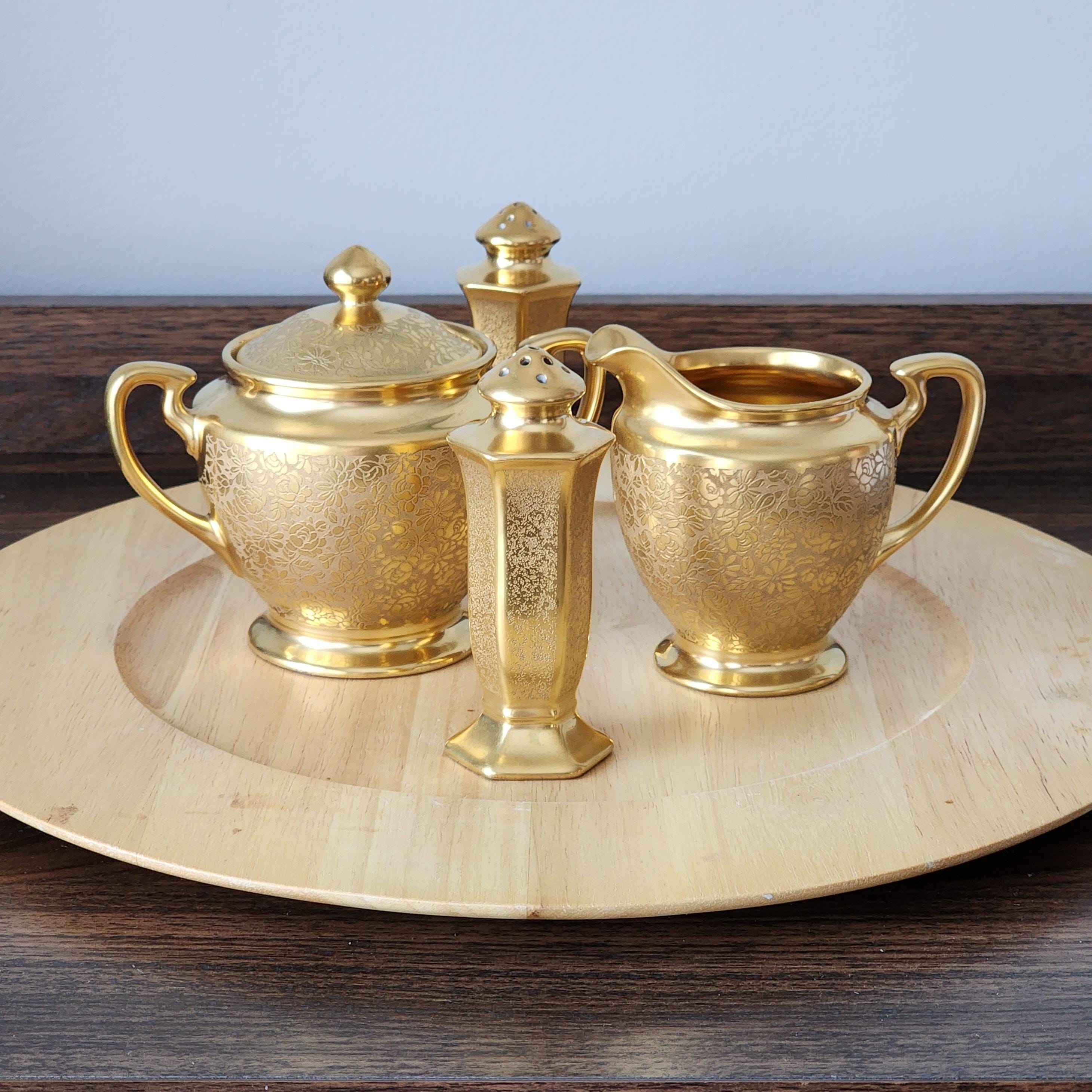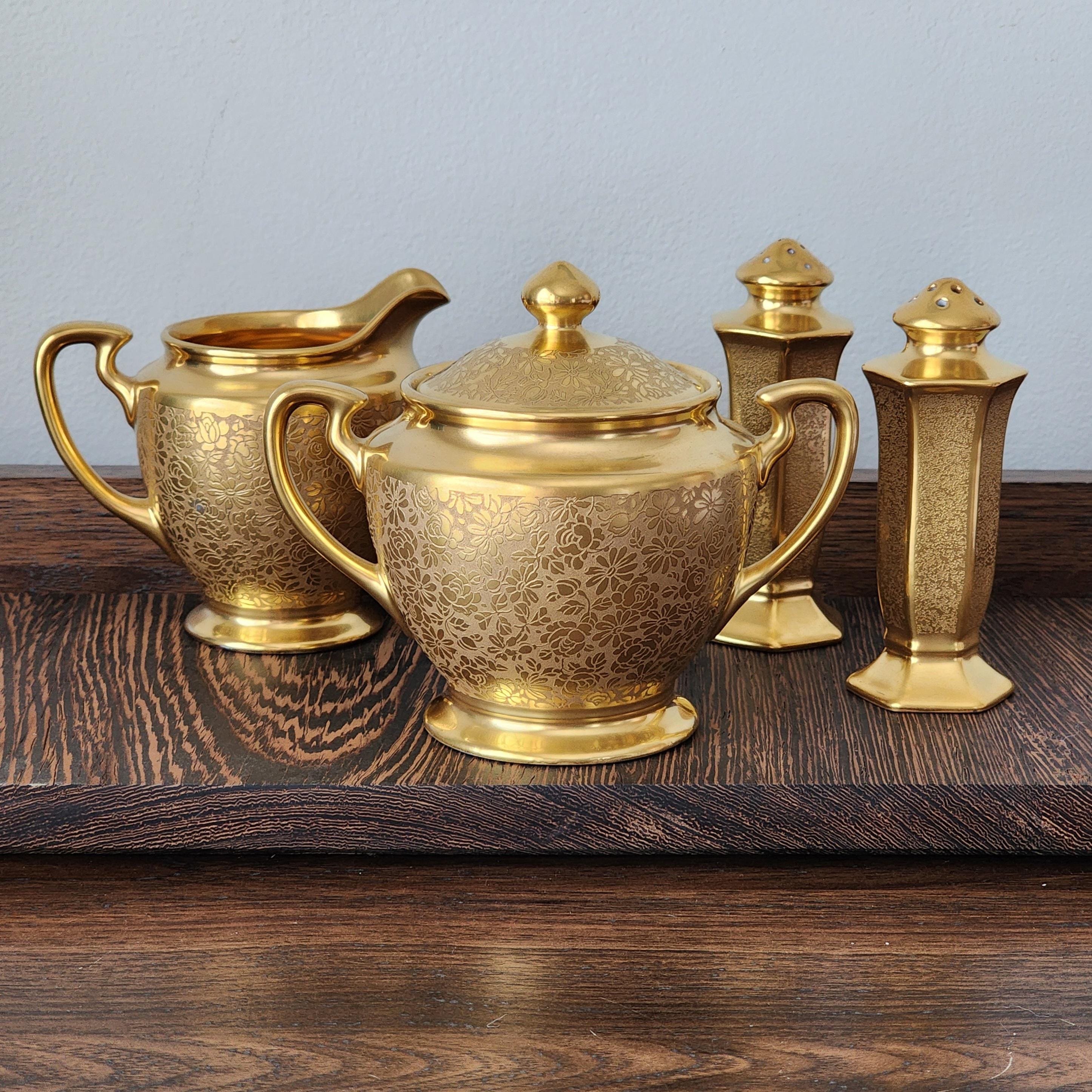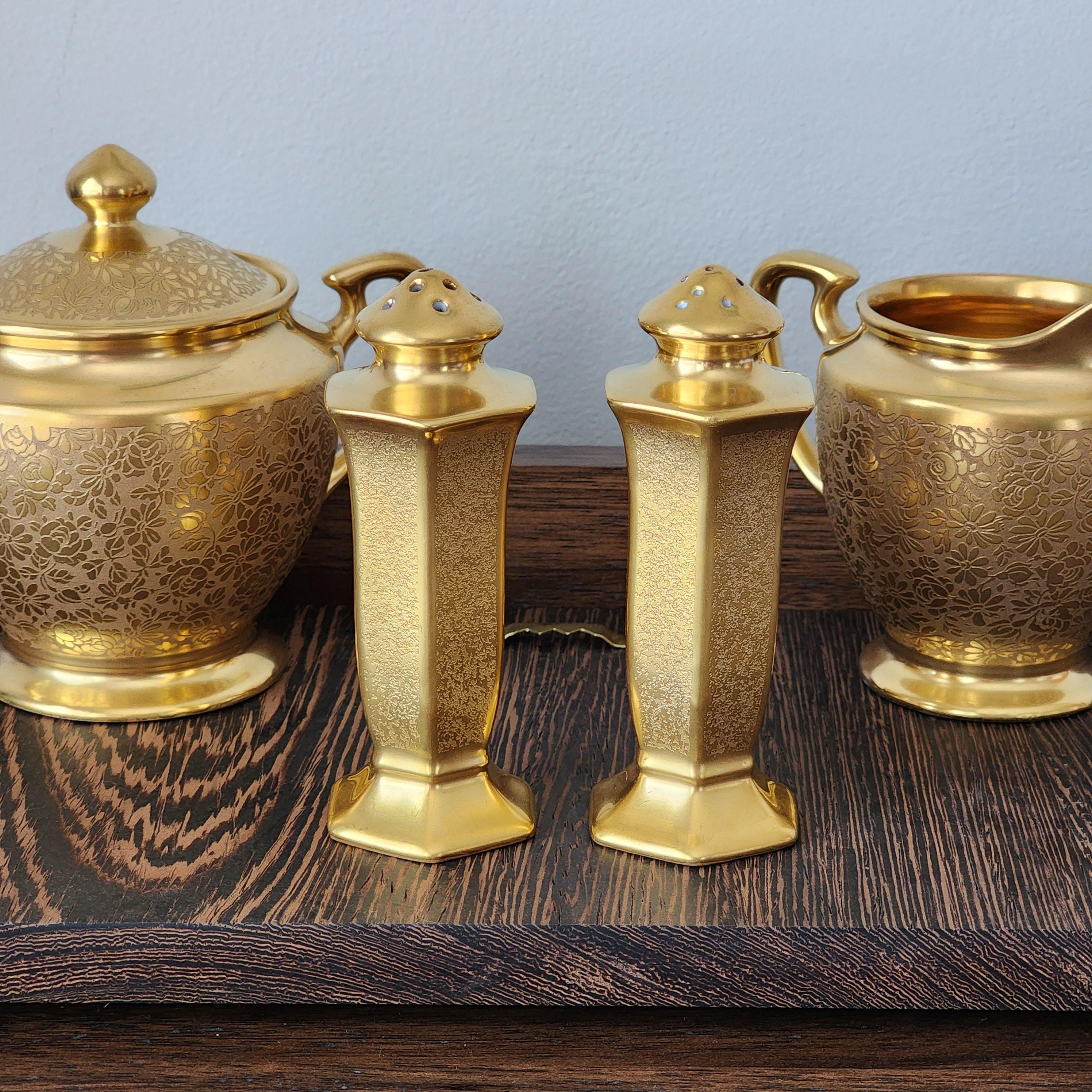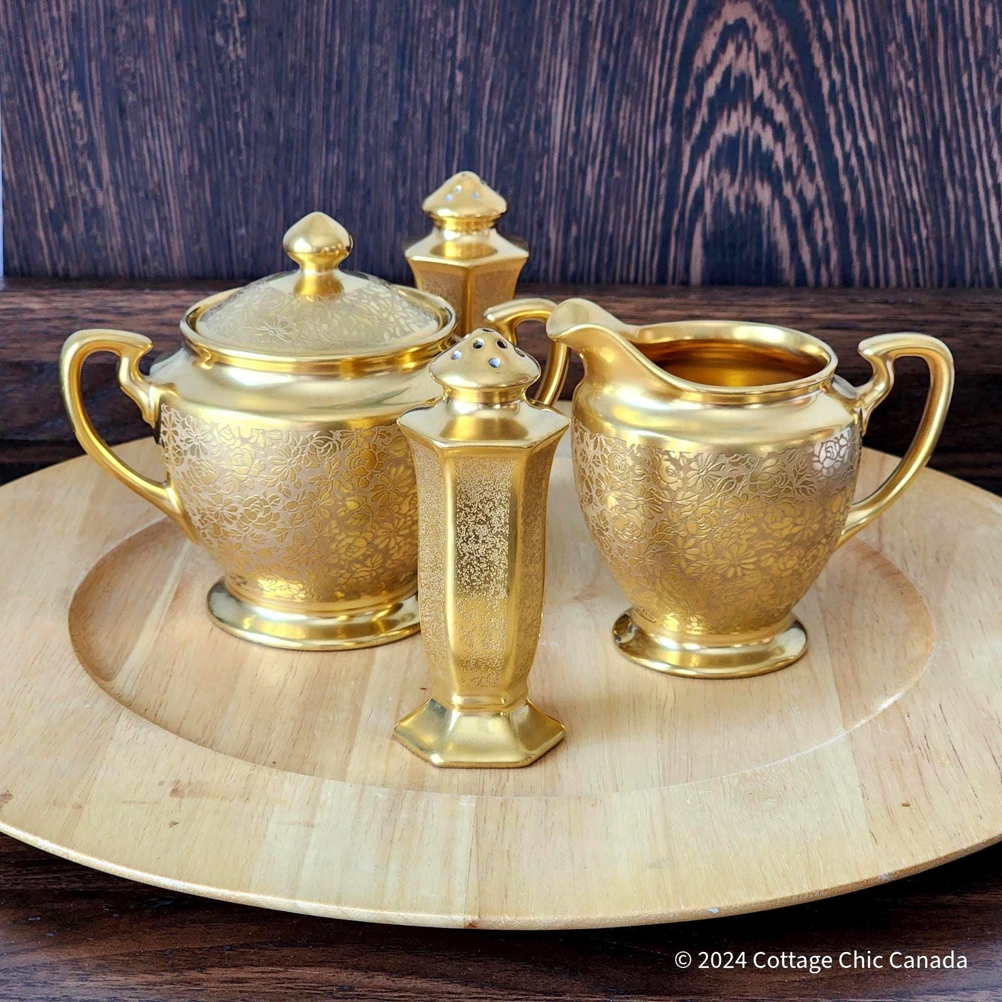 Pickard 24K Gold Creamer, Sugar, Salt & Pepper Set – 1930s Vintage Art Deco USA