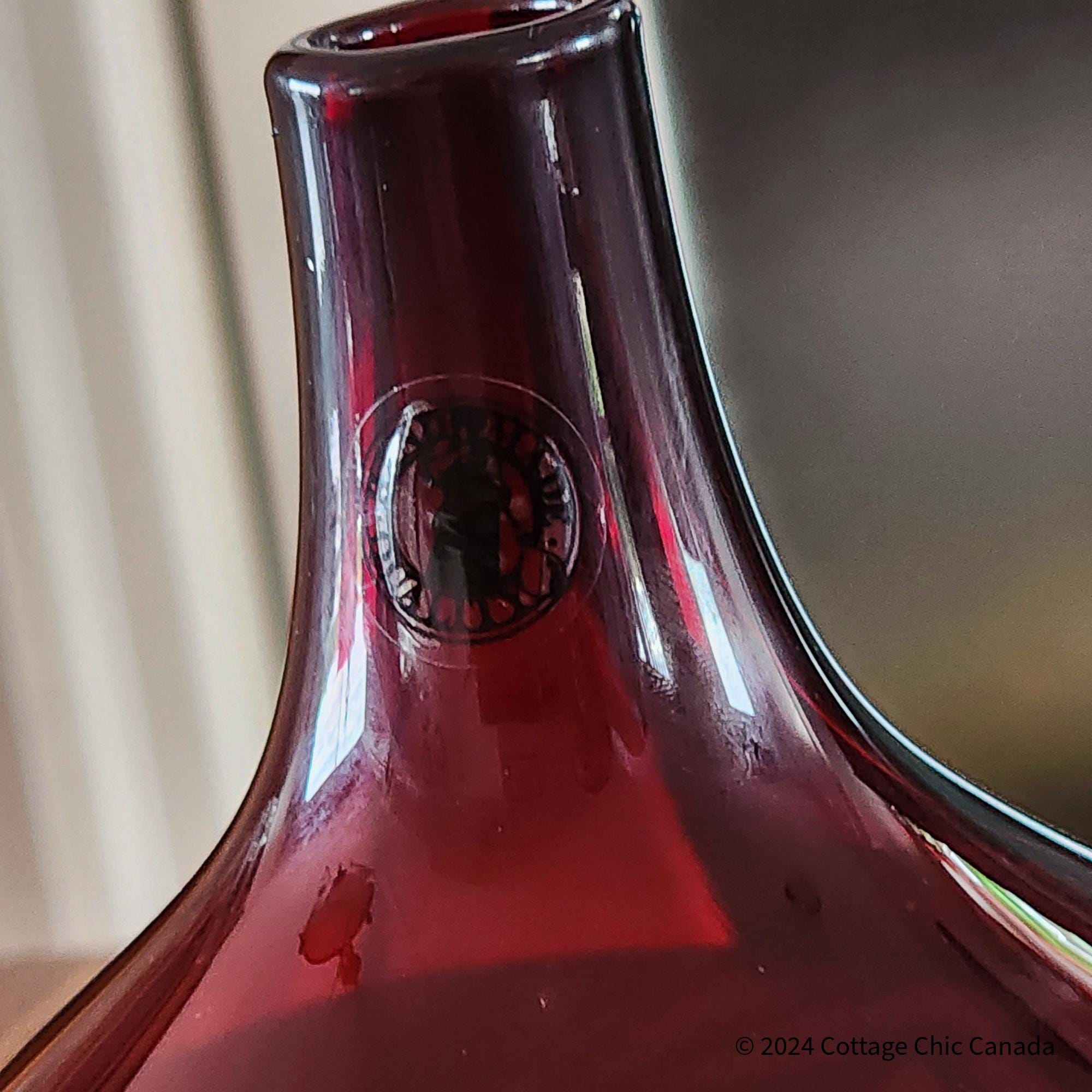 A rare IKEA Salong vase designed by Johanna Jelinek, complete with its original “Handmade Quality” sticker. This hand-blown piece is a collectible example of mid-century-inspired Scandinavian design, prized for its craftsmanship and bold, ruby-red color.