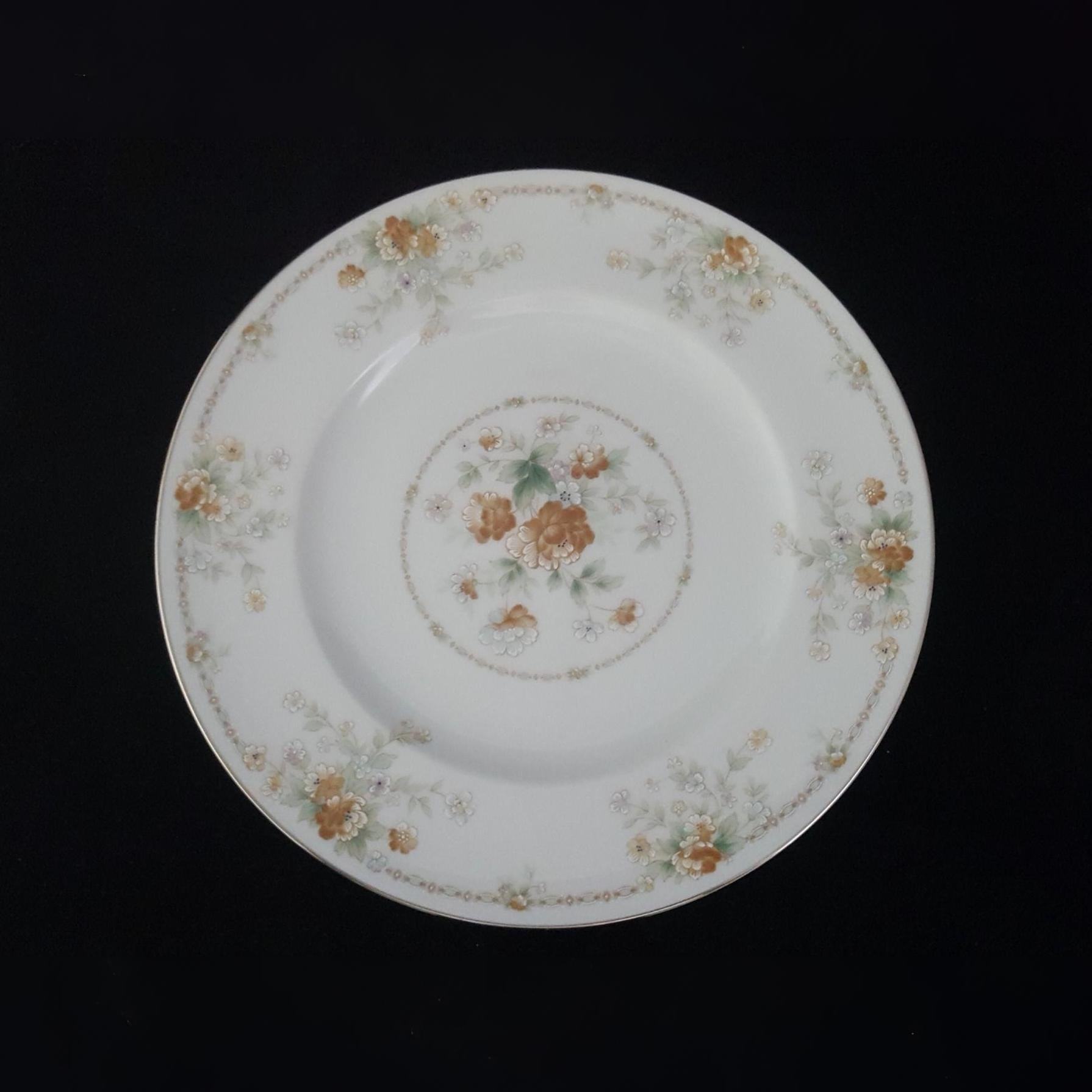 Noritake’s Roundelay pattern was produced between 1979 and 1984 and reflects the brand’s late-20th-century approach to refined tableware. The delicate bouquet garland in muted tan and blue tones, accented with platinum trim, captures the understated sophistication characteristic of 1980s fine china. Dinner plates from this pattern are especially sought after by collectors and replacement buyers due to their versatility and durability.