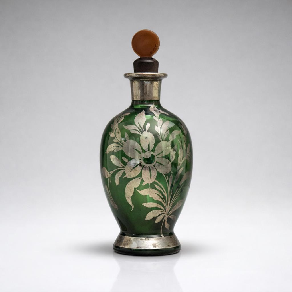 • Mold blown green glass with silver overlay; sterling content unconfirmed