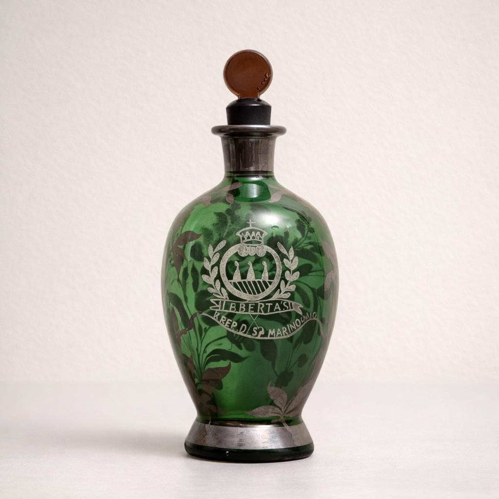 A mid century hand decorated green glass decanter featuring a silver overlay of the San Marino coat of arms with the “Libertas” motto, framed by floral detailing and finished with a mounted collar and base. Inspired by Art Nouveau botanical motifs, the richly toned glass lends depth and elegance to bar carts, sideboards, or curated entertaining displays. The stopper present is a replacement and fits securely.
