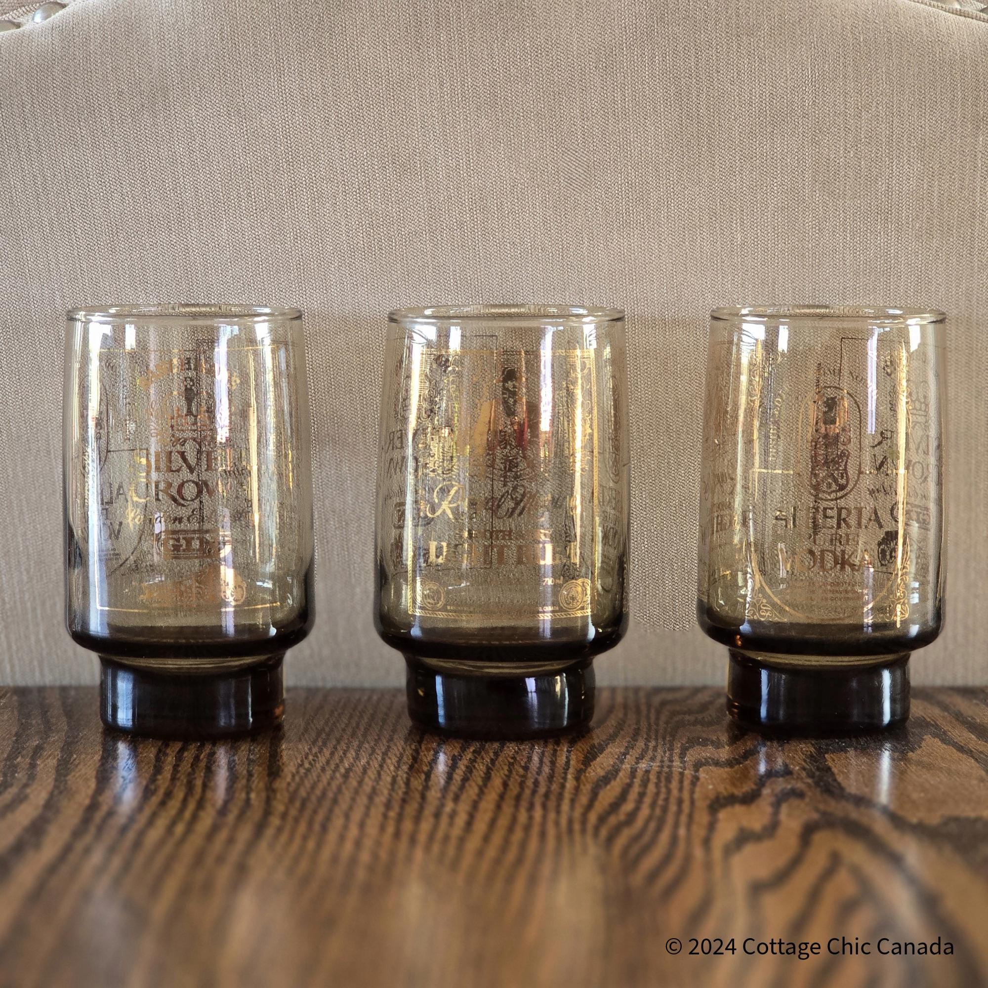 A striking set of three promotional bar glasses from Canada, each crafted in warm smoked-brown glass and detailed with gleaming gold-embossed liquor labels that wrap around the sides. Heavy-bottomed and well-balanced, each holds approximately 710 ml (25 fl oz).
