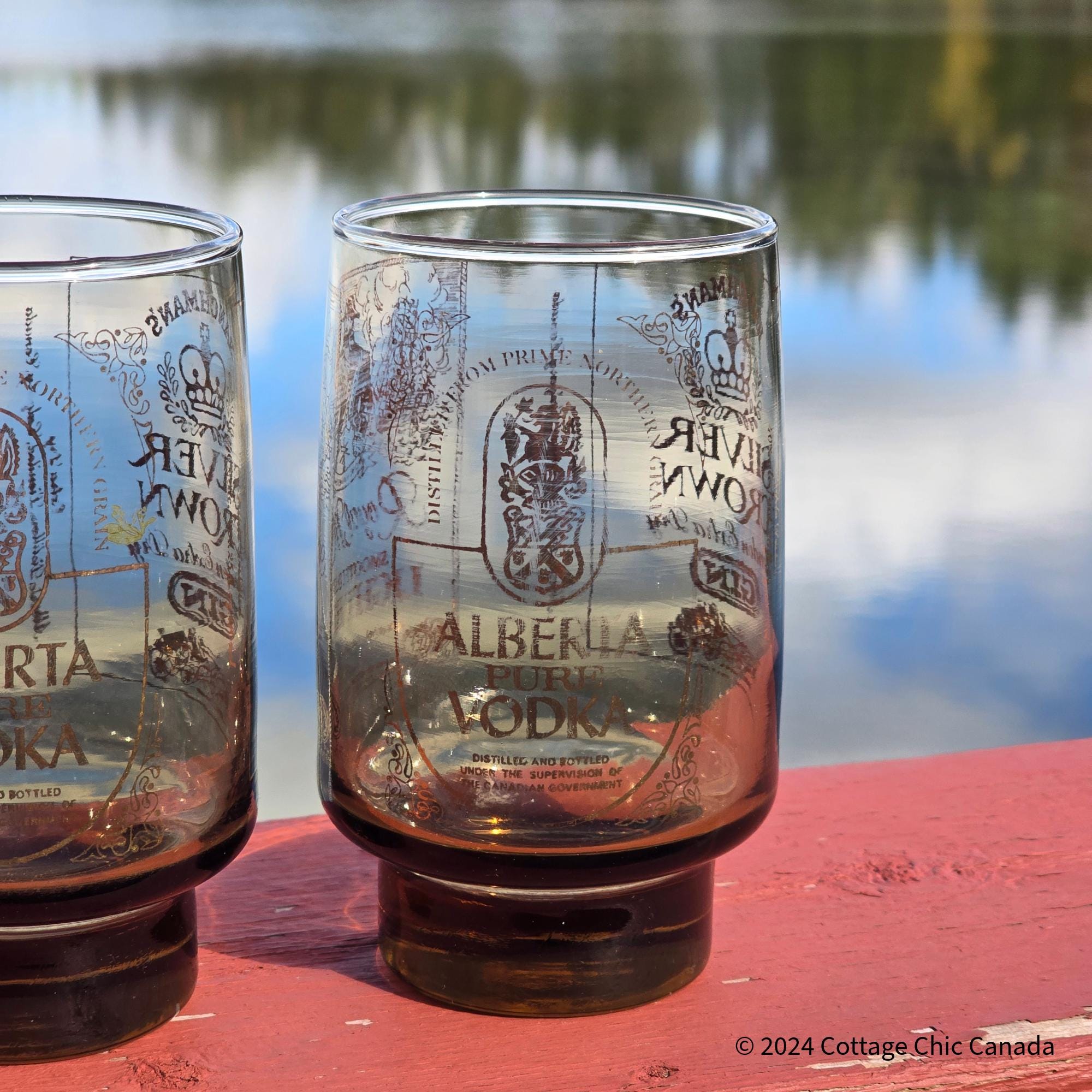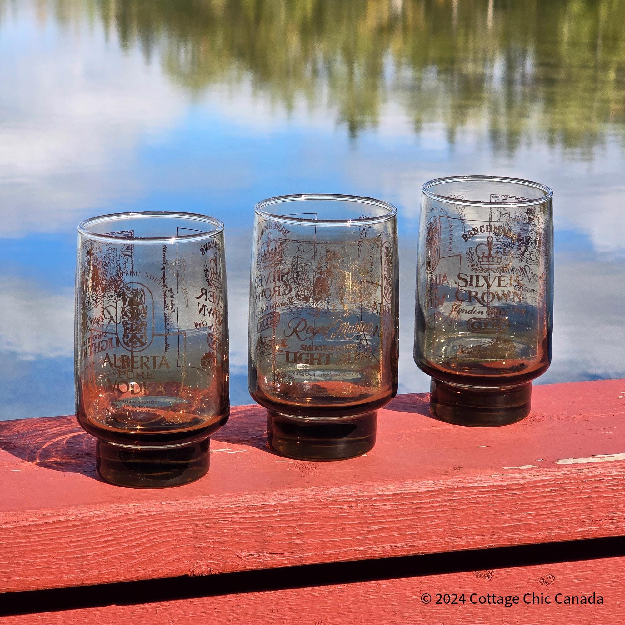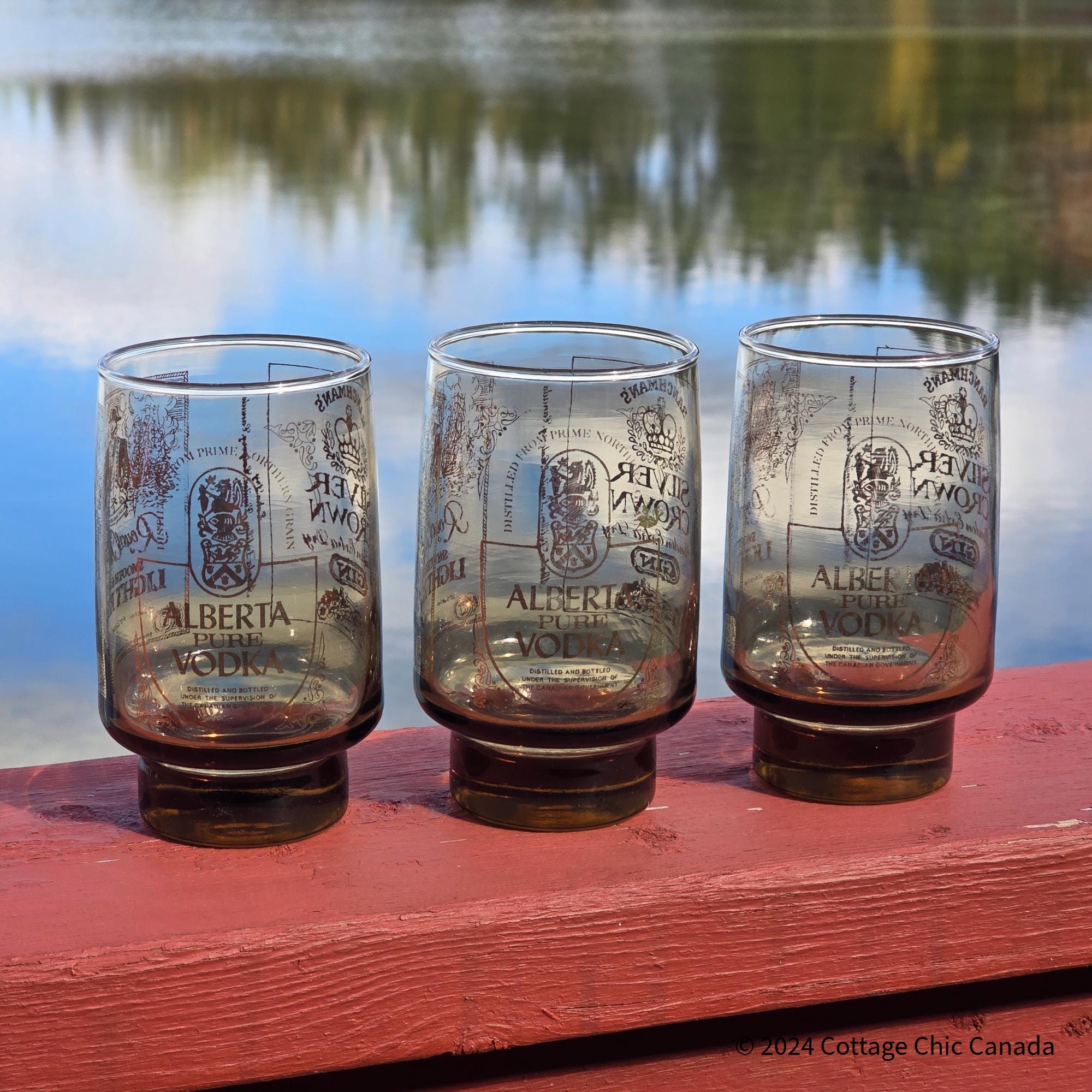 A mid-century toast to vintage Canadiana: three smoked-brown bar glasses with rotating gold-embossed liquor labels, Alberta Pure Vodka, Royal Mark Light Rum, and Silver Crown Gin. Perfect for cocktails, beer, or display in a retro-inspired home bar.