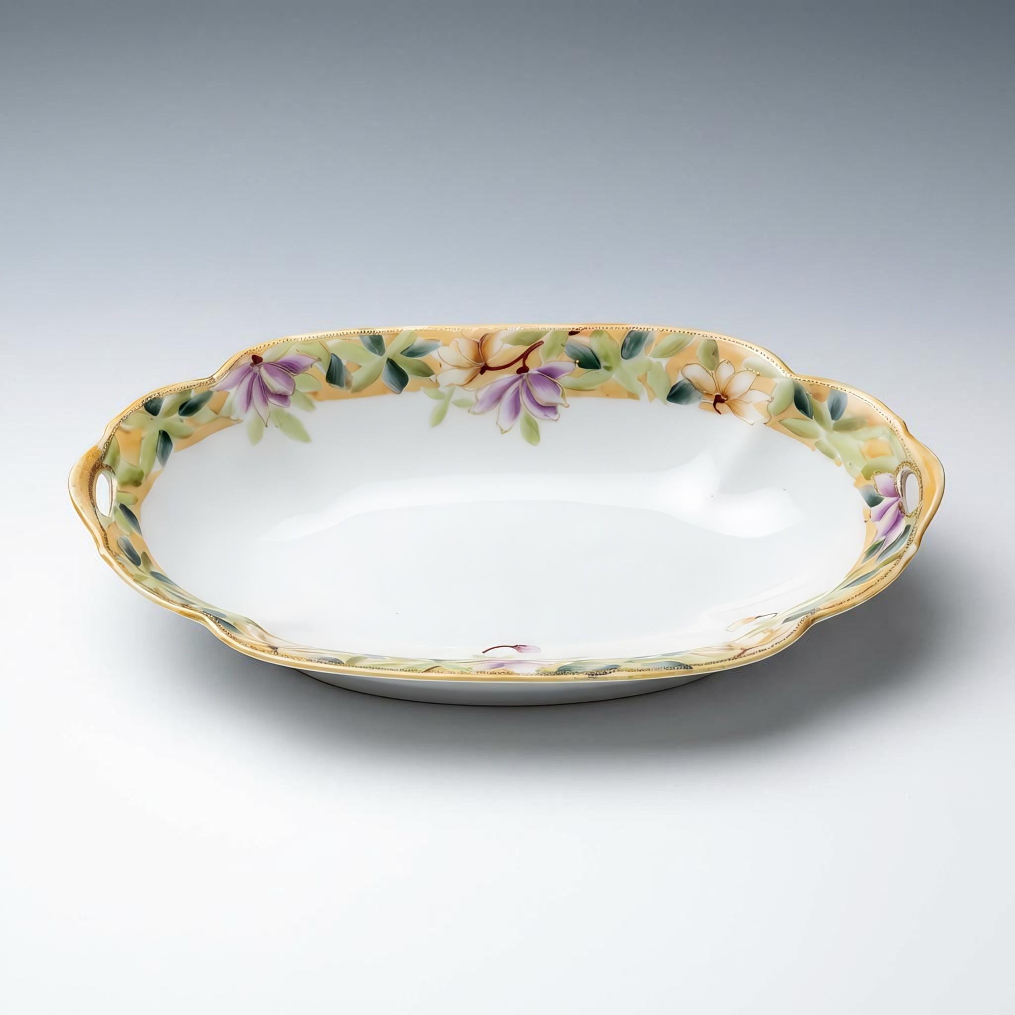 A hand-painted antique Morimura Nippon relish dish from the early 1900s, featuring soft pastel florals and a scalloped edge accented with raised gold beading. This elegant oval porcelain piece exudes Art Nouveau charm and is perfect for serving small snacks, candies, or condiments, or simply as a decorative accent in a cabinet, on a vanity, or as part of a vintage tablescape. In excellent vintage condition with no chips or cracks, it makes a graceful addition for collectors or anyone who loves vintage floral china.